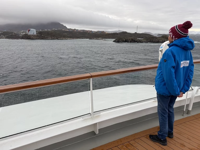 Unsere Ankunft in Sisimiut war für ca. 12:00 Uhr vorgesehen. Bis dahin war Zeit für die Einkleidung mit Parka und Gummistiefeln. Weiterhin stand die für alle Passagiere die obligatorische Zodiac-Sicherheitseinweisung durch den Staff-Kapitän auf dem Programm. Damit war der Vormittag auch schon komplett verplant. Die See hatte sich auch wieder etwas beruhigt und wir konnten die Nase mal in den Wind halten und das Anlegemanöver in Sisimiut beobachten.