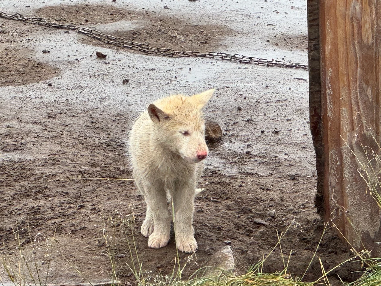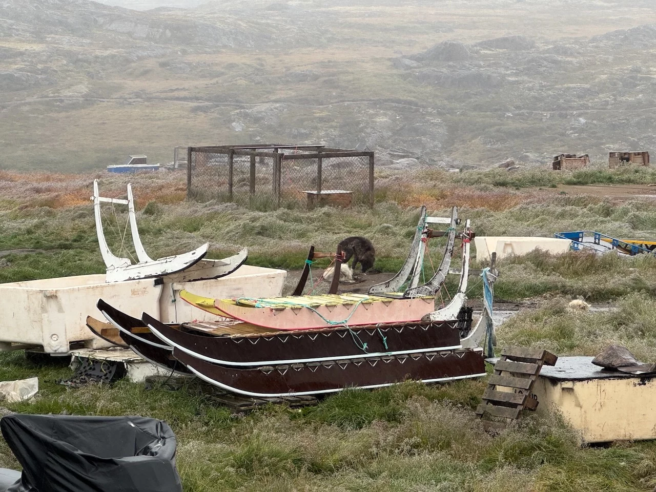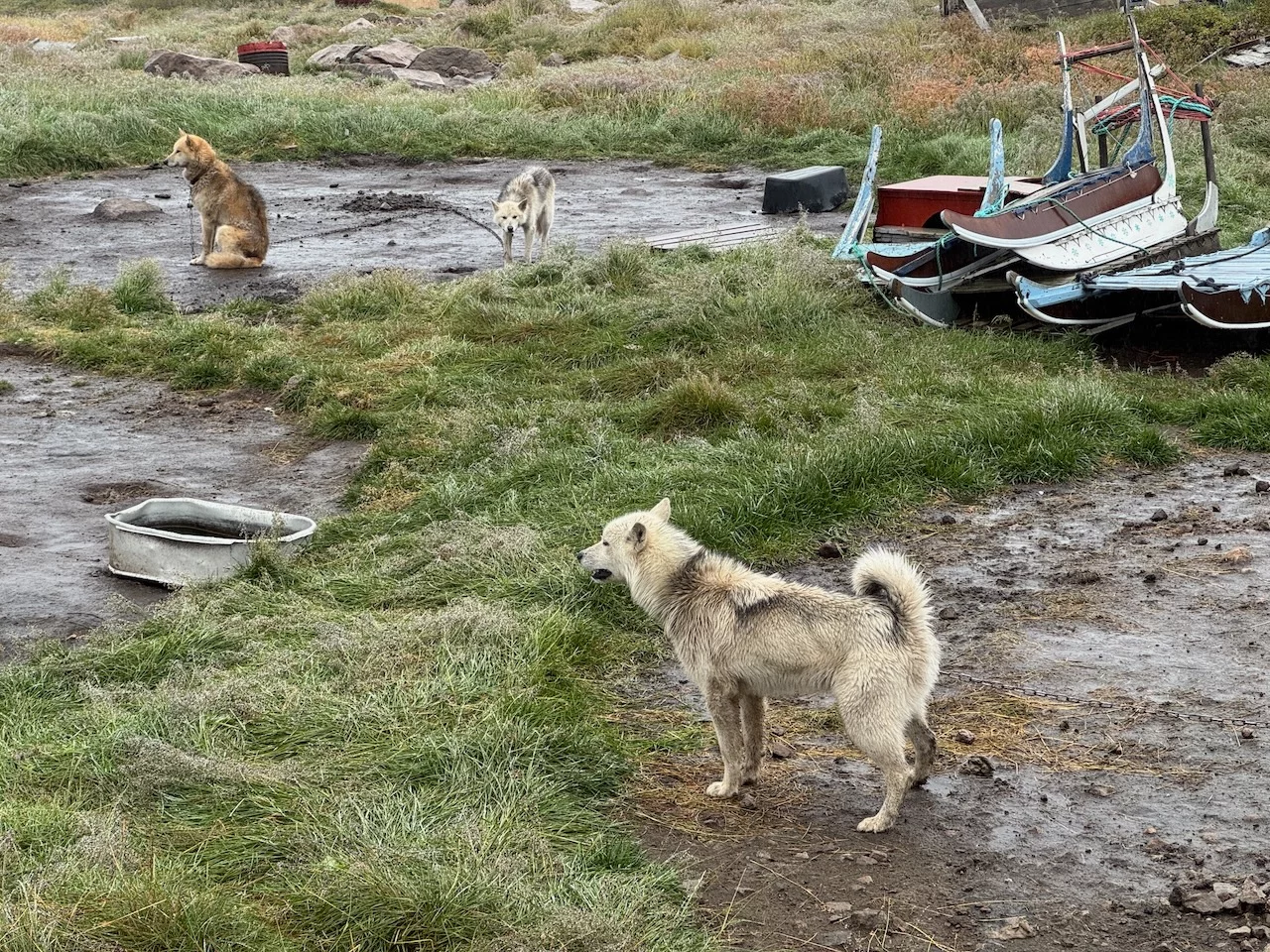 Nach dem Mittagessen sind wir dann aber doch noch einmal für einen kurzen Ausflug losgezogen. HLC hatte einen Shuttle-Bus organisiert. So konnten wir den überwiegenden Teil unserer „Exkursion“ trocken hinter uns bringen. Ein interessanter Stop war am östlichen Ende des Ortes das sogenannte Tal der Schlittenhunde. Hier werden über das ganze Gebiet verteilt ca. 5000 Schlittenhunde von verschiedenen Besitzern gehalten.