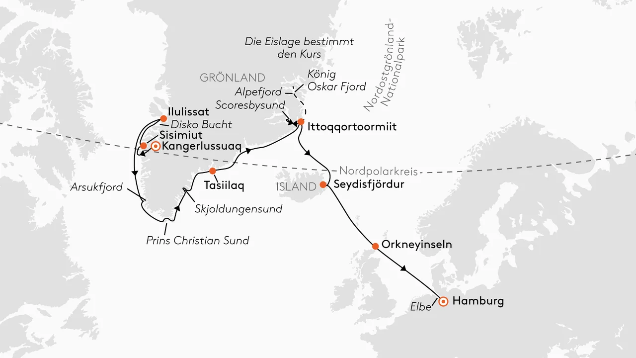 Danach geht es um die Südspitze Grönlands herum entlang der Ostküste nach Norden, so weit wie Eislage und Zeit es zulassen. Die geplante Route sieht so aus:
