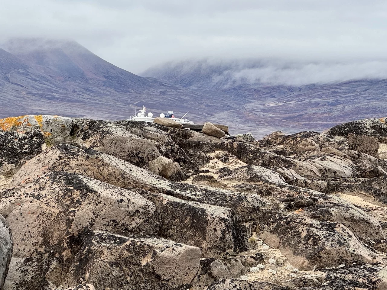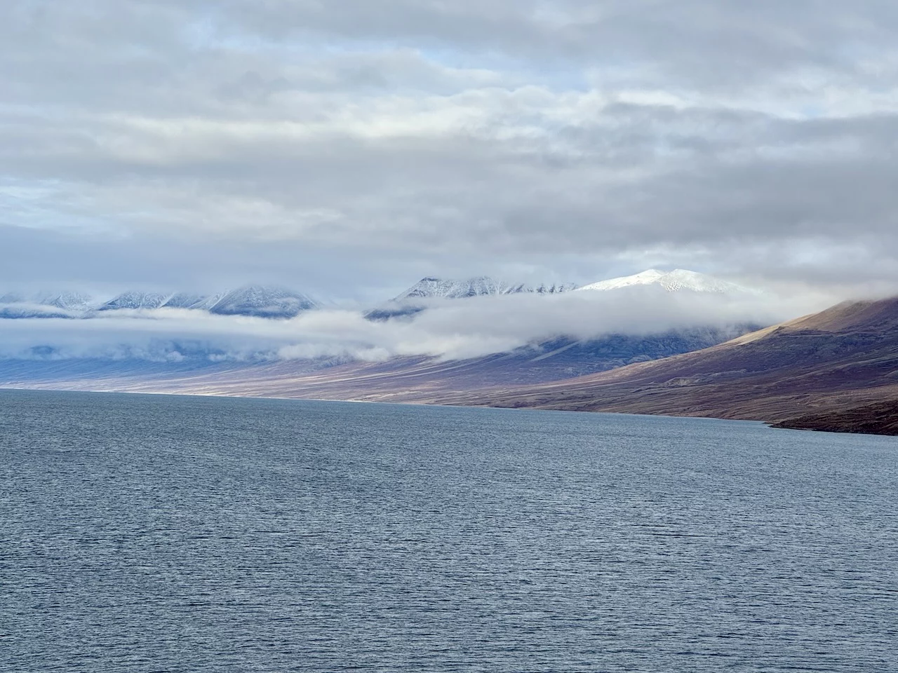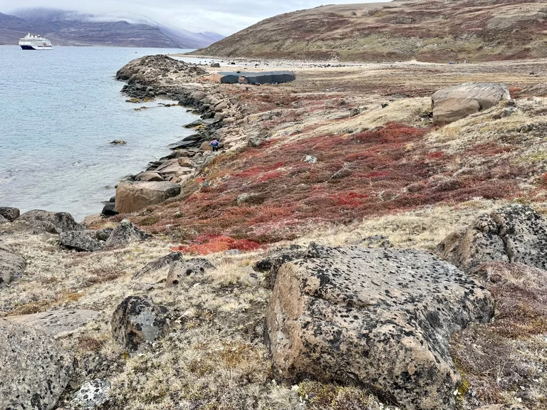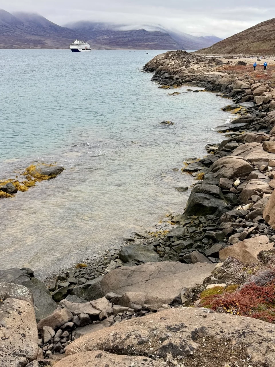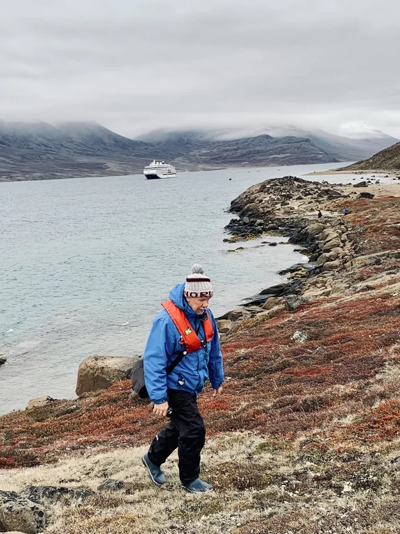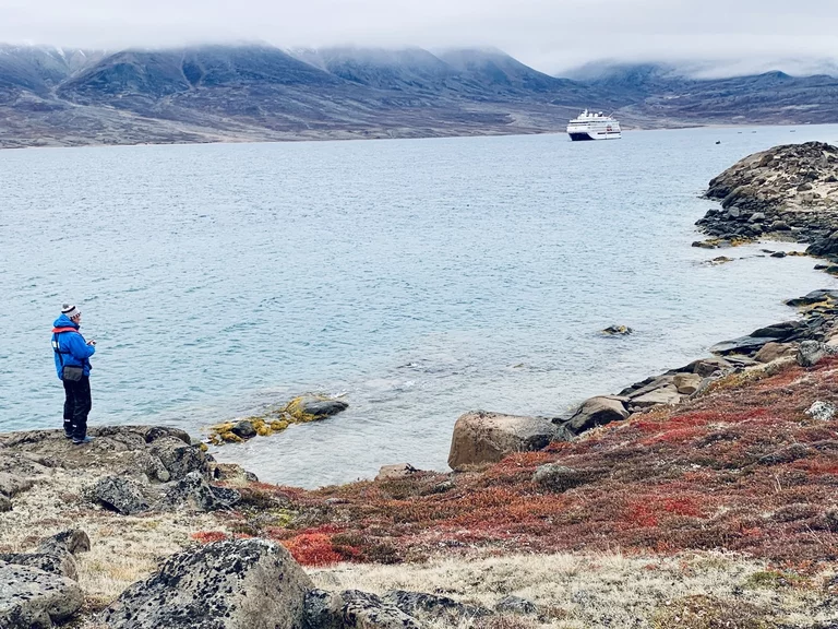 Nach der kurzen Einweisung durch Expertin Sarah bei der Ankunft an Land konnten wir losziehen und uns innerhalb eines durch 7 (!!) Eisbär-Wächter abgegrenzten Gebiets frei bewegen. Auch hier hat uns die Natur der Tundra trotz der frühen Stunde wieder in ihren Bann gezogen. Die Ausblicke auf den von hohen, steil aufragenden Bergen eingerahmten Sund werden nie langweilig. Man hat die Entstehungsgeschichte unseres Planeten direkt vor Augen.