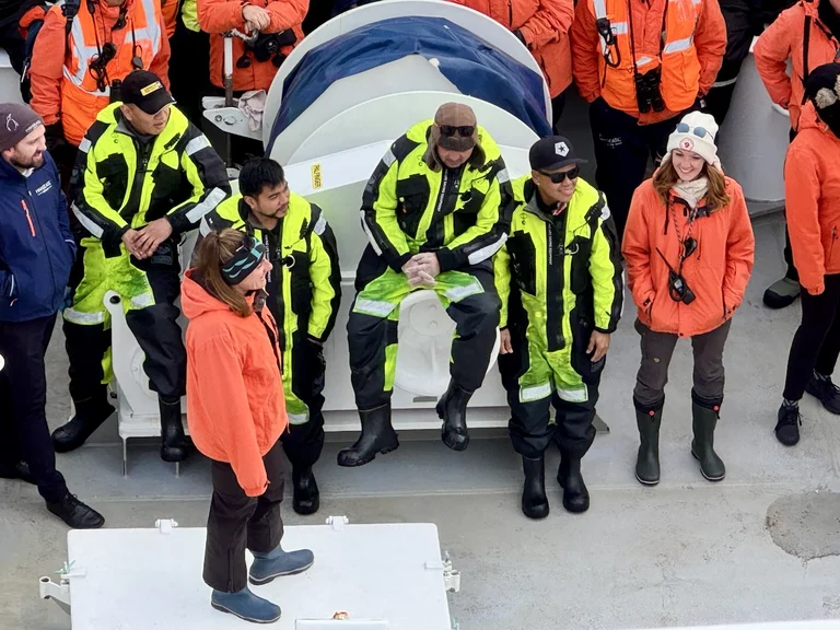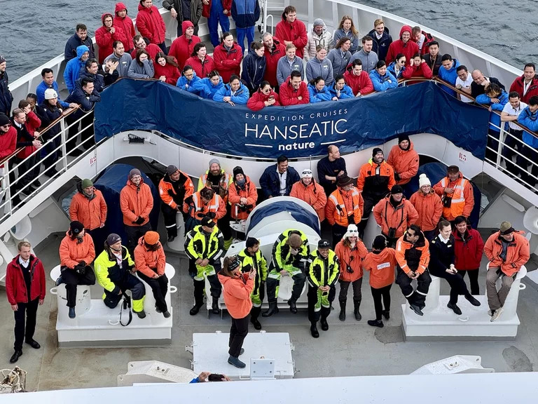 Der Vega Sund in Ostgrönland war leider unsere letzte Station im arktischen Fjordland. Am späten Vormittag hieß es Abschied nehmen von Grönland. Die Crew versammelte sich auf dem „Nature Walk“ um die traditionellen Crew-Fotos zum Ende der Arktisreisen aufzunehmen.
