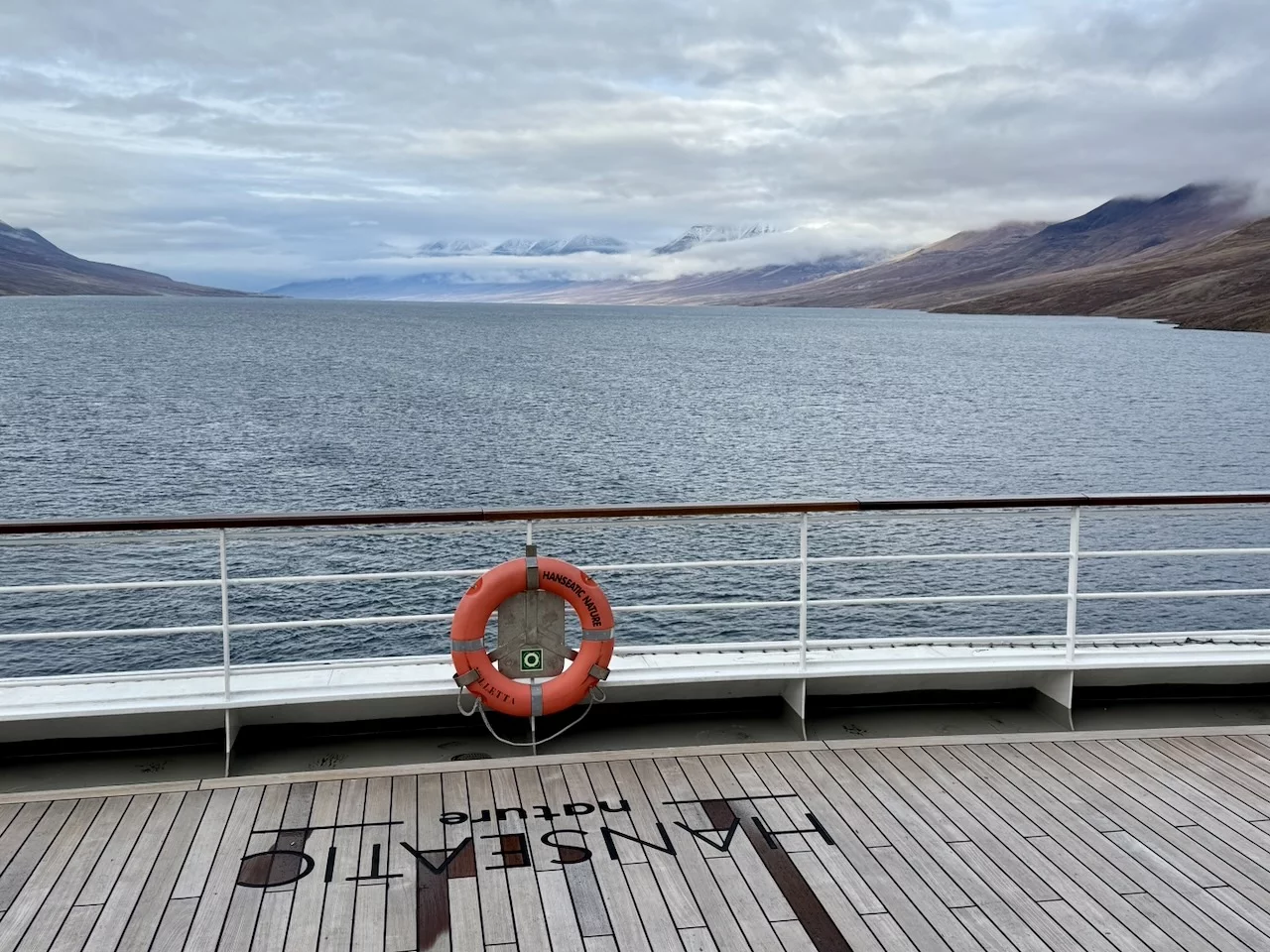 Kurz danach hielt der Kapitän seine letzte „Morgenpredigt“ in der Arktis für diese Saison. Leider enthielt sie, was die Überfahrt nach Island anging, keine guten Nachrichten. Etwas nördlich von uns entwickelt sich ein starkes Sturmsystem mit zu erwartenden Wellenhöhen bis zu 10 Metern und Windstärke 9-10. Es bleibt uns nur, mit Vollgas vor dem Sturm zu flüchten und hoffen, dass er uns nicht einholt. Ob das geklappt hat berichten wir morgen!!! Vorsichtshalber wurden auf den Fluren aber schonmal die ersten Vorkehrungen getroffen.