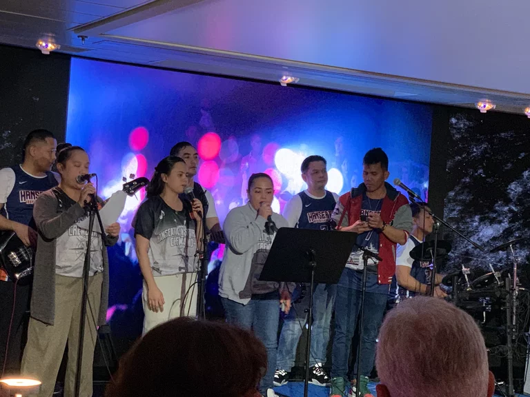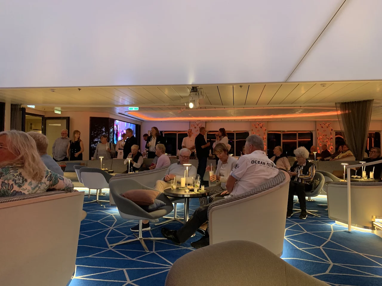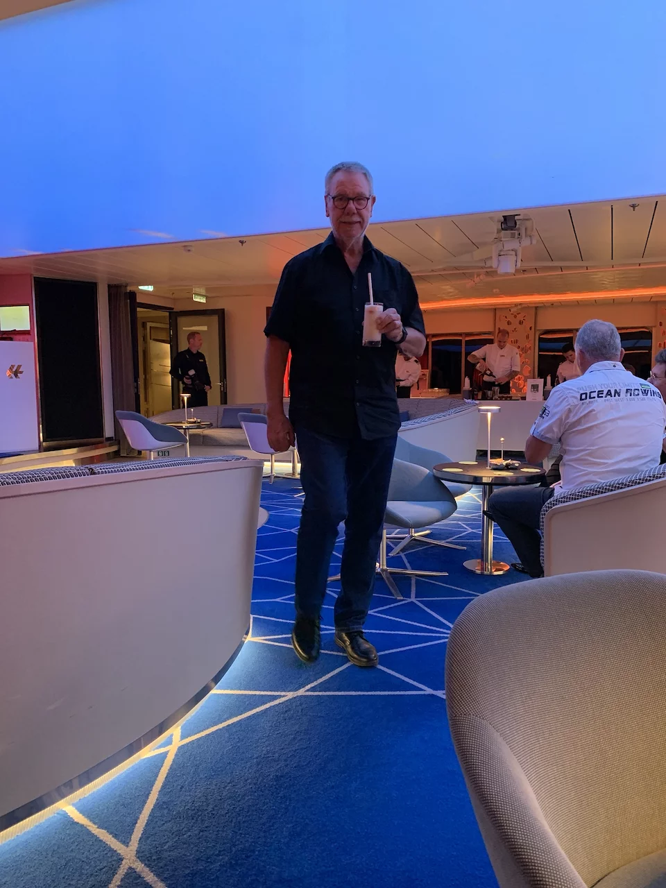 Nach dem Abendessen stand im HanseAtrium das schon traditionelle “Offiziere mixen Cocktails” an. Dazu “rockte” die Hanseatic inspiration Crew Band. Die Mitglieder der Band sind Hobby-Musiker und kommen aus allen Bereichen des Schiffes.