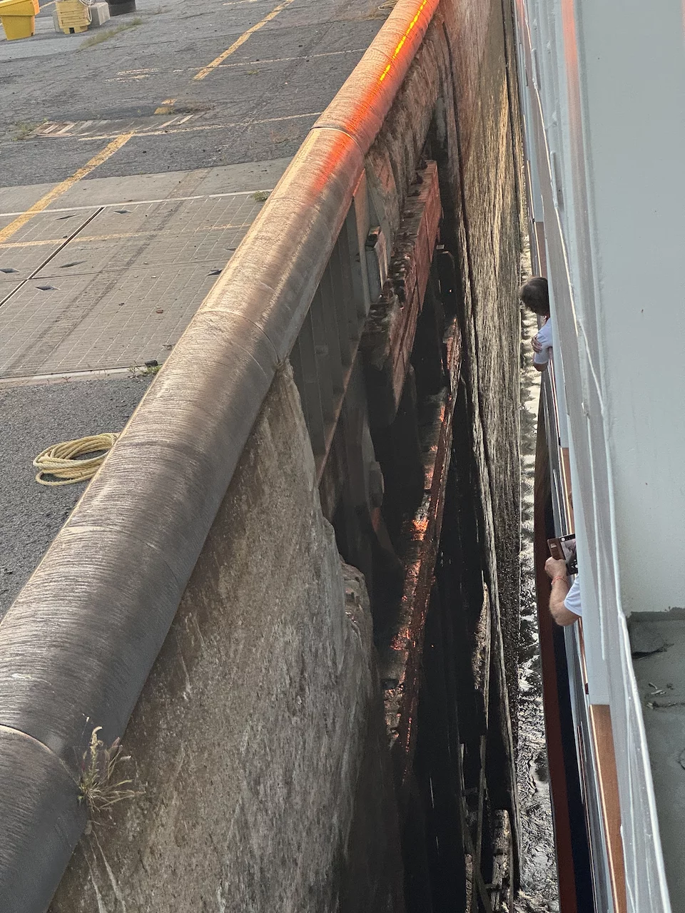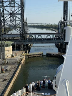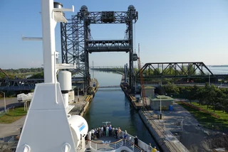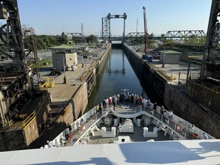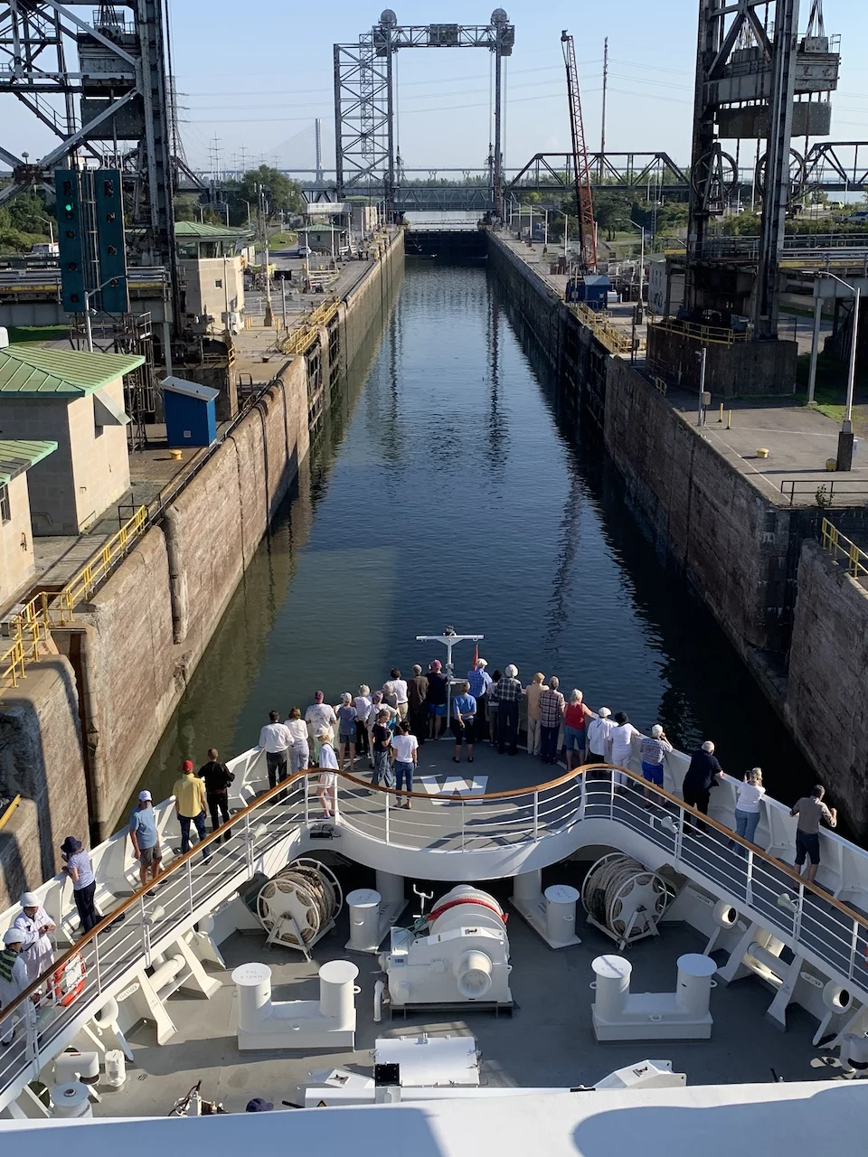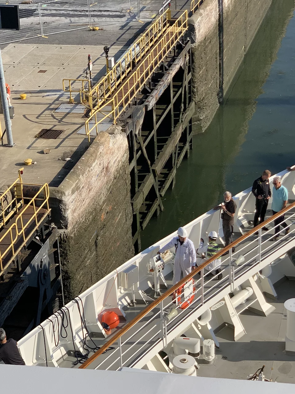 Tatsächlich kam der Lotse auch wie angekündigt um 14:30 und wir konnten unsere Fahrt Richtung Schleuse in Saint Lambert fortsetzen. Diese Schleuse hat einen Hub von 5 Metern und ist damit auch die “kleinste” in dieser Hinsicht. Die weiteren Schleusen liegen bei einem Hub von etwa 10-12 Metern. Es ist schon faszinierend zu sehen, wie präzise die Brückencrew die Inspiration in die Schleusenkammer manövrierte. Es ist wirklich kaum Platz auf beiden Seiten.