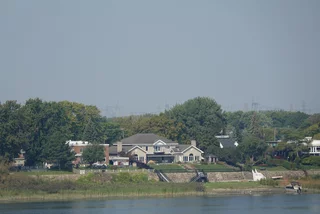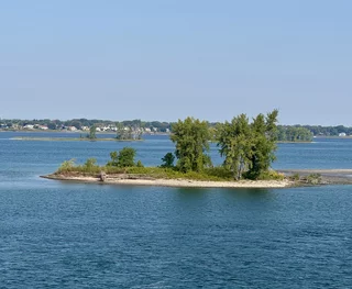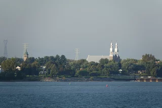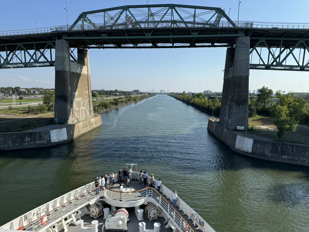 Als wir das nächste Mal die Augen öffneten, stand die Sonne schon am Himmel. Die Wettervorhersage war also korrekt, denn die hatte einen sonnigen und warmen Tag versprochen. Der Vormittag war überwiegend dem Anblick der vorbeiziehenden Landschaft gewidmet. Mit langsamer Fahrt zwischen 6 und 9 Knoten zog die Inspiration ihr Spur in das Wasser des Sankt-Lorenz-Stroms. Gegen Mittag sollten wir die Saint Lambert Schleuse, die erste von sieben Schleusen, erreichen. Allerdings kam gegen 10:00 Uhr die Durchsage vom Käpt’n, dass sich die Ankunft des Schleusen-Lotsen bis 14:30 Uhr verzögert und wir an unserer momentanen Position bis dahin vor Anker gehen müssten. Es kam aber auch gleich der beruhigenden Zusatz, dass so etwas öfter vorkommt und deshalb in unserem Fahrplan entsprechende Pufferzeiten eingebaut sind.