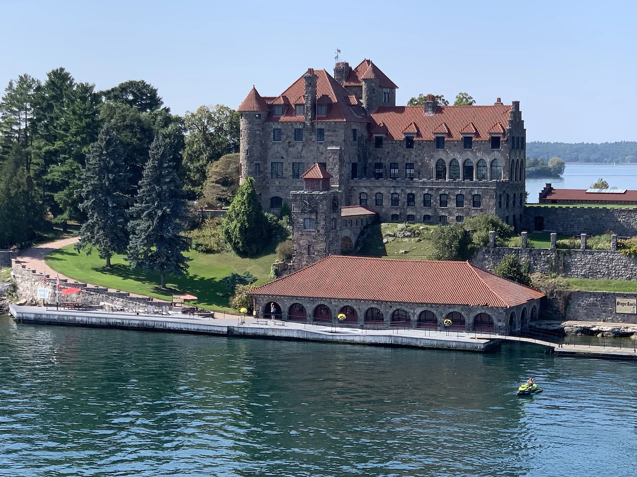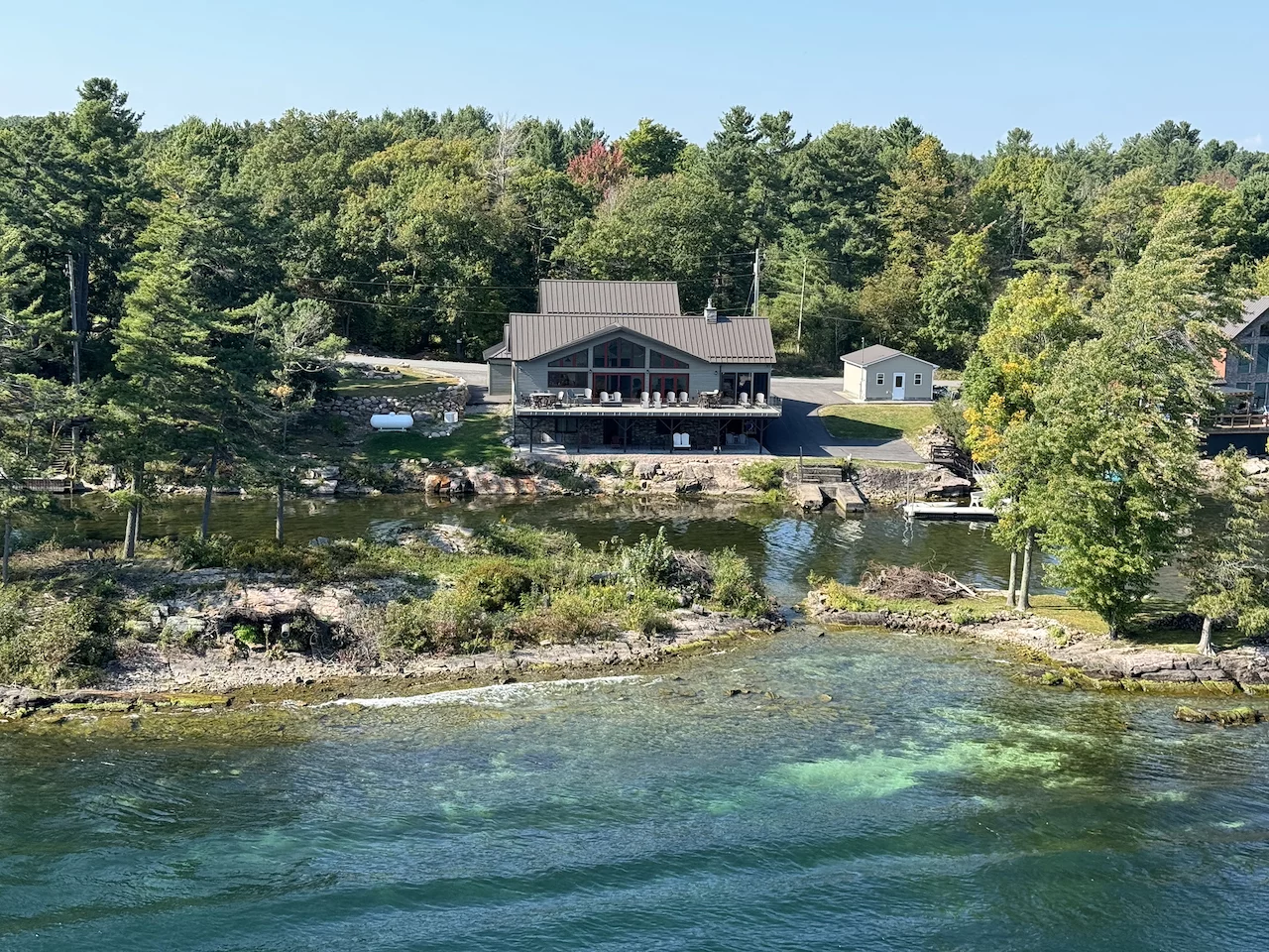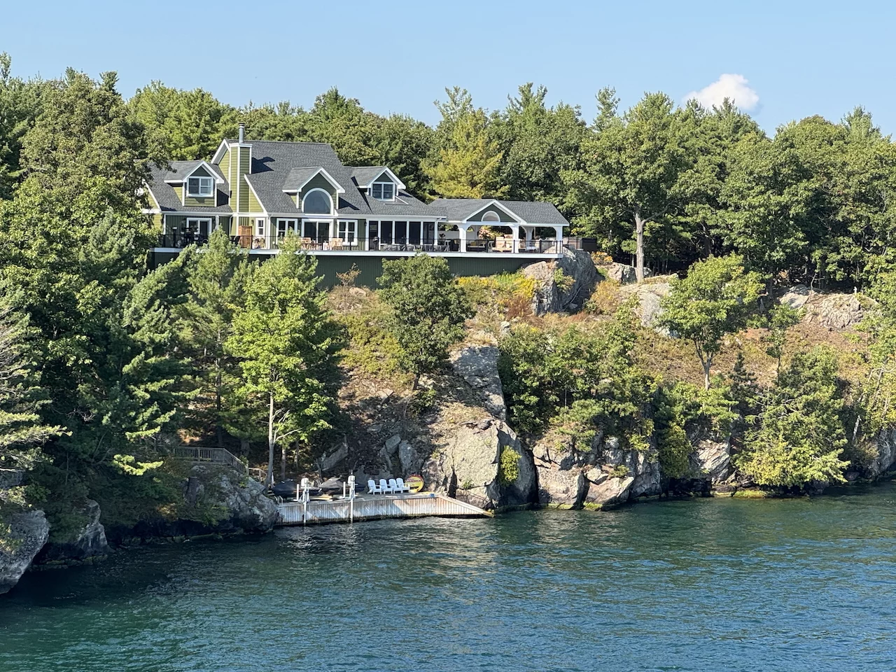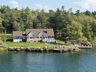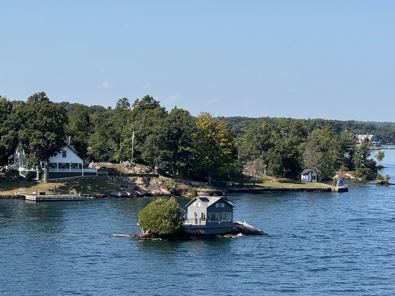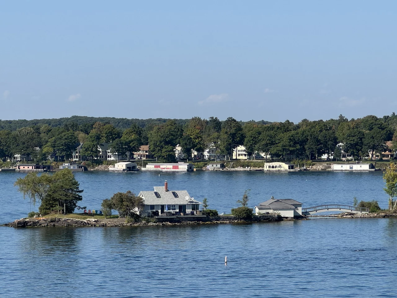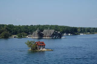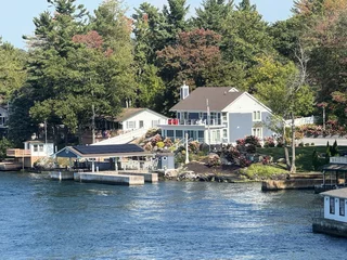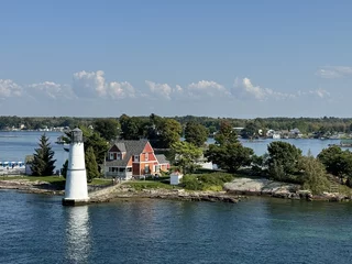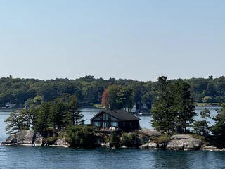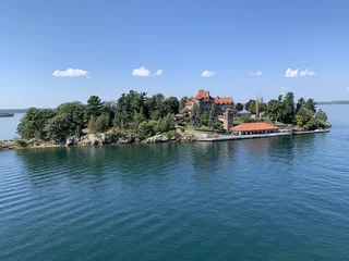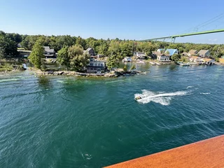 Über den heutigen Tag gibt es nicht viel zu berichten. Wir haben einfach nur diese traumhafte Fahrt durch das Gebiet "Thousand Islands" im Sankt-Lorenz-Strom genossen. Nichts als purer Sonnenschein, Hapag Lloyd Verwöhnprogramm und eine vorbeiziehende Landschaft, die einen aus dem Staunen nicht mehr herauskommen läßt. Auf den nächsten 75 Kilometern 1864 große und kleine, bebaute und unbebaute Inseln. Viele davon bestückt mit den tollsten Villen und Wochenendhäusern, natürlich immer mit Bootsanleger und Parkplatz für den Jetski. Wer eine sichtbare Definition für das Wort Dekadenz sucht, hier ist er richtig!!!