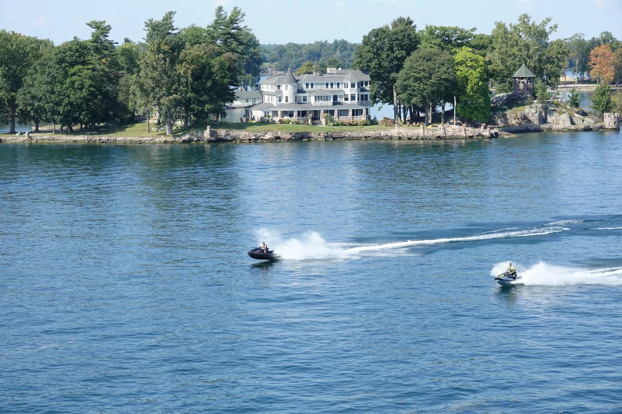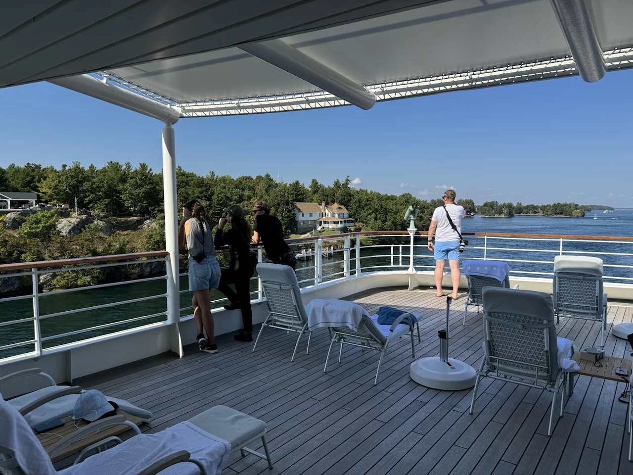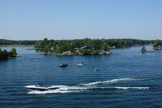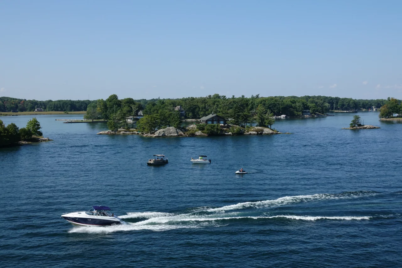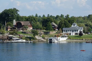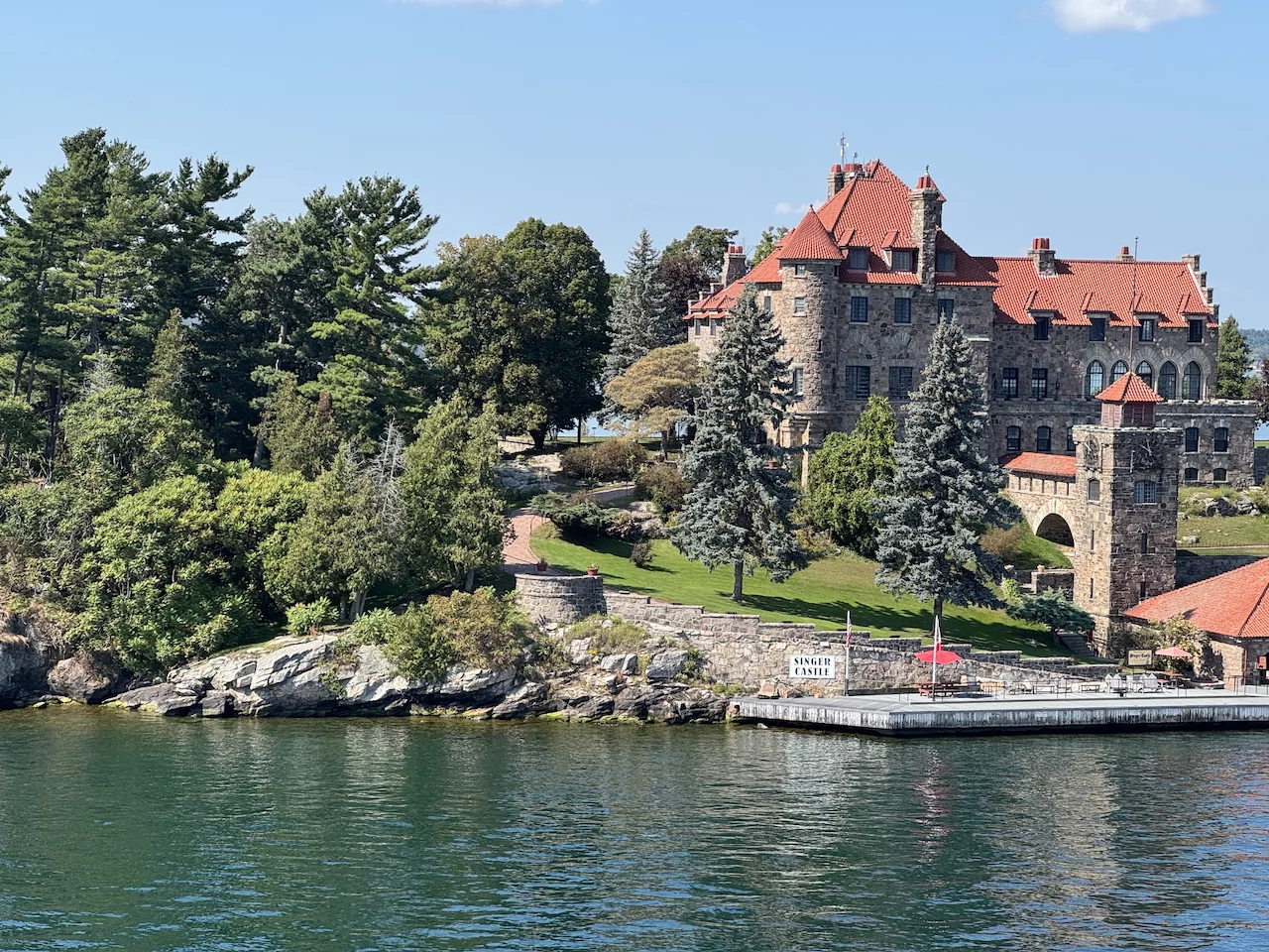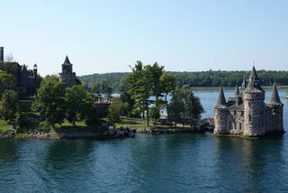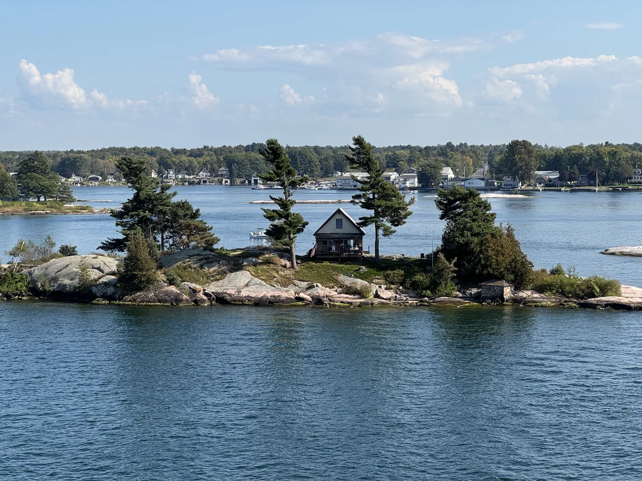 Über den heutigen Tag gibt es nicht viel zu berichten. Wir haben einfach nur diese traumhafte Fahrt durch das Gebiet "Thousand Islands" im Sankt-Lorenz-Strom genossen. Nichts als purer Sonnenschein, Hapag Lloyd Verwöhnprogramm und eine vorbeiziehende Landschaft, die einen aus dem Staunen nicht mehr herauskommen läßt. Auf den nächsten 75 Kilometern 1864 große und kleine, bebaute und unbebaute Inseln. Viele davon bestückt mit den tollsten Villen und Wochenendhäusern, natürlich immer mit Bootsanleger und Parkplatz für den Jetski. Wer eine sichtbare Definition für das Wort Dekadenz sucht, hier ist er richtig!!!