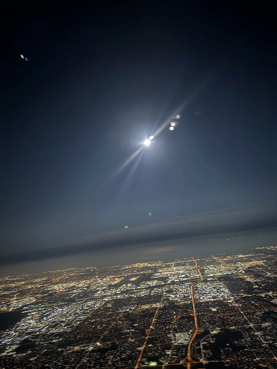 Beim Start in Toronto hat Lottchen auf einem Foto nicht nur die hellerleuchtete Stadt, sondern auch noch den Vollmond "erwischt. Der Landeanflug in der gerade aufgehenden Sonne über Amsterdam war ebenfalls besonders schön anzusehen.