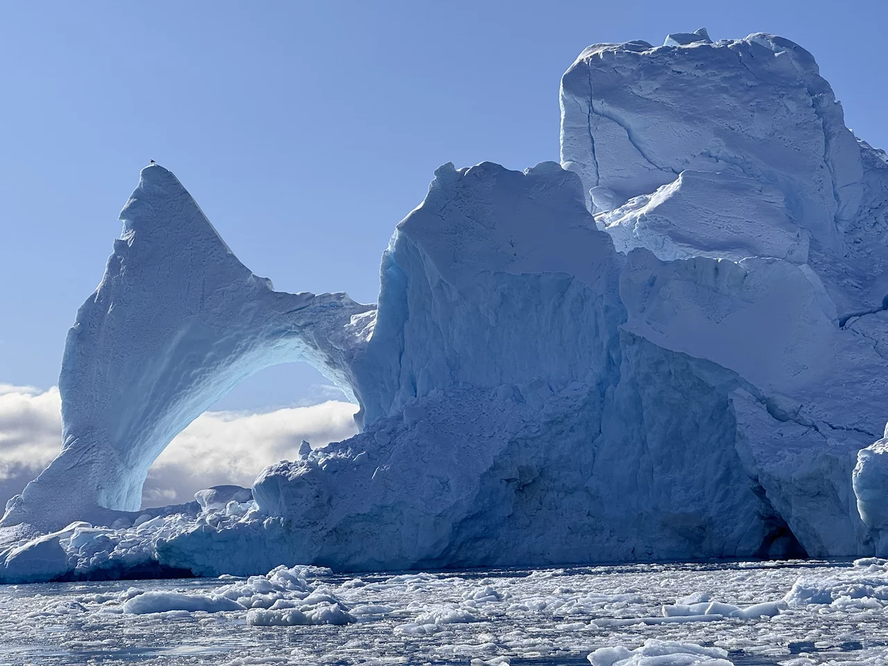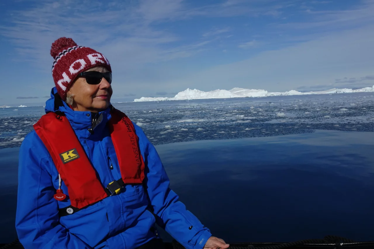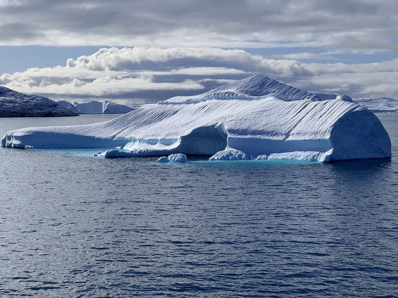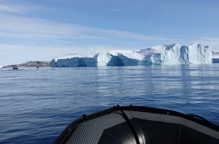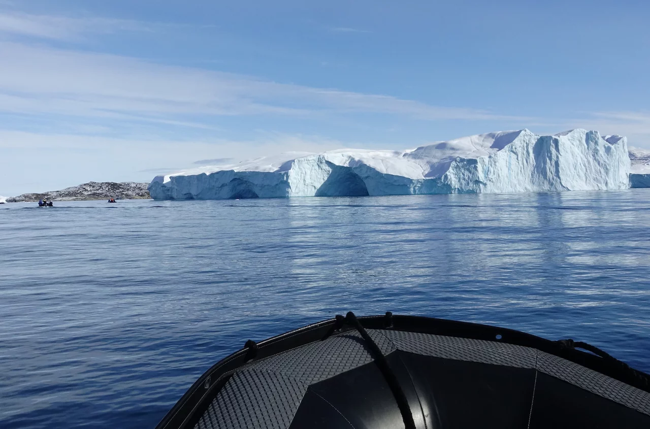 Den zweiten Teil dieses spektakulären Tages bildete eine Zodiac-Rundfahrt zwischen den schwimmenden Riesen aus Eis in der Disko Bucht. Und auch diesmal spielte der Wettergott mit und platzierte an dem blauen Himmel über der Bucht viele schöne weiße Wölkchen. Ein optischer Hochgenuss, den zu beschreiben es wirklich schwer fällt. Hatten wir gedacht, dass die faszinierenden Bilder vom Vormittag eigentlich nicht zu überbieten sind, wurden wir nochmal eines Besseren belehrt.