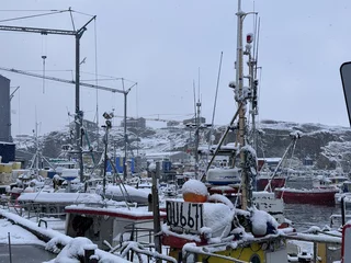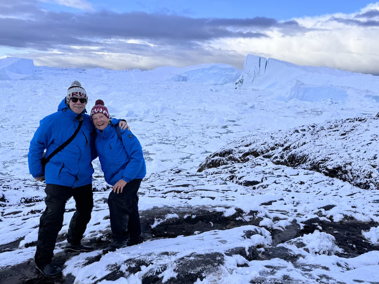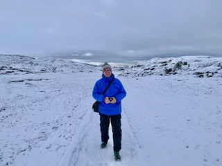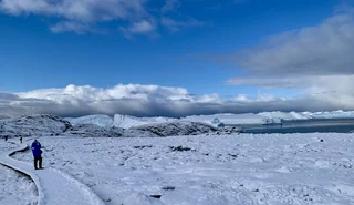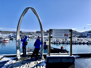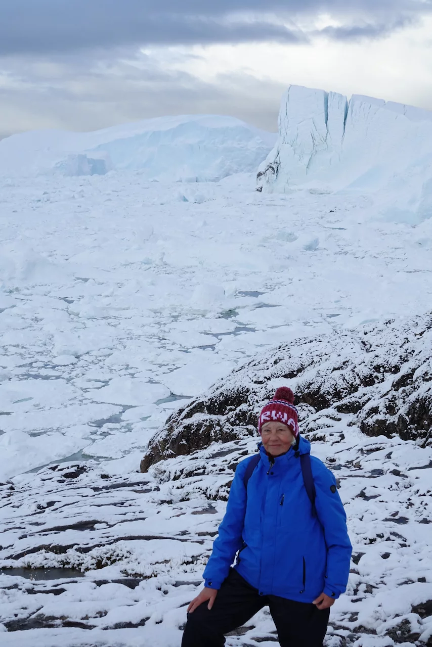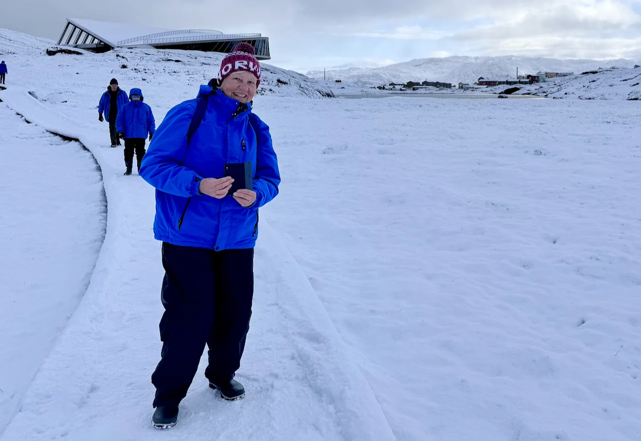 Der Weg von der Stadt zum Eisfjord führte zunächst mit einem Shuttlebus zum Eisfjord-Besucherzentrum. Von dort führt ein ca. 1km langer Holzsteg bis zum Aussichtspunkt. Dieser Fußweg ist über eine farbenprächtige Vegetation gebaut, die gerade um diese Jahreszeit in voller Blüte steht (Indian Summer). Dummerweise hatte es in der Nacht aber heftig geschneit und die herbstliche arktische Farbenpracht war zu einer “weißen Wüste” geworden. Was die Wanderung zum Fjord zu einer ziemlich rutschigen Herausforderung machte, zumal es am Ende doch ziemlich steil über Stock und Stein ging. Doch der faszinierende und spektakuläre Anblick dieser gewaltigen Eismassen entschädigte für jede Anstrengung!!