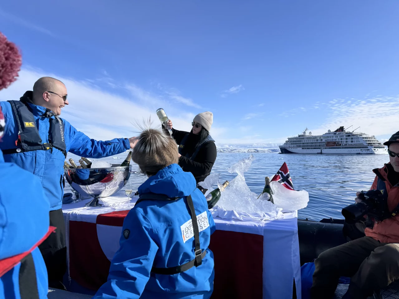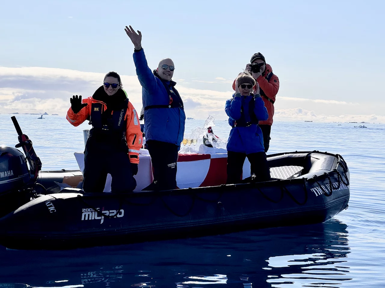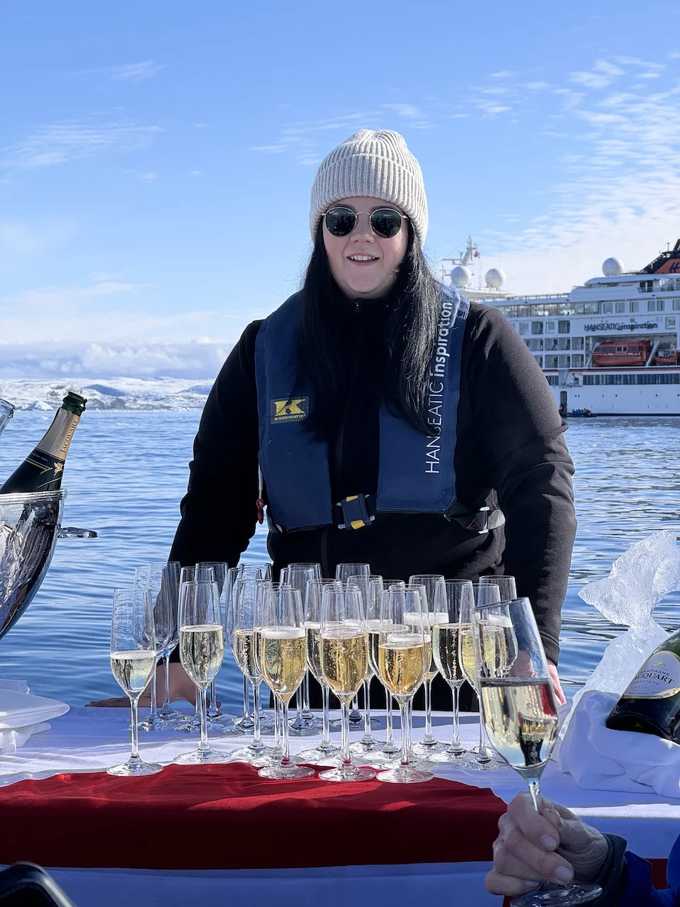 Am Ende der Rundfahrt wurden wir noch mit einem flüssigen Highlight bedacht, denn es erwartete uns bereits ein zu einer Champagner-Bar “umfunktioniertes” Zodiac. Die fürsorgliche Crew an Bord hatte schon die gefüllten Gläser parat, damit wir auf diesen wunderschönen und gelungen Tag gebührend anstoßen konnten.