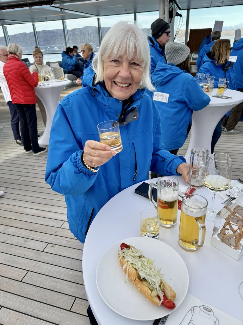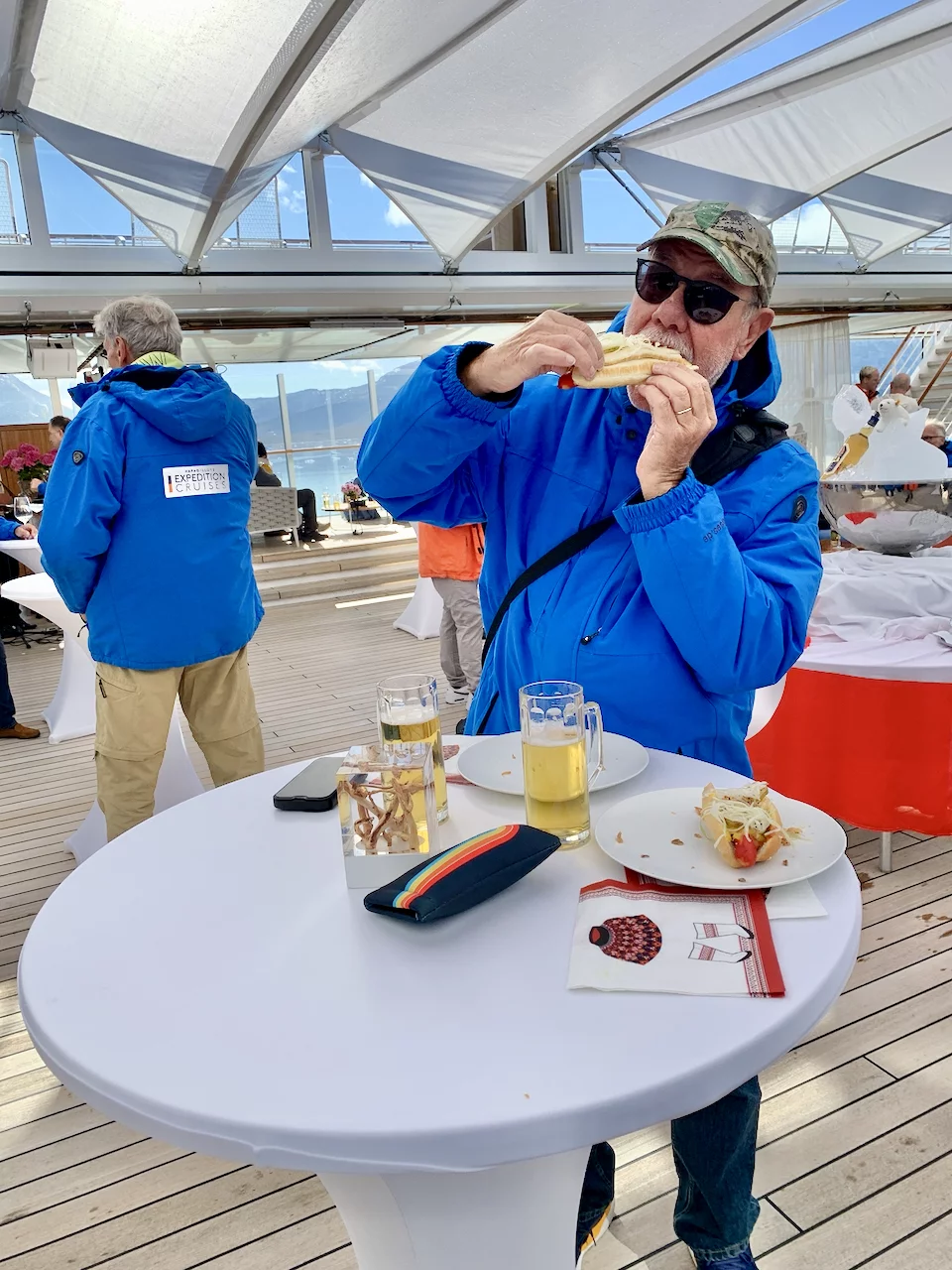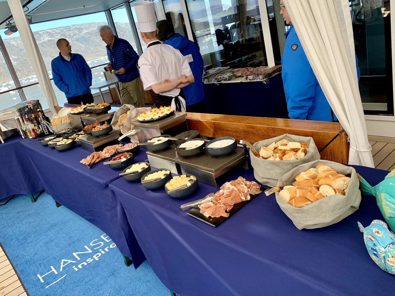 Das Mittagessen wurde heute als Pølser-Party zelebriert. Dänische Hot-Dogs und andere Schlemmereien am Pool Deck. Die Küchencrew schöpft aus dem Vollen und das Serviceteam reicht dazu die passenden Getränke (Bier, Wein, Champagner, mit Gletschereis gekühlter Aquavit, etc…). Müßig zu erwähnen, dass der Mittagsschlaf heute etwas länger ausfiel.
