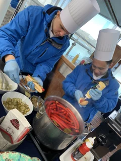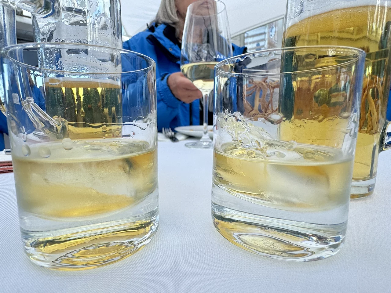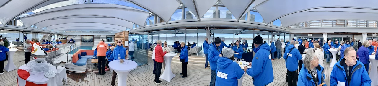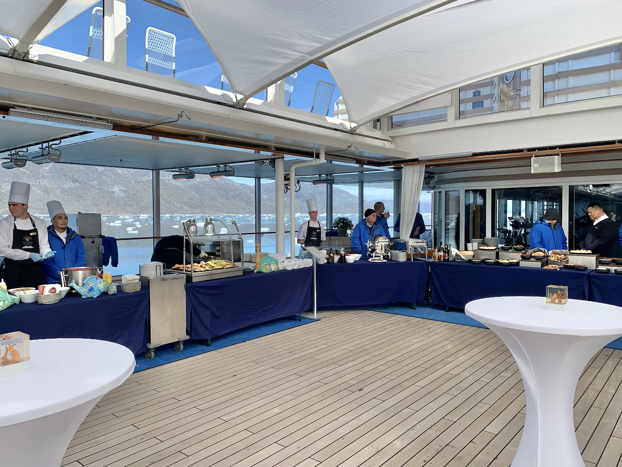 Das Mittagessen wurde heute als Pølser-Party zelebriert. Dänische Hot-Dogs und andere Schlemmereien am Pool Deck. Die Küchencrew schöpft aus dem Vollen und das Serviceteam reicht dazu die passenden Getränke (Bier, Wein, Champagner, mit Gletschereis gekühlter Aquavit, etc…). Müßig zu erwähnen, dass der Mittagsschlaf heute etwas länger ausfiel.