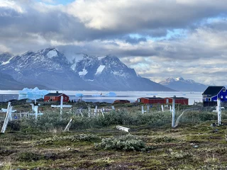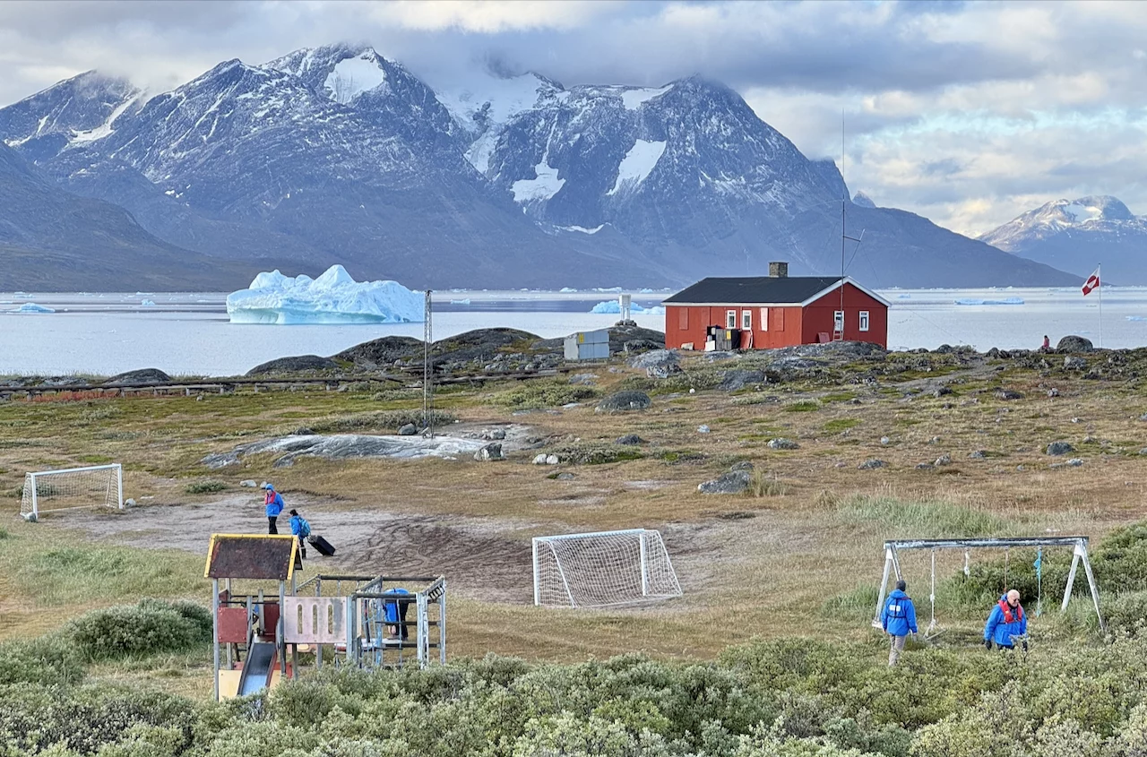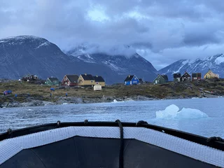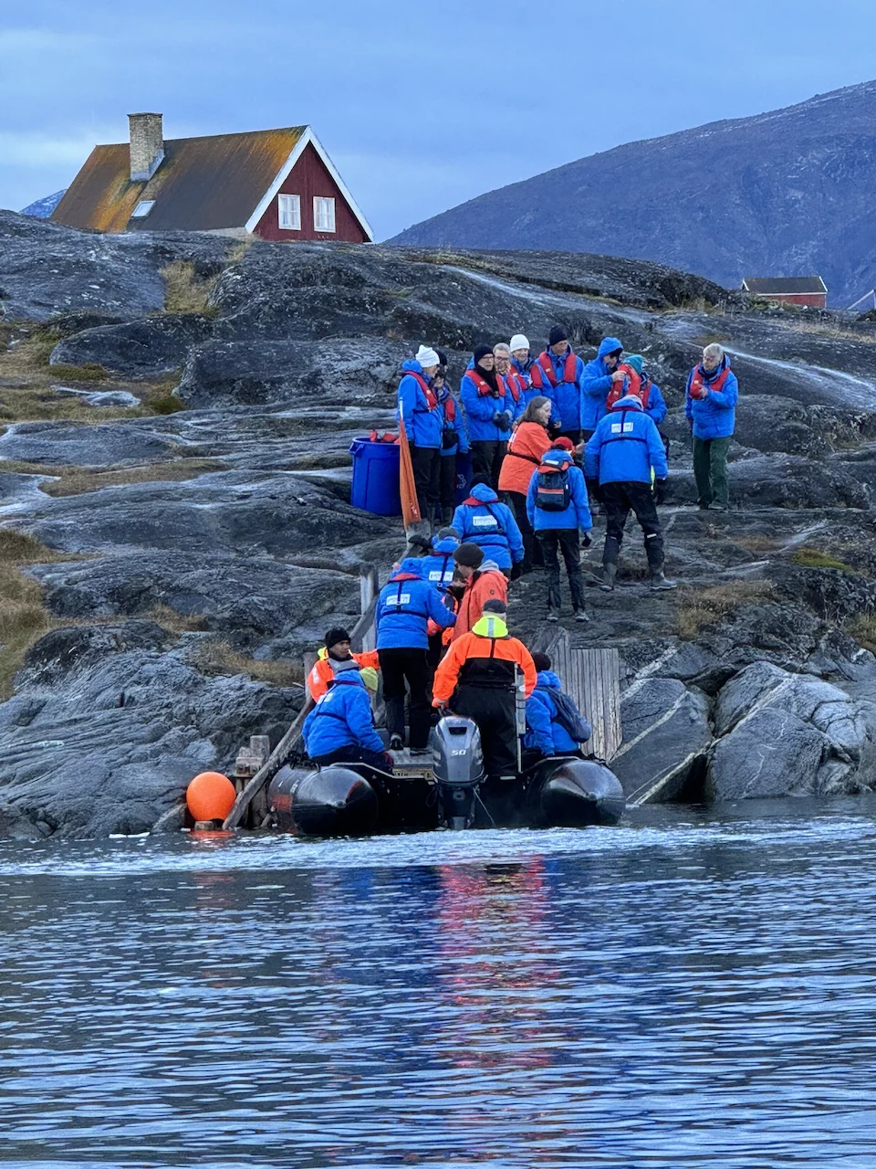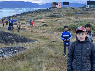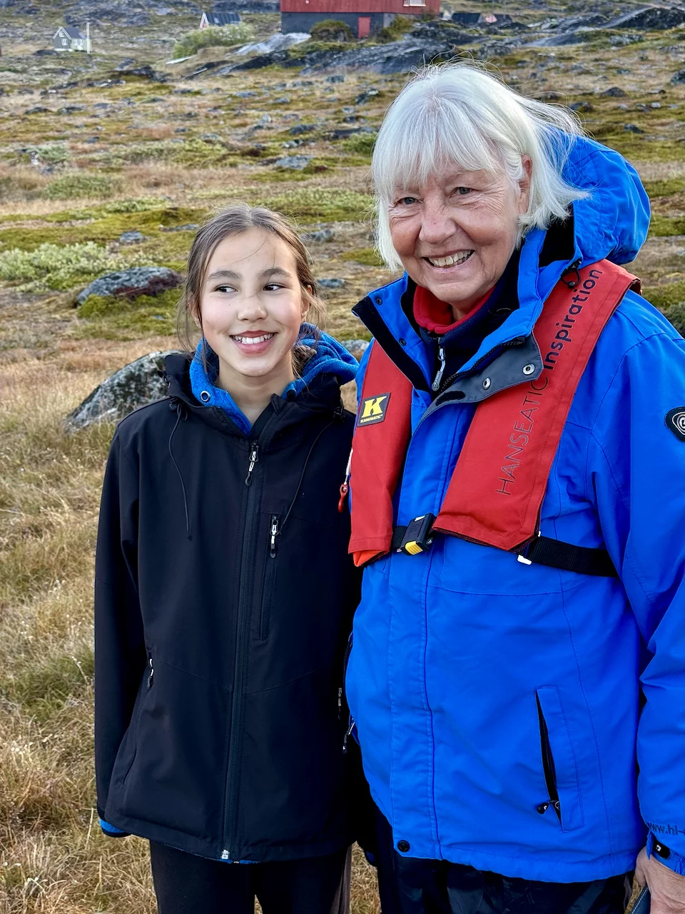 Qoornoq liegt tief in einem der zahlreichen Fjorde auf der kleinen Insel Bjoernoen und ist offiziell seit 1974 eine verlassene Siedlung. Das heißt, sie ist nicht mehr permanent bewohnt, jedoch nutzen die Einwohner von Nuuk, der Hauptstadt Grönlands, ca. 15 gut erhaltene Wohnhäuser im Sommer als Wochenenddomizil. Man findet noch die verfallenen Überbleibsel einer Fischfabrik. Außerdem werden 2 größere Häuser als Schul-Landheime genutzt und für die Schüler Sommer-Camps durchgeführt. Wie der Zufall es wollte, haben wir bei unserem Besuch auf der Insel 2 Schülergruppen getroffen. Da neben dem Lehrer auch einige der Kinder recht gut Englisch sprachen, kam es zwischen uns und ihnen teilweise zu regen Konversationen. Es war erstaunlich zu sehen, wie offen und unkompliziert die Kinder mit uns umgingen. Sie haben sich sehr gefreut uns zu treffen und waren auch sehr wißbegierig. Marion hat in der süßen Inoona eine neue “Freundin” gefunden. Eine der Gruppen bereitete gerade ihren Abschlußabend vor, und so hat die Küchencrew des Schiffes spontan einige Kisten mit Lebensmitteln, Süßigkeiten und Obst zusammengestellt und gespendet. Obst, wie zum Beispiel Papaya oder Ananas, hatten sie offensichtlich noch nie gesehen.