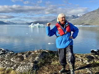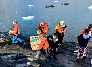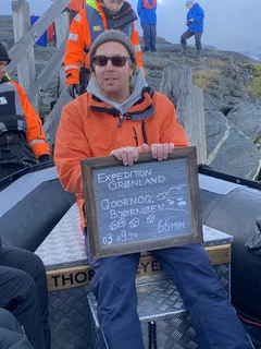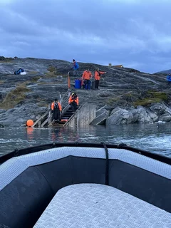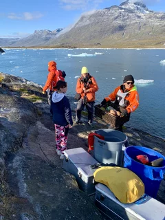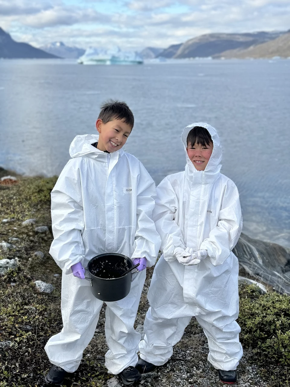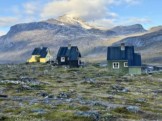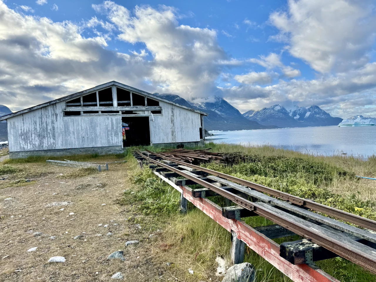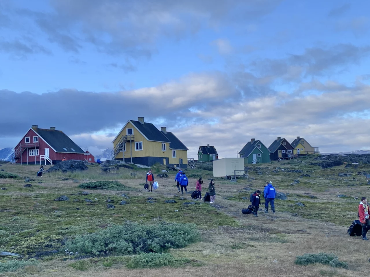 Qoornoq liegt tief in einem der zahlreichen Fjorde auf der kleinen Insel Bjoernoen und ist offiziell seit 1974 eine verlassene Siedlung. Das heißt, sie ist nicht mehr permanent bewohnt, jedoch nutzen die Einwohner von Nuuk, der Hauptstadt Grönlands, ca. 15 gut erhaltene Wohnhäuser im Sommer als Wochenenddomizil. Man findet noch die verfallenen Überbleibsel einer Fischfabrik. Außerdem werden 2 größere Häuser als Schul-Landheime genutzt und für die Schüler Sommer-Camps durchgeführt. Wie der Zufall es wollte, haben wir bei unserem Besuch auf der Insel 2 Schülergruppen getroffen. Da neben dem Lehrer auch einige der Kinder recht gut Englisch sprachen, kam es zwischen uns und ihnen teilweise zu regen Konversationen. Es war erstaunlich zu sehen, wie offen und unkompliziert die Kinder mit uns umgingen. Sie haben sich sehr gefreut uns zu treffen und waren auch sehr wißbegierig. Marion hat in der süßen Inoona eine neue “Freundin” gefunden. Eine der Gruppen bereitete gerade ihren Abschlußabend vor, und so hat die Küchencrew des Schiffes spontan einige Kisten mit Lebensmitteln, Süßigkeiten und Obst zusammengestellt und gespendet. Obst, wie zum Beispiel Papaya oder Ananas, hatten sie offensichtlich noch nie gesehen.
