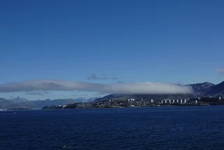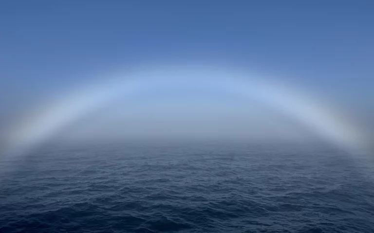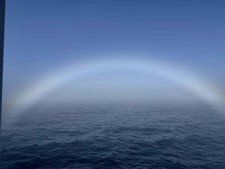 Zum Glück habe ich aber noch rechtzeitig die Augen wieder aufgemacht. Zwischenzeitlich war Seenebel aufgezogen, der aber nur eine Höhe von ca. 25-30 Meter hatte. Darüber war blauer Himmel und strahlender Sonnenschein. Das führte zu einer seltenen Konstellation, in der sich ein Nebelbogen bildet. Und der stand direkt vor unserem Fenster!!! Erst Polarlichter, dann der seltene Nebelbogen!! Das nenne ich mal Fotografenglück!!!