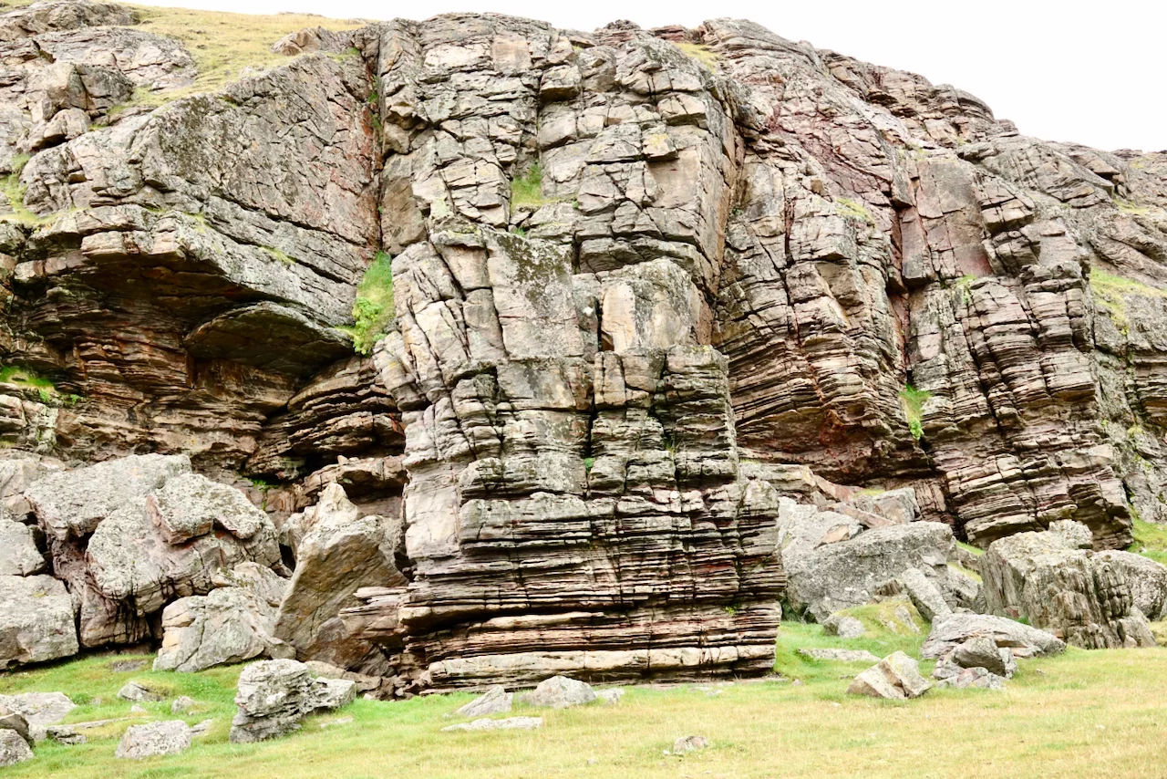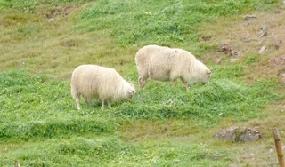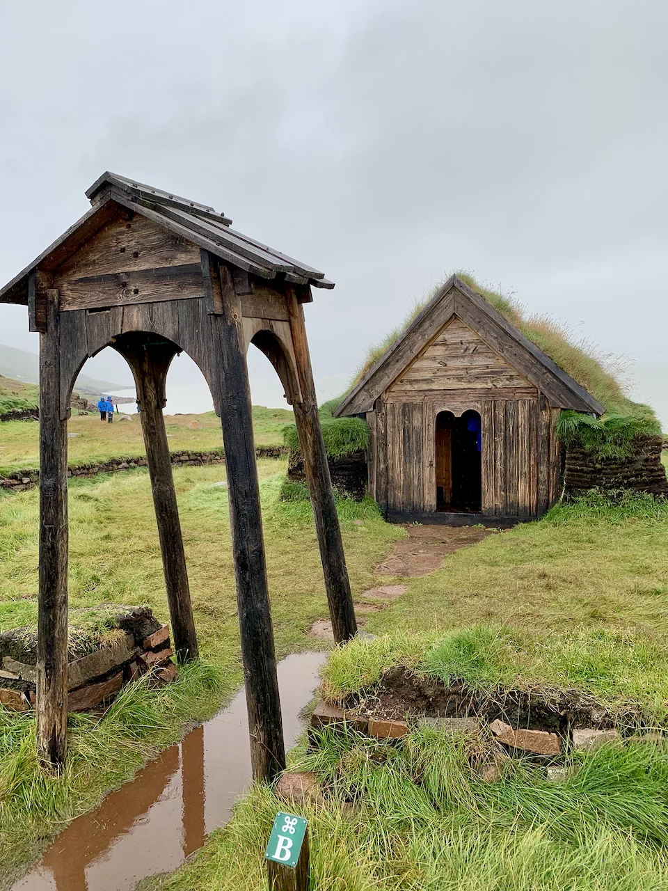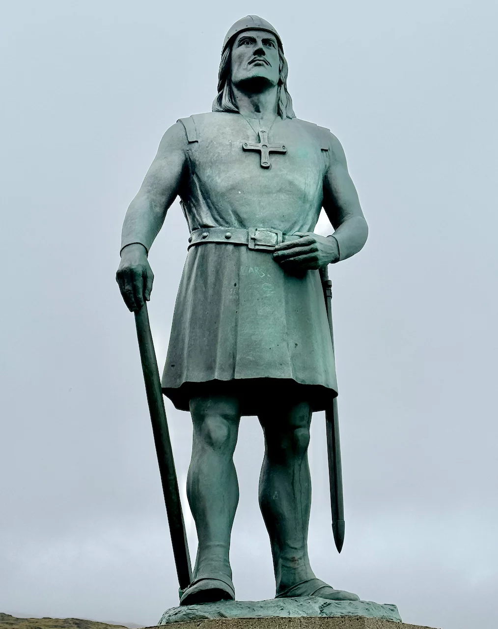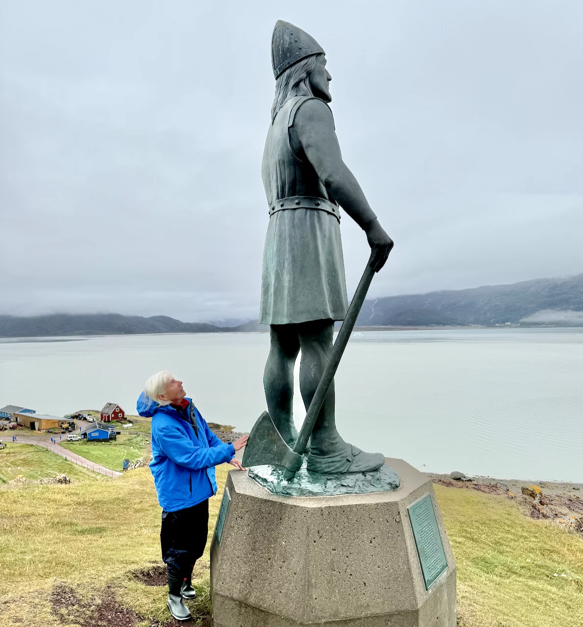 Es kostete uns schon etwas Überwindung, bei Dauerregen in das Zodiac zu steigen. Zumal vom gestrigen PreCap klar war, dass es außer der Statue von Erik dem Roten nur noch ein paar Ruinen und eine Schäfersiedlung zu sehen gab. Bei schönem Wetter ist es hier landschaftlich sicher sehr schön. Irgendwie hat diese Gegend uns stark an Schottland erinnert, was vielleicht auch mit dem Wetter zu tun hatte. Hinterlassenschaften der Schafe gab es viele, von den Tieren selber haben wir aber kaum etwas gesehen. Bedingt durch das grauselige Wetter haben wir unseren Besuch auf das notwendige Minimum beschränkt.