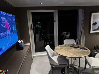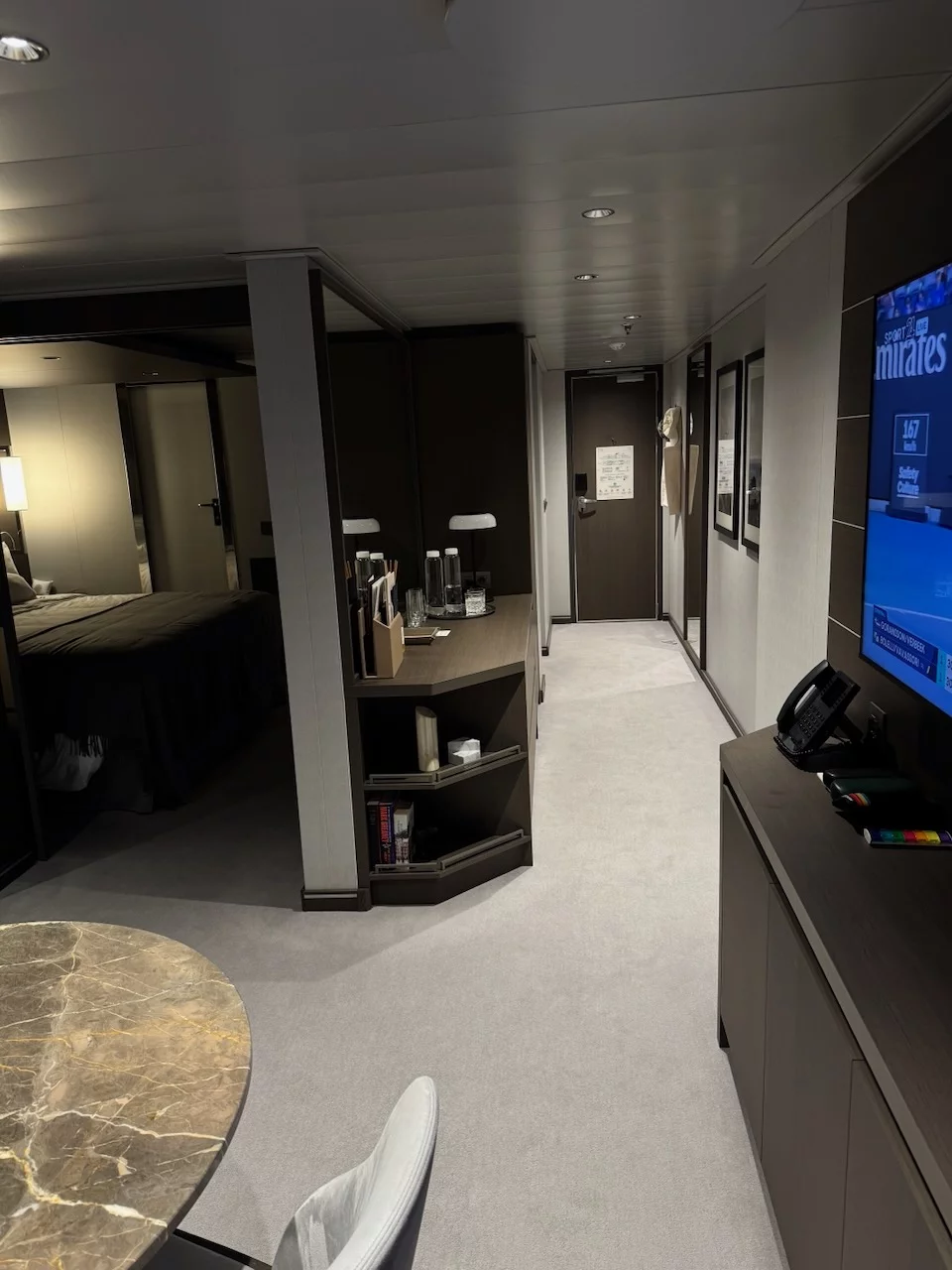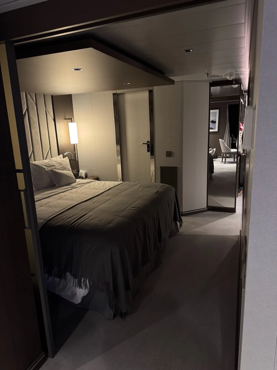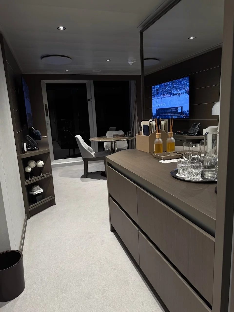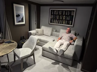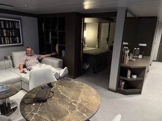 Und so sind wir auf Deck 9 in einer 50qm (inkl. Terrasse) großen Premium Penthouse Suite mit getrennten Schlaf-und Wohnzimmer, jeweils mit einem 65" Fernseher ausgestattet, "gelandet" .