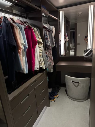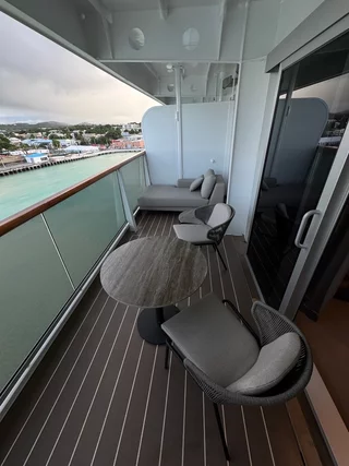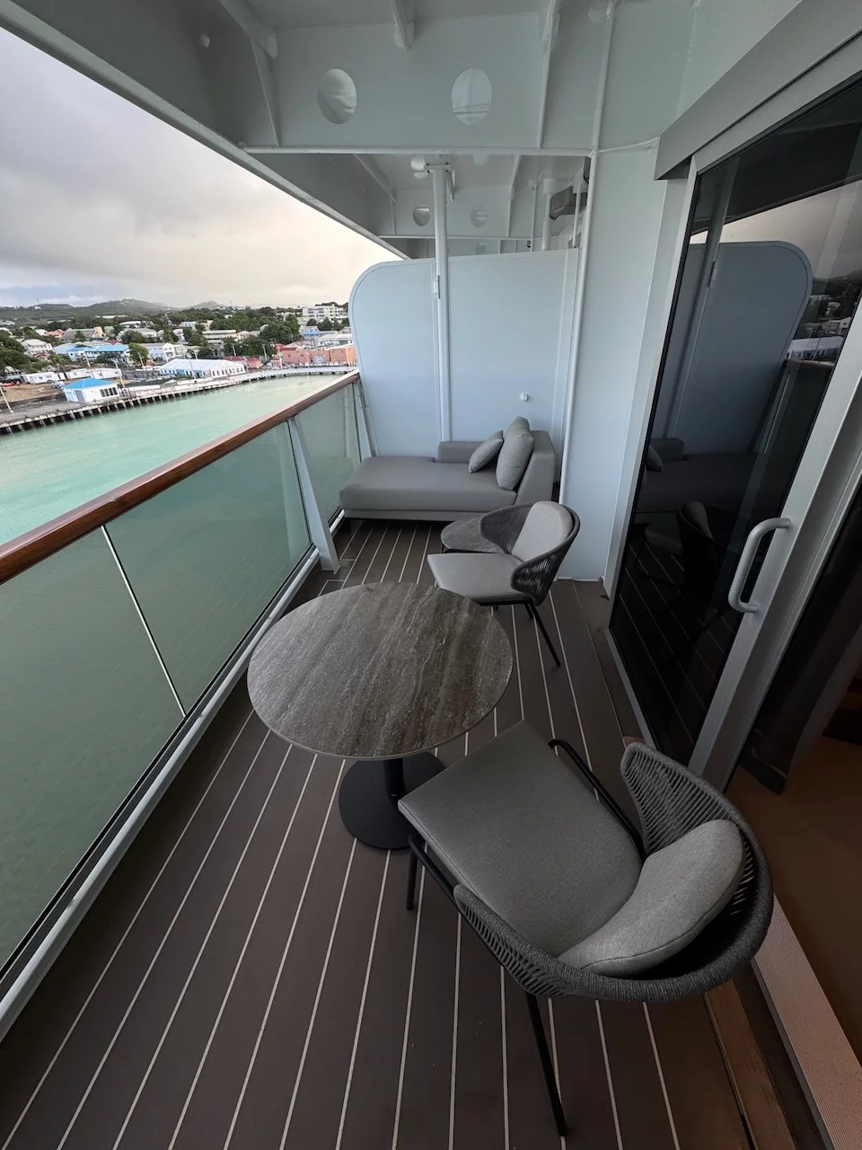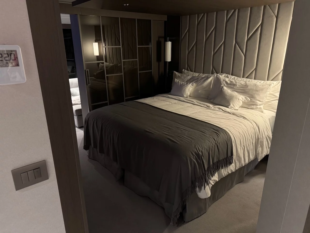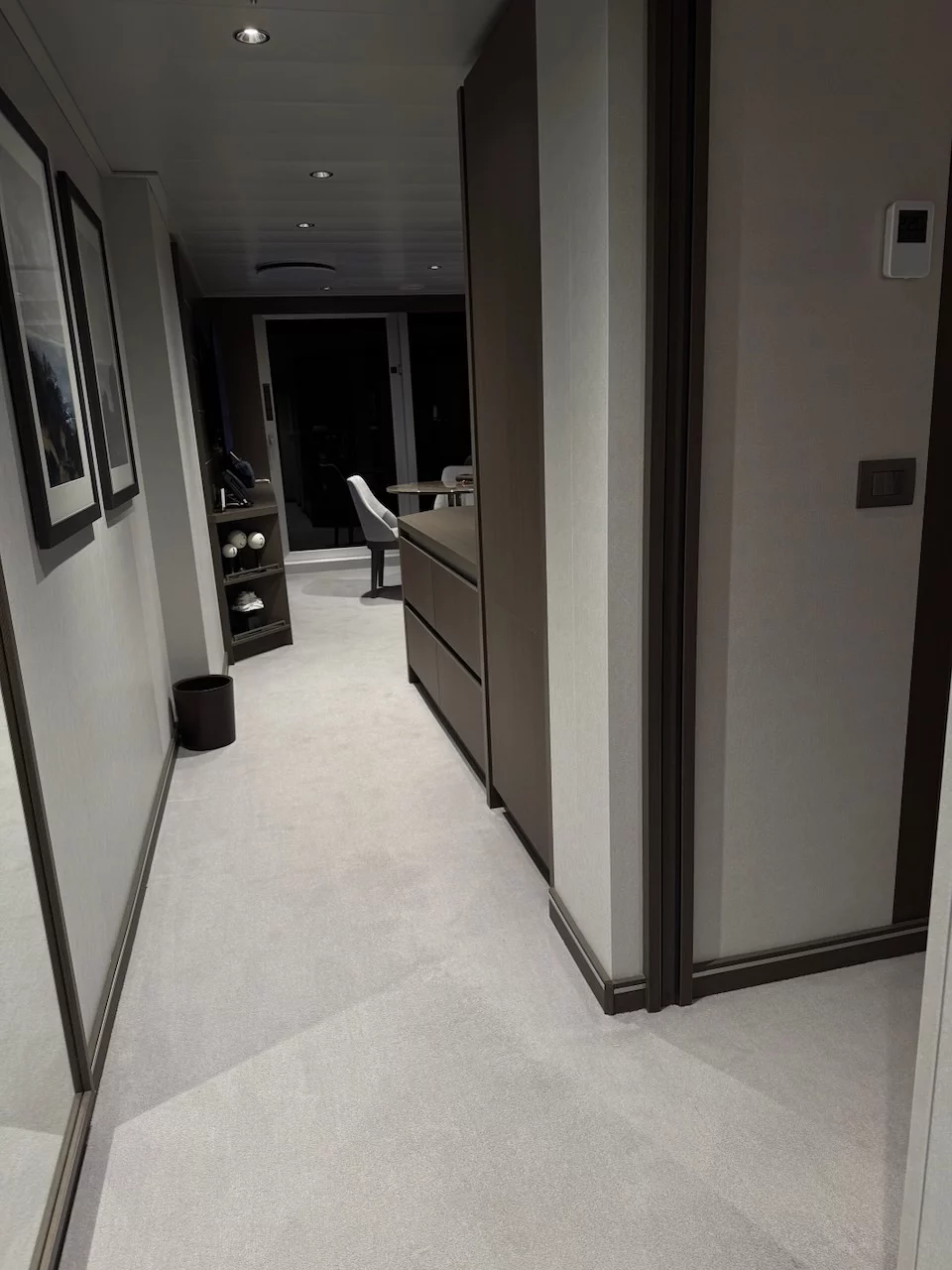 Und so sind wir auf Deck 9 in einer 50qm (inkl. Terrasse) großen Premium Penthouse Suite mit getrennten Schlaf-und Wohnzimmer, jeweils mit einem 65" Fernseher ausgestattet, "gelandet" .