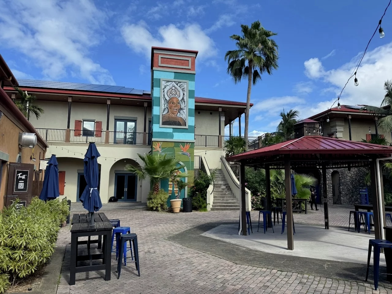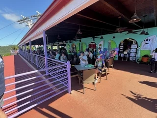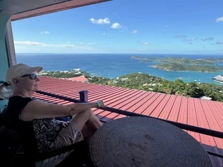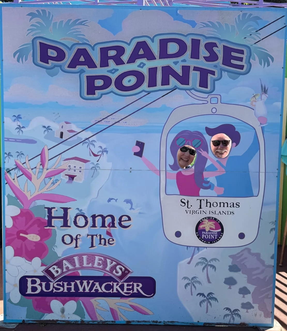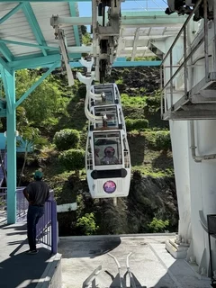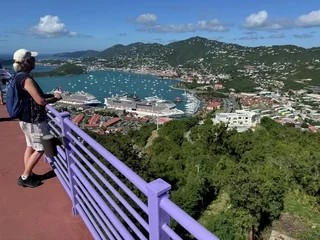 Unser erstes Ziel war der Paradise Point auf dem Hausberg von Charlotte Amalie. Dorthin kann man zwar laufen, hinauf geht es dann aber mit einer Kabinenbahn. Die gab es vor 14 Jahren noch nicht. Trotz der 2 anderen Schiffe, die jeweils jeweils 4600 Passagiere und 1650 Crew an Bord hatten (Explora I hat 750 Passagier und 630 Crew an Bord), hielt sich der Andrang an der "Talstation" in Grenzen. Die Fahrt zum ca. 220m hohen Aussichtspunkt dauert etwas über 5 Minuten. Mehr dürfte es auch nicht sein, denn mit 8 Personen in der kleinen Kabine wird es zwangsläufig recht "kuschelig".