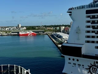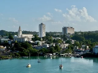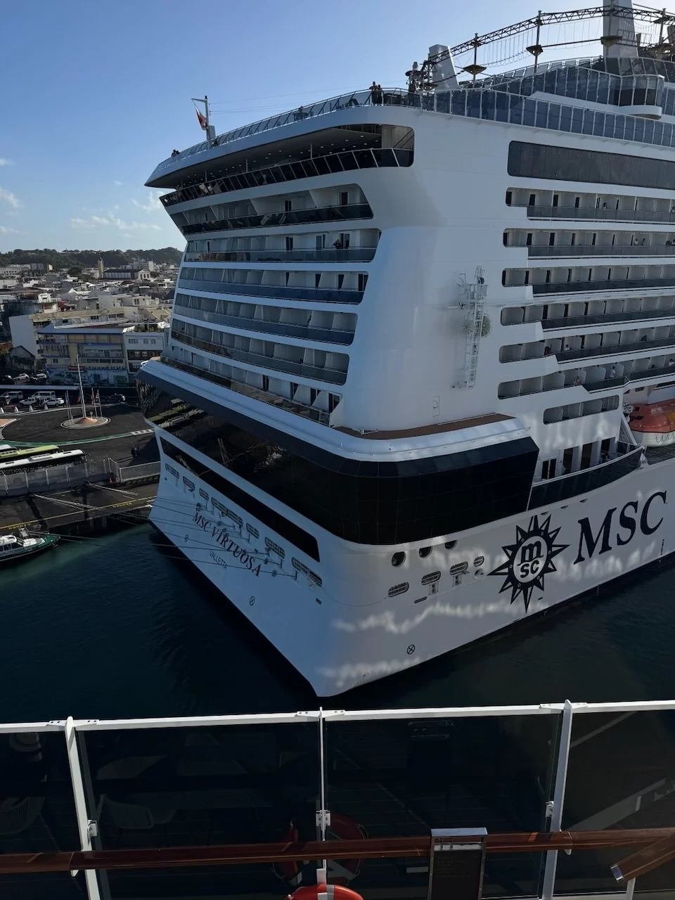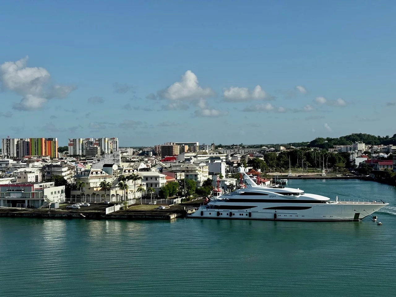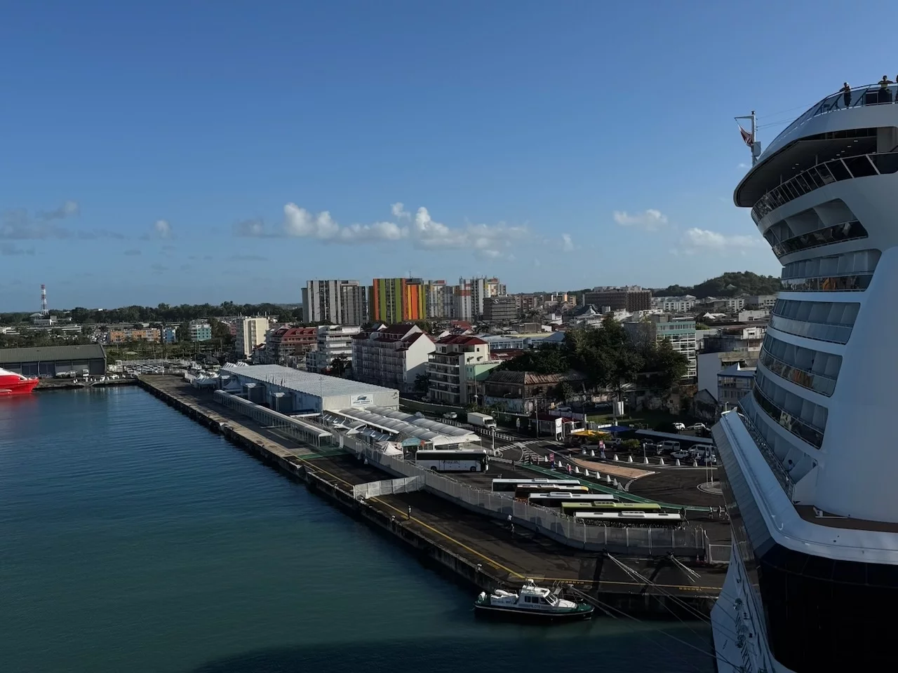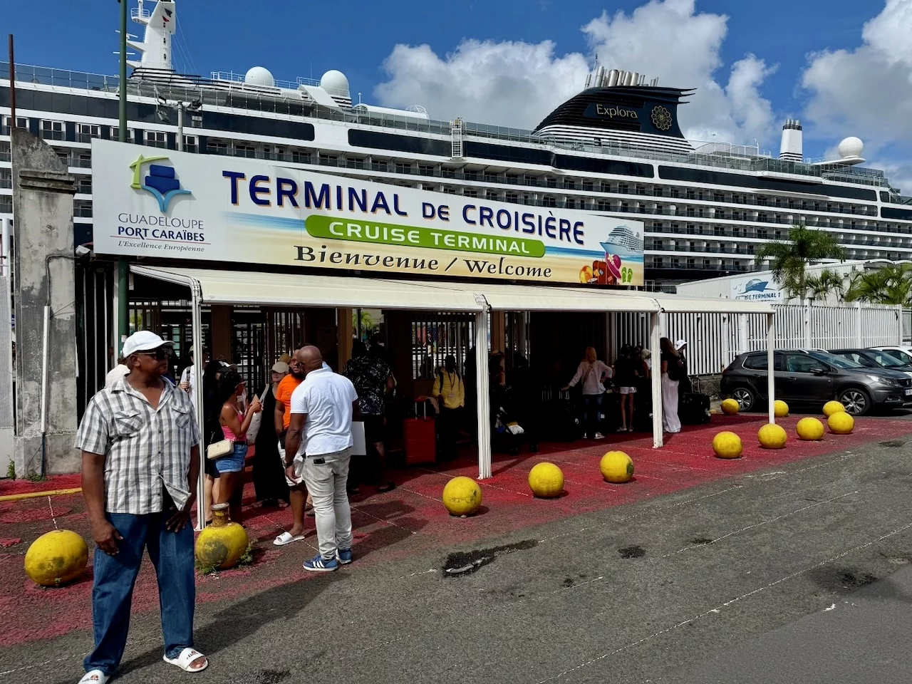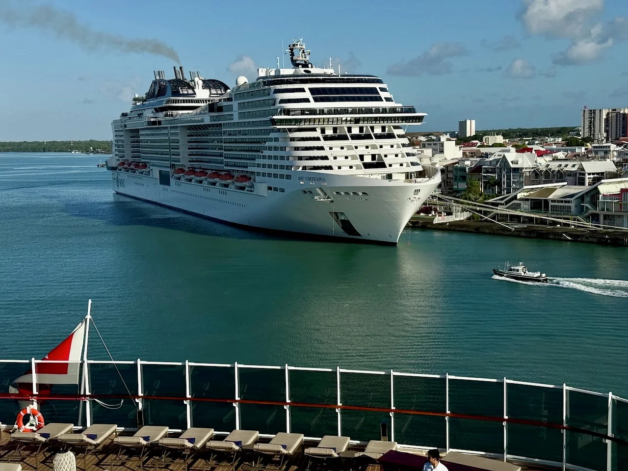 Es war heiß und schwül, als wir heute morgen die ersten Runden auf Deck 12 gedreht haben. Langsam kam der Hafen von Pointe-a-Pitre in Sicht und die Explora I startete ein 180° Drehung, um rückwärts "einzuparken". Am Pier lag bereits wieder so ein 4600 Passagiere Monster von der Mutterfirma, die MSC Virtuosa. Es ist immer wieder erstaunlich, mit welcher Präzision diese Schiffe bewegt werden können. Es war wirklich nicht viel Platz.!!