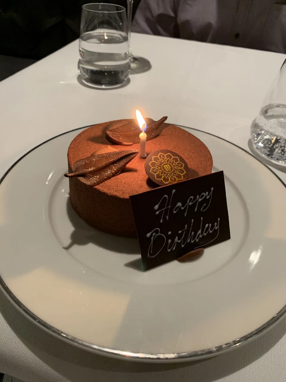 hielt einen Teller mit einem kleinen Schokoladenkuchen auf dem