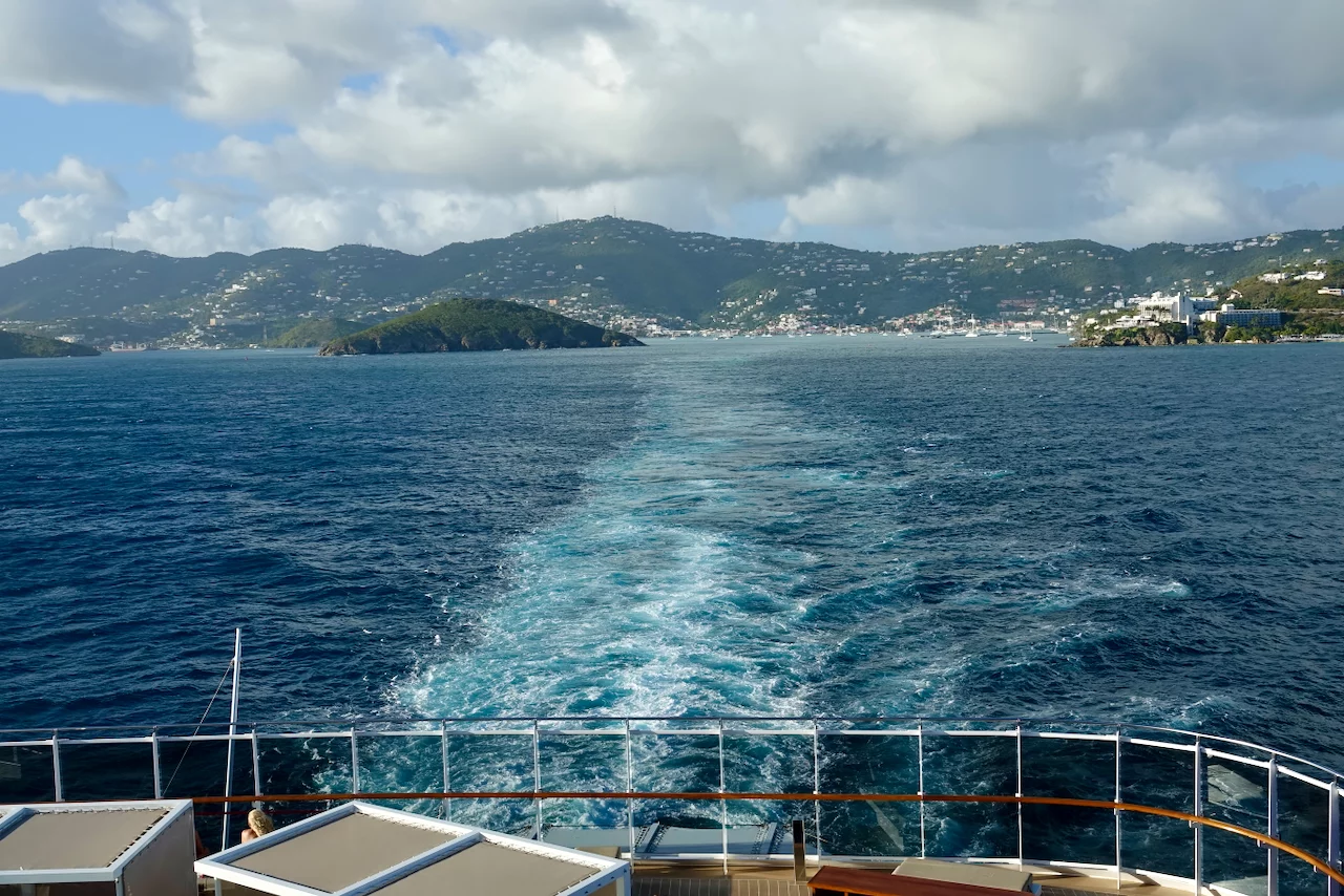 Etwas verfrüht haben wir Saint Thomas entlang der Südwestküste der Insel wieder verlassen. Unser Kapitän hat die Angewohnheit abzulegen, wenn alle Mann/Frau an Bord sind. Diesmal war es eine gute halbe Stunde früher als geplant.. Zum Glück hatte die Norwegian Viva hinter uns den Hafen bereits am frühen Nachmittag verlassen, so daß wir einfach nur zurücksetzen mußten.