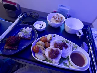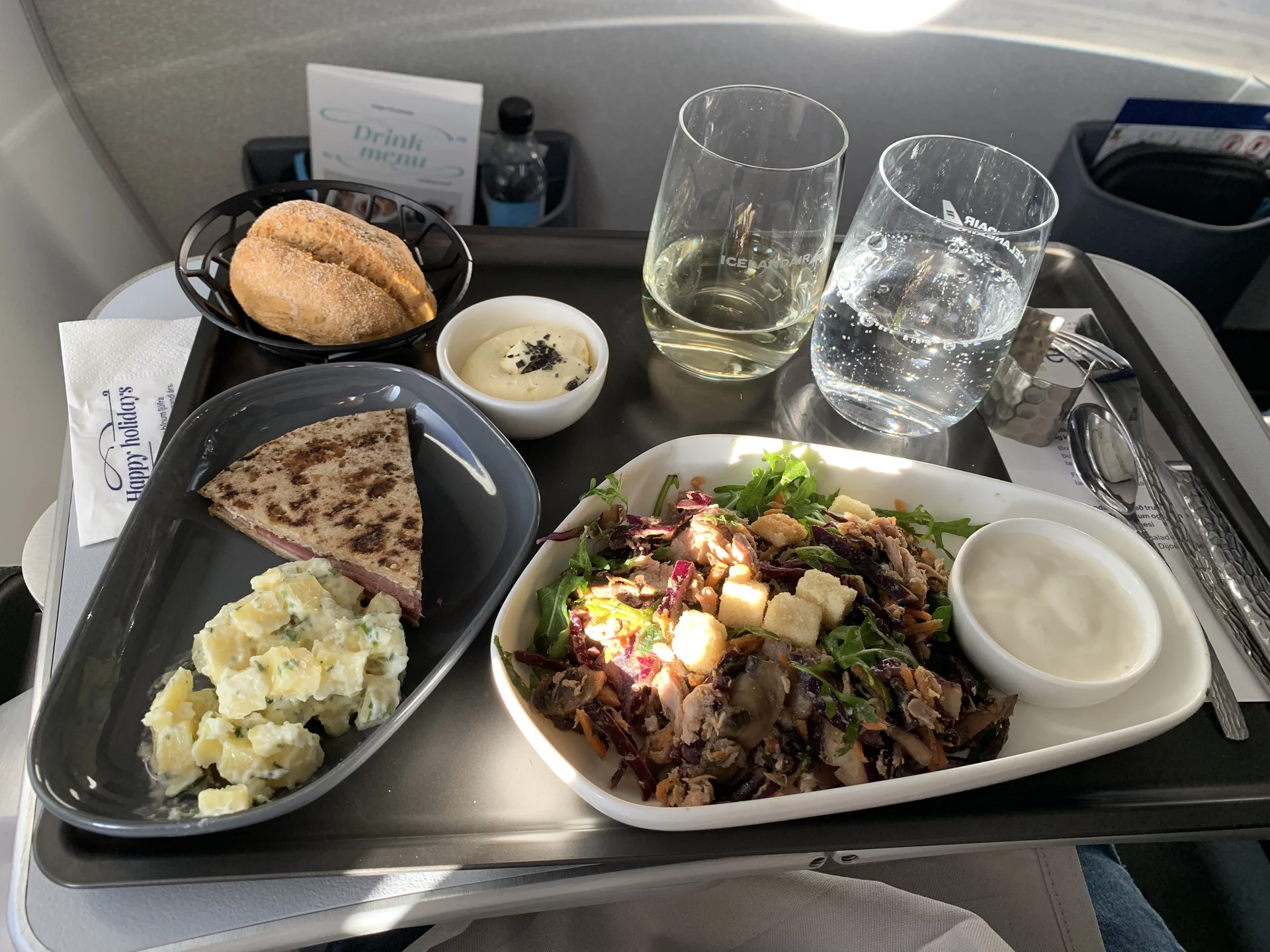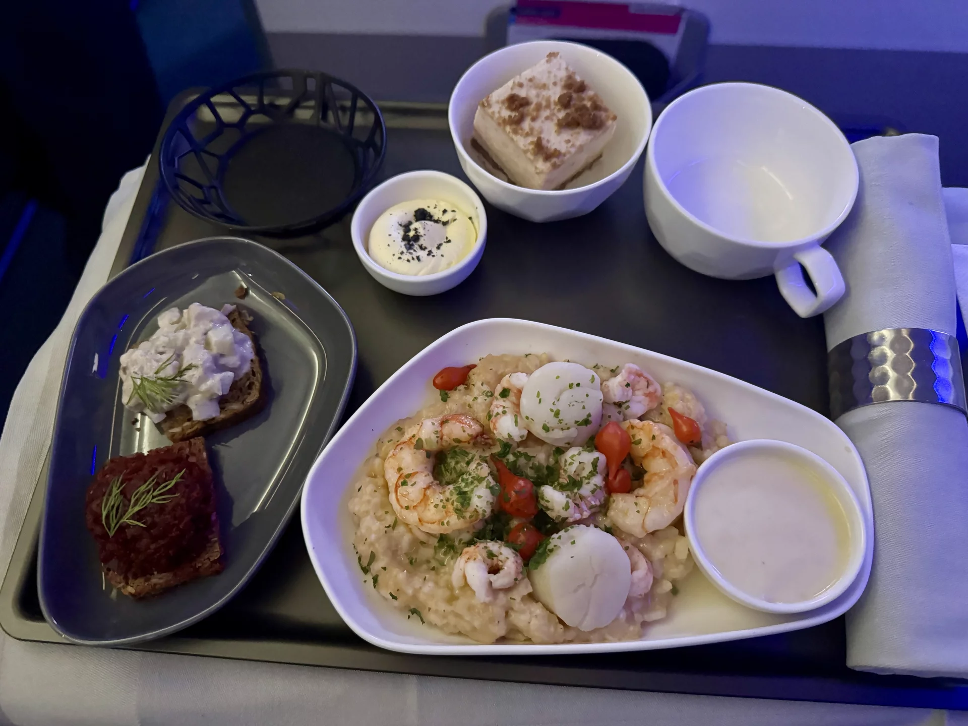 Durch die Verspätung beim Abflug in Amsterdam fiel der Besuch in der Lounge in Keflavijk leider aus. Zum Glück wurde auf dem Weiterflug wieder etwas Leckeres zum "Dinner"serviert. Lottchen entschied sich für eine marinierte kalte Truthahnbrust und für mich gab es ein "göttliches" Schellfisch-Risotto mit Jakobsmuscheln und Garnelen.