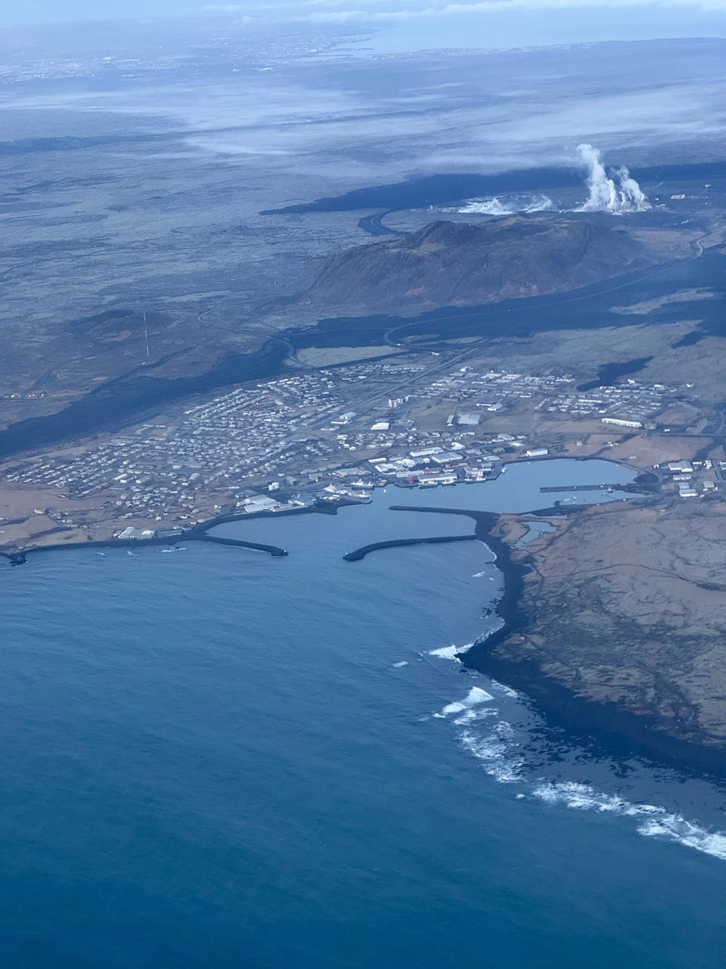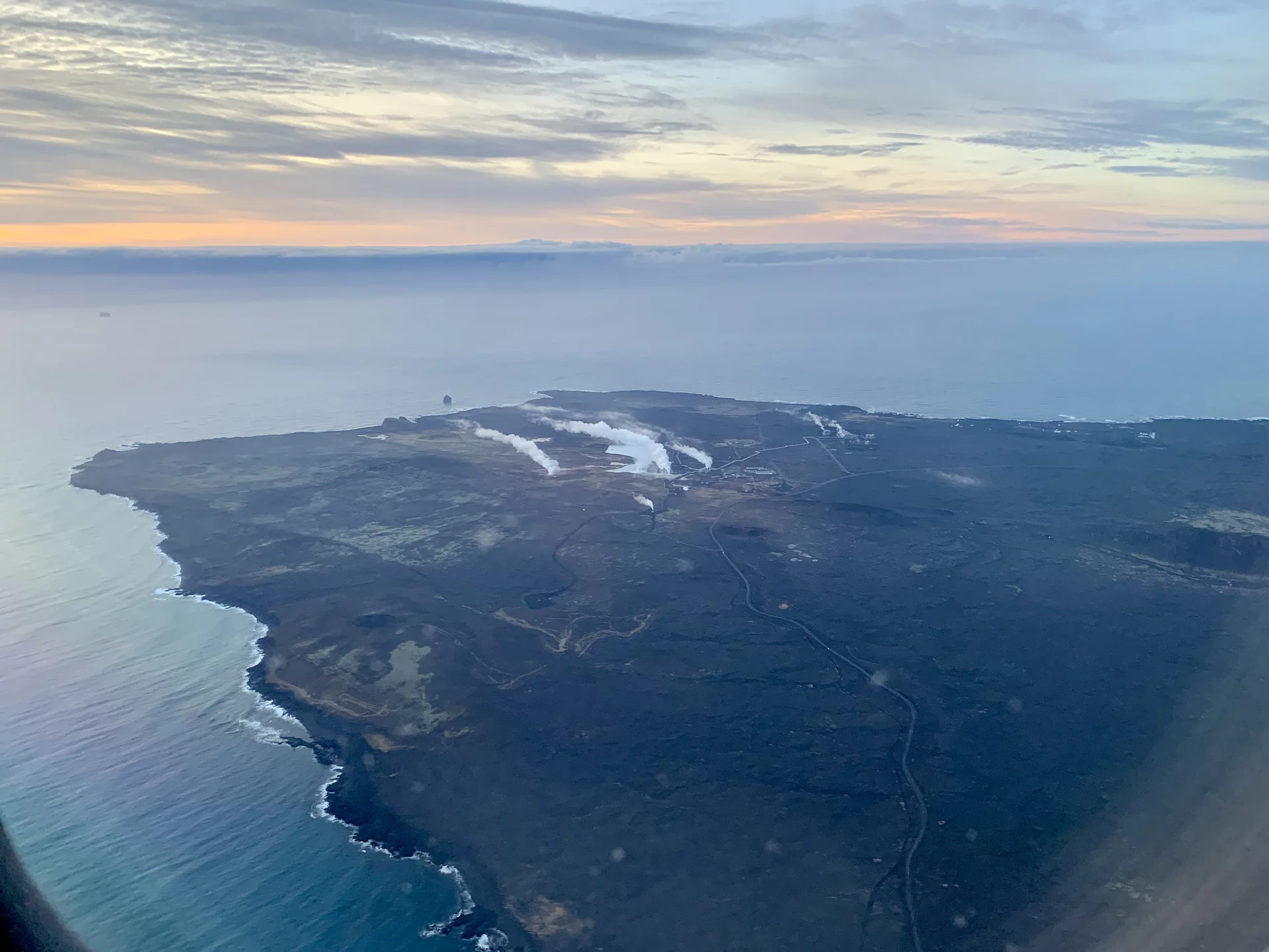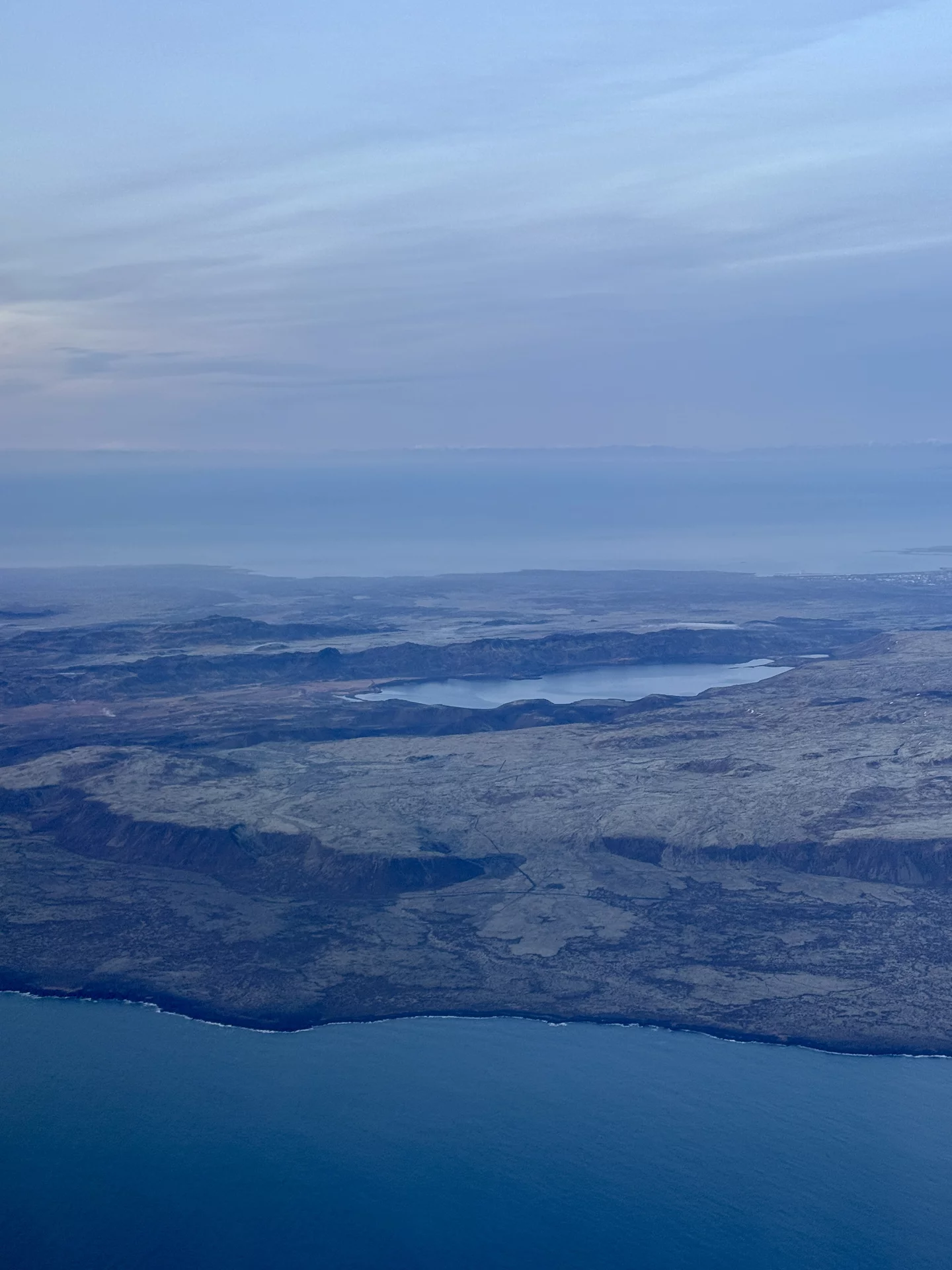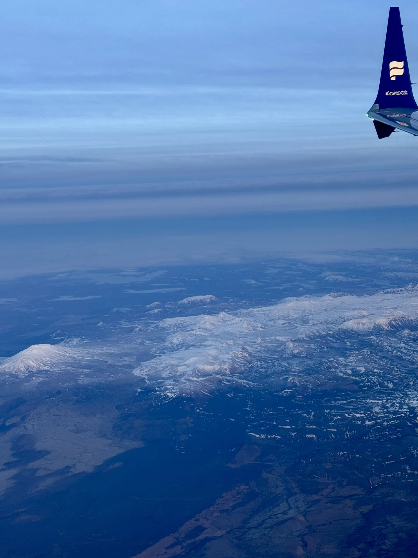 Der weitere Flug verlief ruhig, durch die Wolken unter uns gab's nichts zu sehen und so konnten wir ein wenig versäumten Schlaf nachholen. Kurz vor Island brach die Wolkendecke auf und wir hatten im Anflug auf Keflavijk einen spektakulären Blick auf Island von oben.