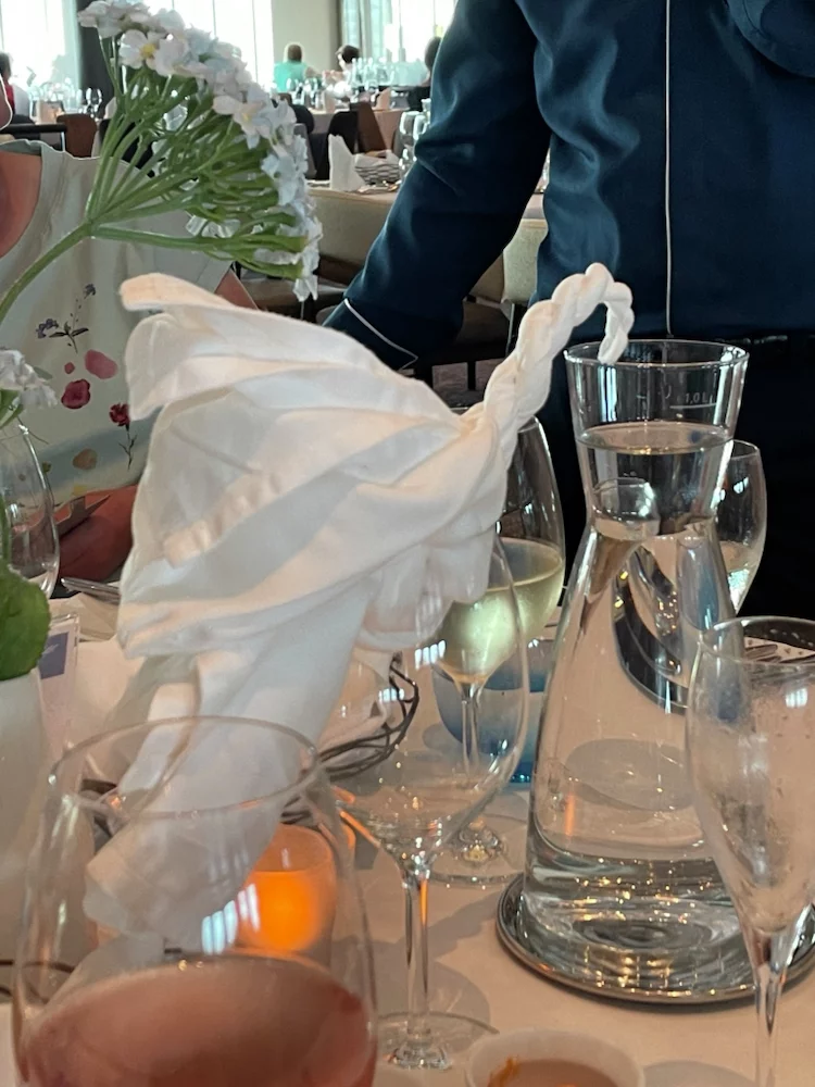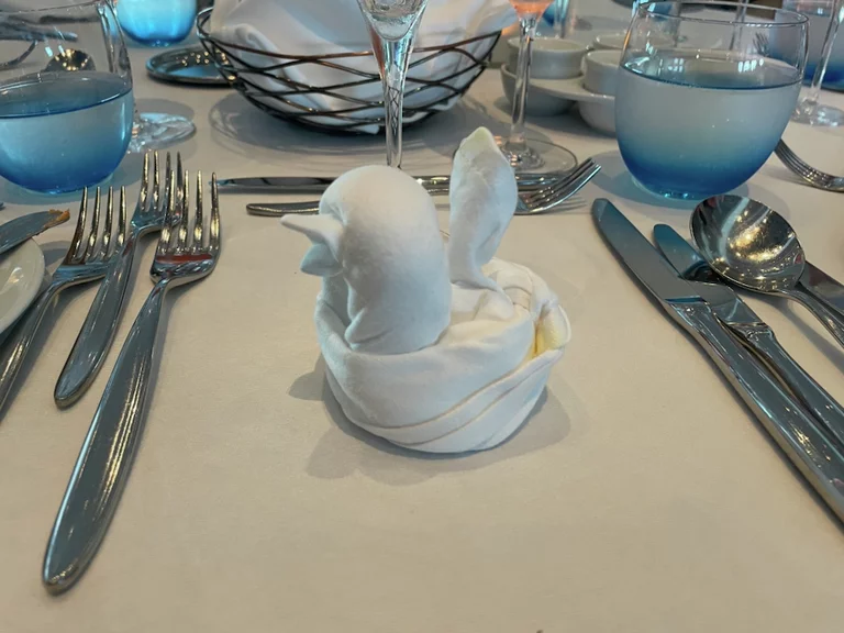 Beim Abendessen bekamen wir eine kleine Vorführung von Getränkekellner Ronald in Sachen Falten von Servietten. In Windeseile zauberte er eine süße Ente und einen Schwan auf den Tisch.