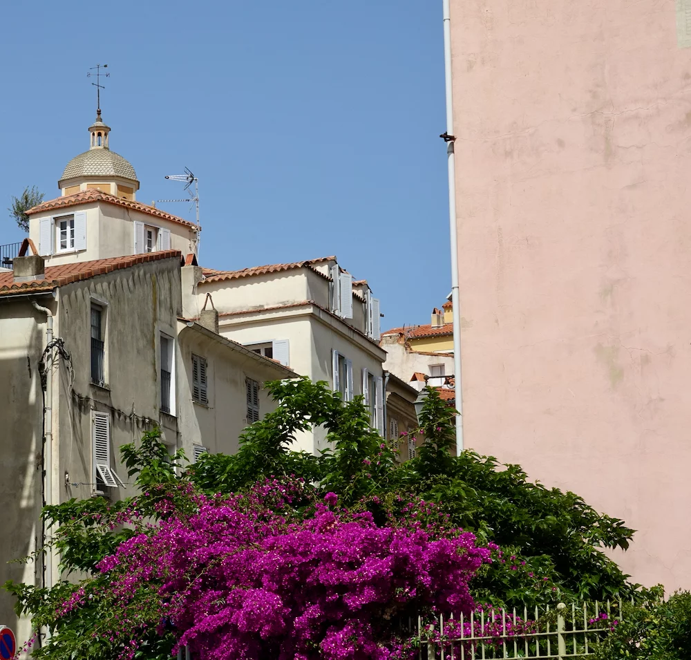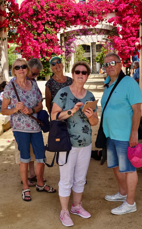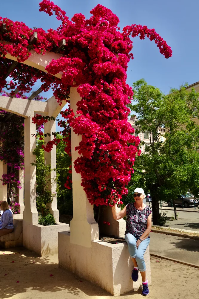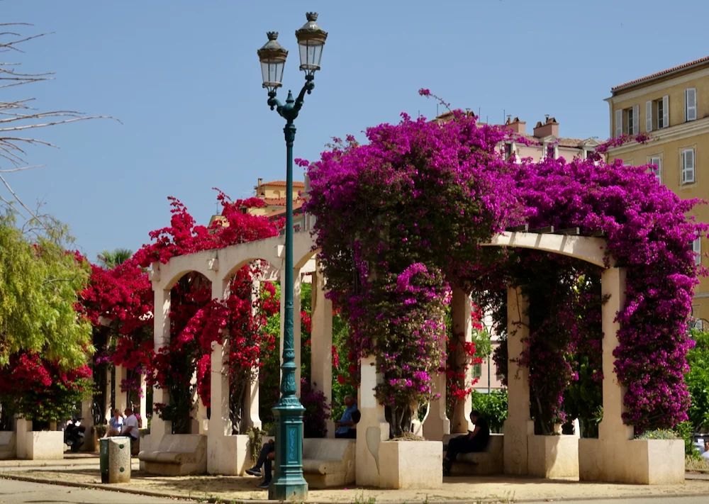 Nächste Station war der Place Charles de Gaulle. Hier gab es ein Monument von Napoleon und seinen Brüdern zu bestaunen. Ein schattenspendender "Tunnel" der über und über mit verschiedenfarbigen Buganvillas bewachsen war, kam wie gerufen für eine kleine Trinkpause. Es war inzwischen ziemlich heiß geworden, denn die Temperaturen hatten die 30° Marke erreicht.
