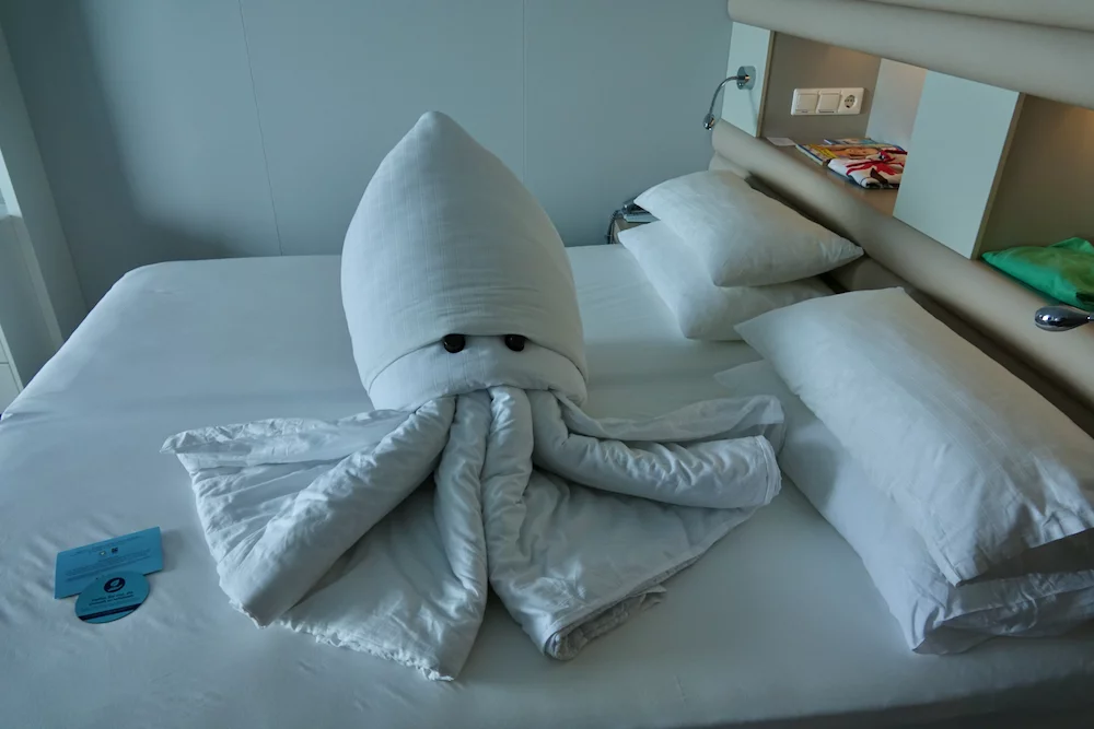 Bei der Rückkehr zum Schiff hatten die beiden sehr netten Kabinenstewards uns aus unseren Oberbetten eine kleine Überraschung gebaut. Mitten auf dem Bett saß ein "Octopus"