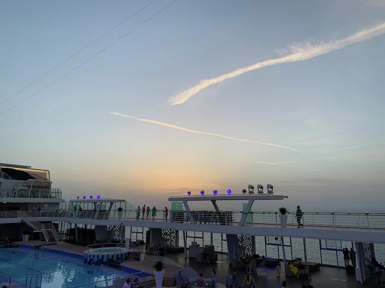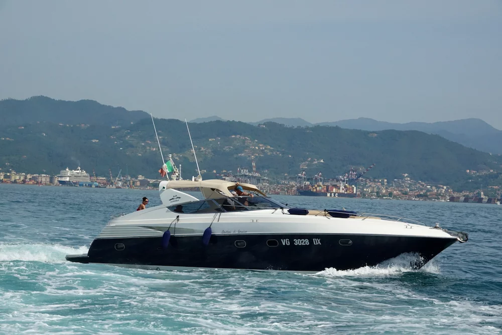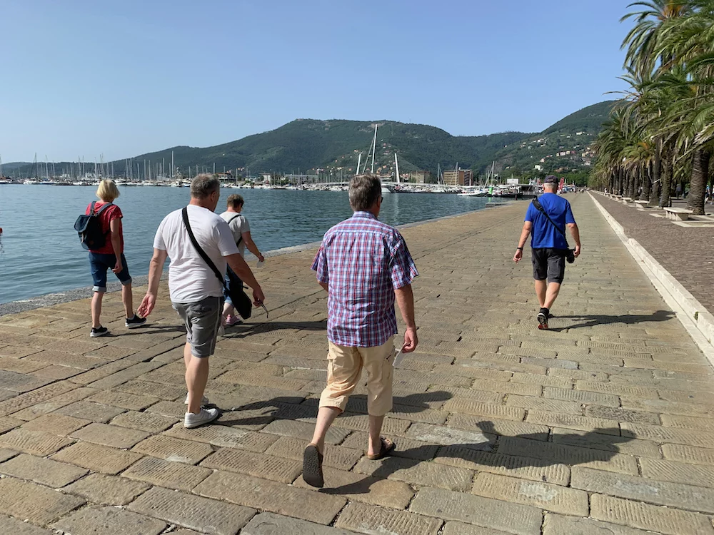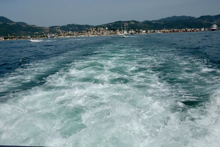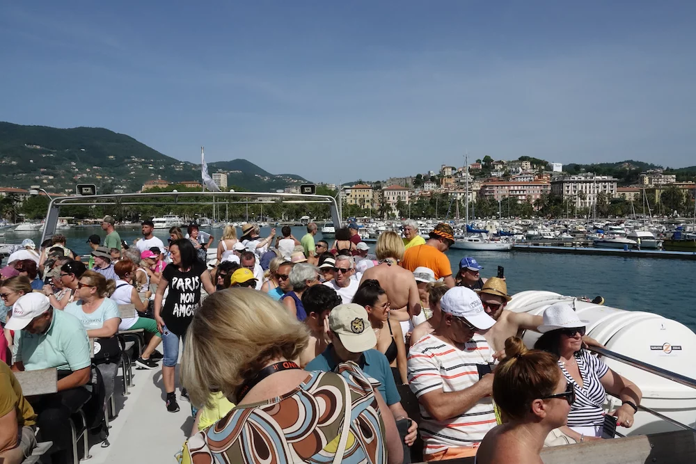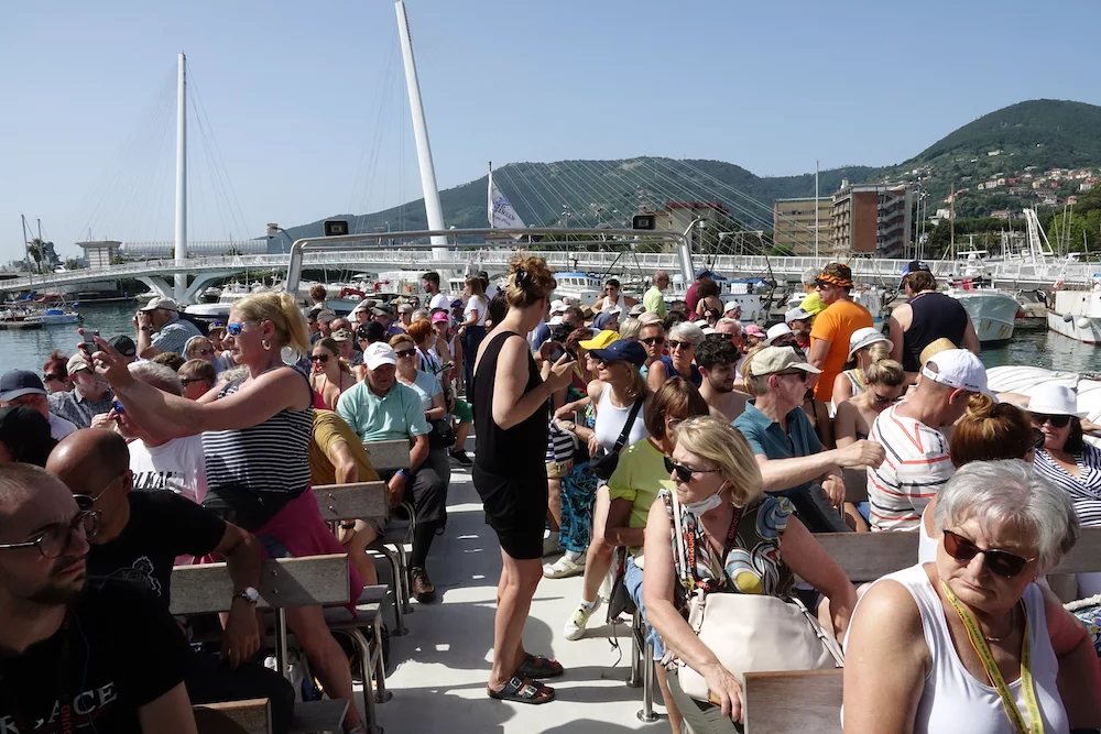 Da es verboten ist, sich in La Spezia frei im Hafengelände zu bewegen, wurde ein kostenloser Shuttle-Bus zum Hafenausgang eingesetzt. Von dort sind es ca. 500m die sehr schöne Uferpromenade entlang bis zum Bootsanleger. Die hatten wir allerdings im Schweinsgalopp zu absolvieren, denn es waren nur noch 5 Minuten bis zur geplanten Abfahrt des Bootes. Glücklicherweise bewahrheitete sich ein italienisches Klischee, dass Pünktlichkeit deutlich überbewertet ist. Hechelnderweise am Boot angekommen, saßen wir noch gut 15 Minuten in dem gut aufgeheizten Innenraum. Warum nicht draußen? Schaut auf die letzten 2 Bilder!!!