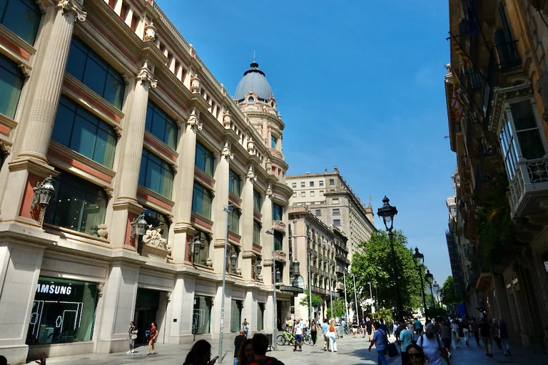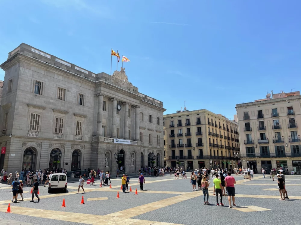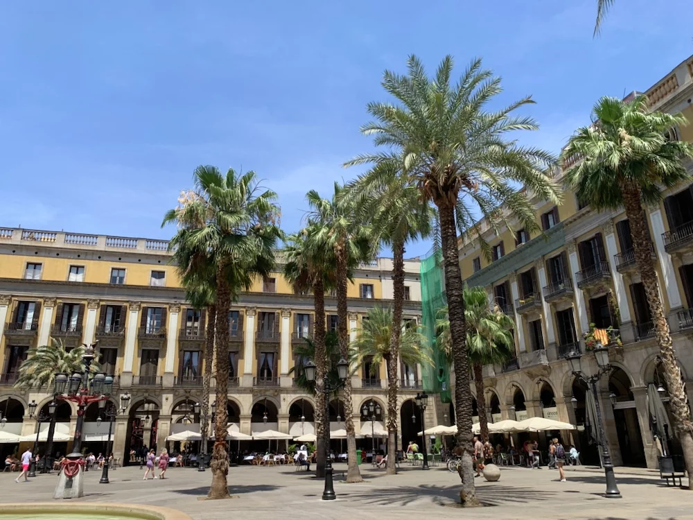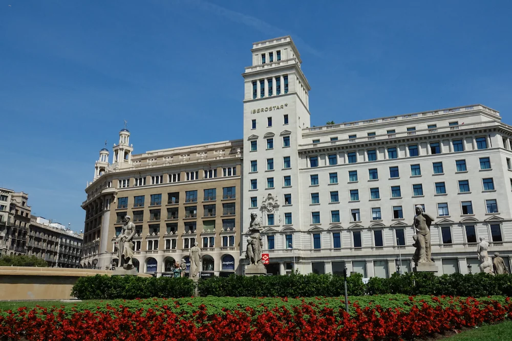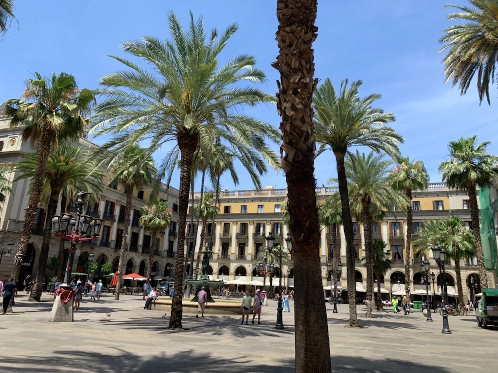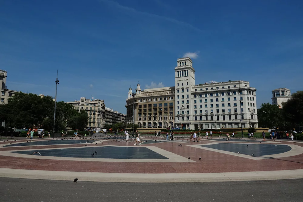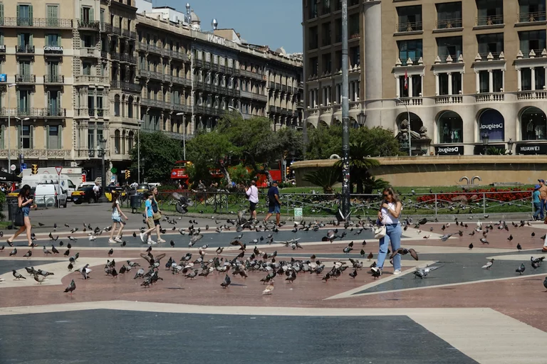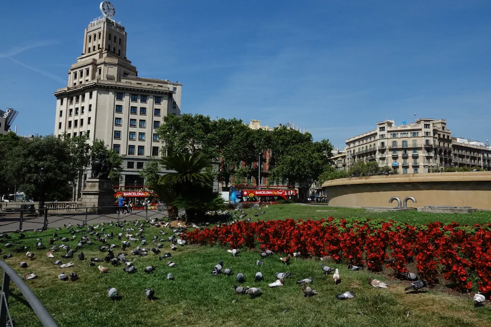 Auf der Plaza Catalunya herrschte geschäftiges Treiben sowohl von Menschen als auch den Tauben.