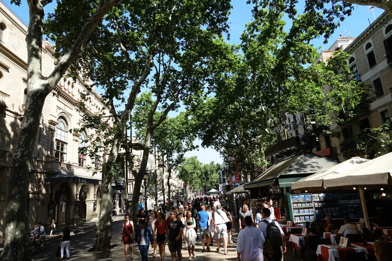 Über die Ramblas sind wir zunächst in Richtung Plaza Catalunya los marschiert. Offensichtlich war hier über Pfingsten einiges los. Jetzt wurden die Stände und Bühnen von einer beachtlichen Zahl an Arbeitern wieder abgebaut. Bereits zu dieser relativ frühen Morgenstunde war auf den Ramblas schon der Teufel los.