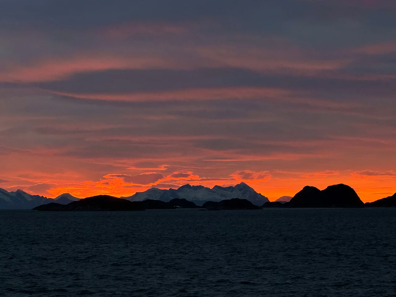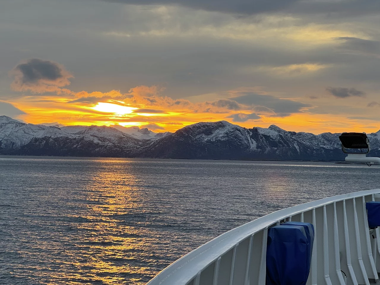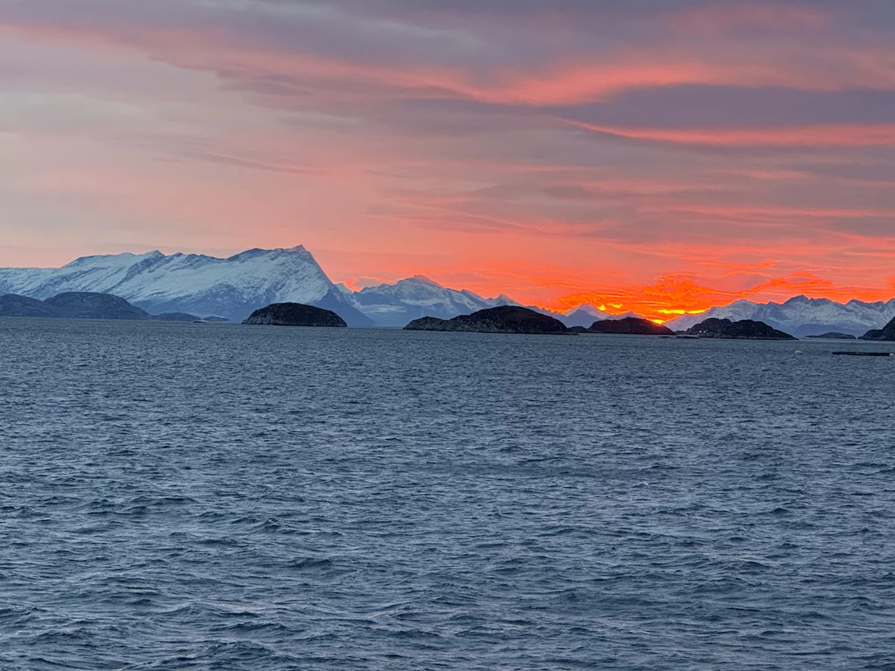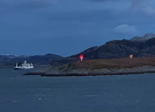 Inzwischen sind wir aus der Inside Passage in den großen Westfjord eingefahren, der quasi die Lofoten vom norwegischen Festland trennt. Draussen gibt es in der Dunkelheit außer ein paar Lichter nicht mehr viel zu sehen. Gegen 19:00 Uhr werden wir den Westfjord wieder verlassen und in die Inside Passage zurückkehren. Durch kleine schmale Fjorde führt unser Weg dann nach Nordosten bis nach Tromsø. In diesen Fjords macht die Spirit nur ganz kleine Fahrt, was zumindest für eine ruhige Nacht sorgt. Es sei denn, die Brücke schmeisst uns wegen aufziehender Polarlichter mit ihrer Durchsage aus dem Bett. Einen ganz kleinen Vorgeschmack haben wir während des Abendessens schon bekommen. Wir hoffen in den nächsten Tagen aber auf deutlich mehr!!!!