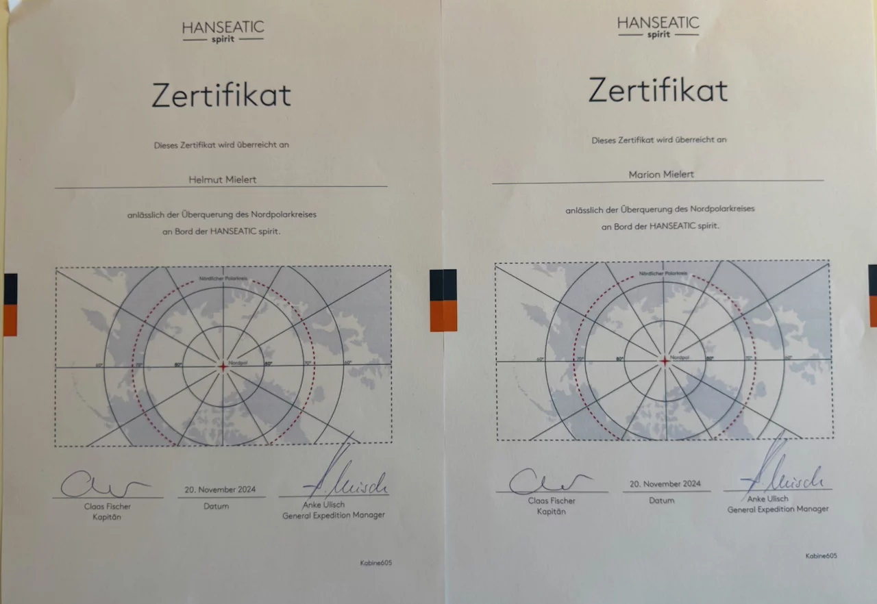 Unser Schönheitsschlaf wurde heute morgen abrupt von der Durchsage des Kapitäns unterbrochen, dass wir in wenigen Minuten den 66. Breitengrad, besser bekannt als der nördliche Polarkreis, überqueren werden. Man nennt ihn auch die "magische Linie zum Land der Polarlichter". Diese ist auf einer kleinen Schäreninsel bei 66° N 33' 55'' durch eine beleuchtete kleine Weltkugel gekennzeichnet.