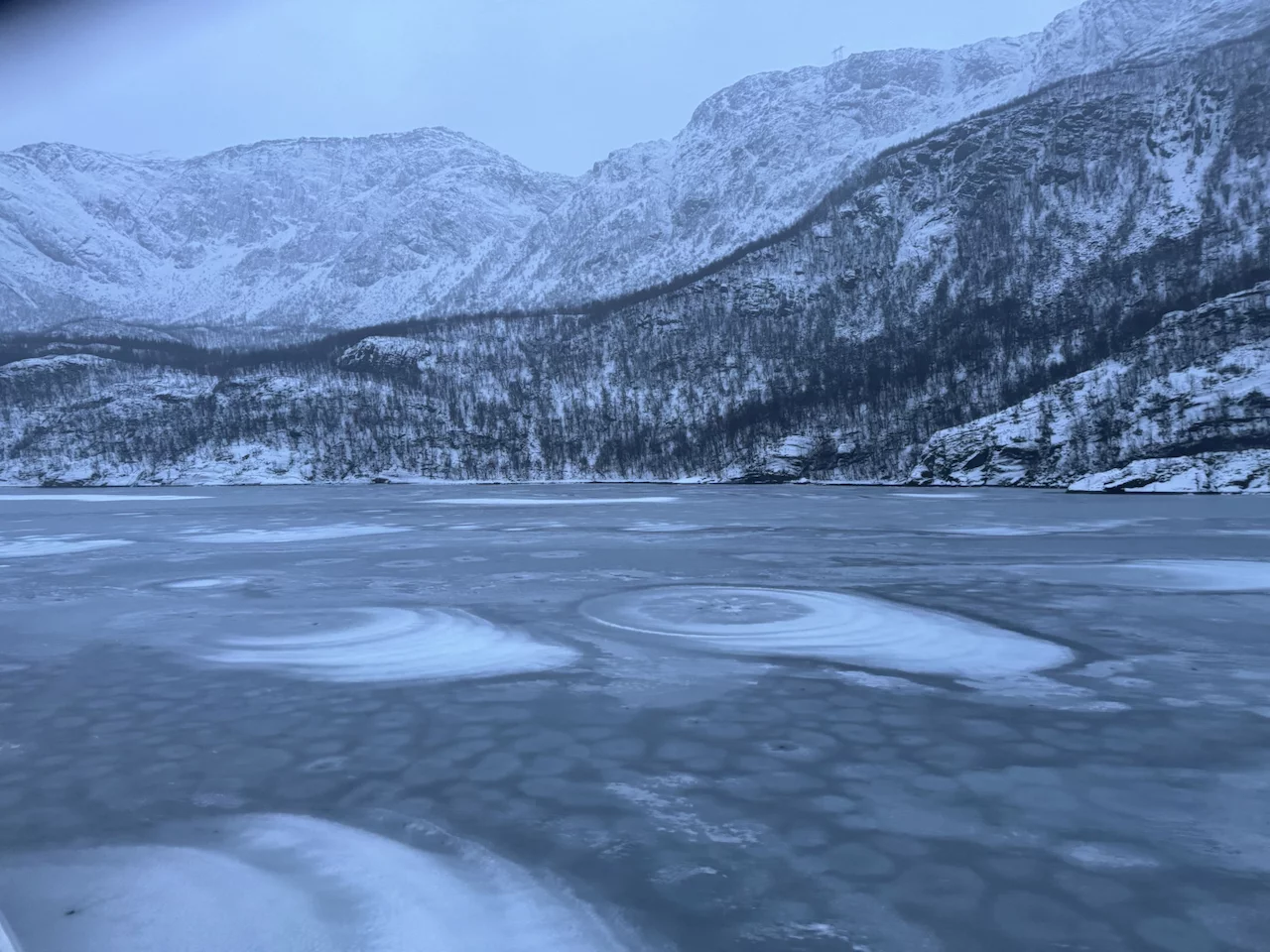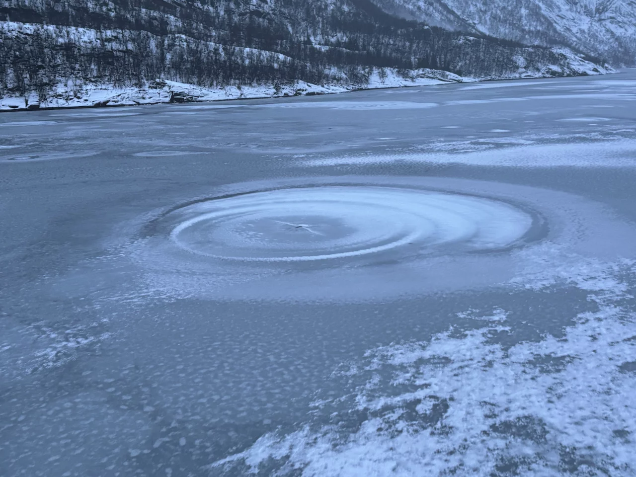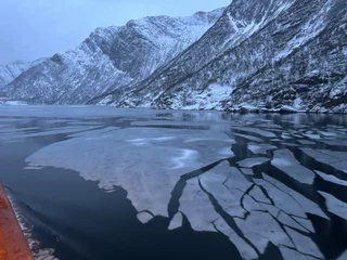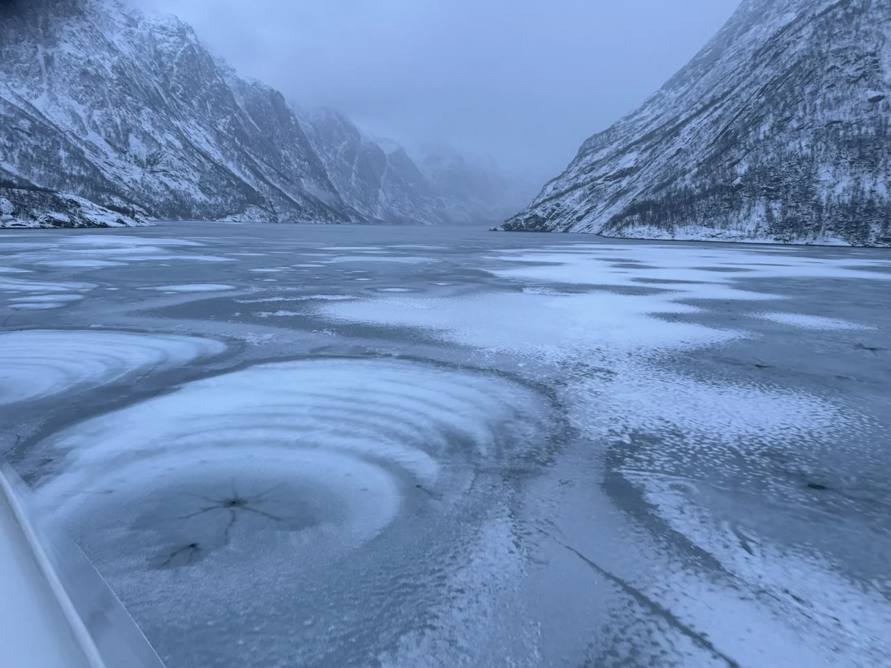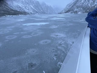 Der Fjord ist nicht nur landschaftlich eine Augenweide. Nein, er war auch zu einem großen Teil zugefroren. Die Eisdecke war nicht wirklich stark, und so glitt die Spirit unter leisem Krachen des Eises immer tiefer in den Fjord. Auf der Oberfläche entdeckten wir immer wieder große symmetrische Kreise mit einem Loch in der Mitte. Die Vermutung der Experten reichte von Luftloch für die Robben bis hin zu Auswirkung von Methangas. So richtig war sich keiner sicher. Ehrlich gesagt war es uns auch egal. Uns reichte der faszinierende Anblick dieses "Naturphänomens" .