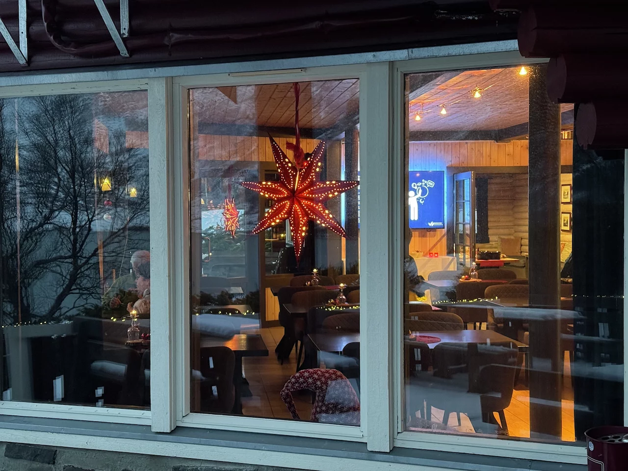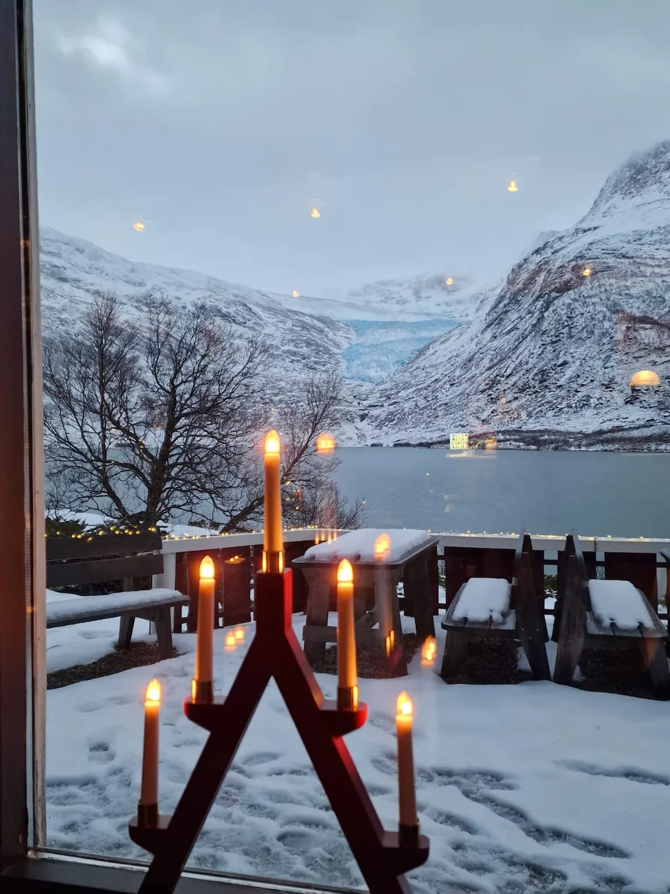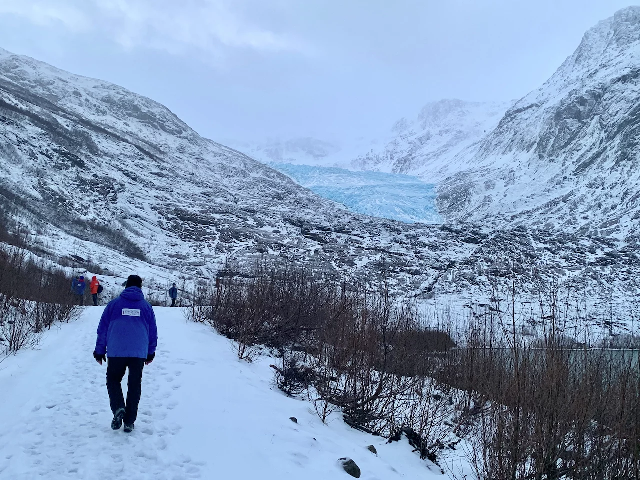 Der Spaziergang vom Anlegeplatz bis zum Gletscher ist ca. 4km lang. Das Morgenlicht verbreitete eine ganz eigene, fast schön mystische Atmosphäre. Nach ca. 1,5km passiert man ein kleines, typisch norwegisches Café, das speziell für uns bereits zu dieser frühen Stunde geöffnet hatte und schon weihnachtlich dekoriert war. Wir haben uns aber entschlossen, den angebotenen Leckereien erst auf dem Rückweg vom Gletscher zu frönen. Gleich vorweg: die frisch gebackenen Waffeln mit Kirschmarmelade und Sauercreme waren göttlich!!!