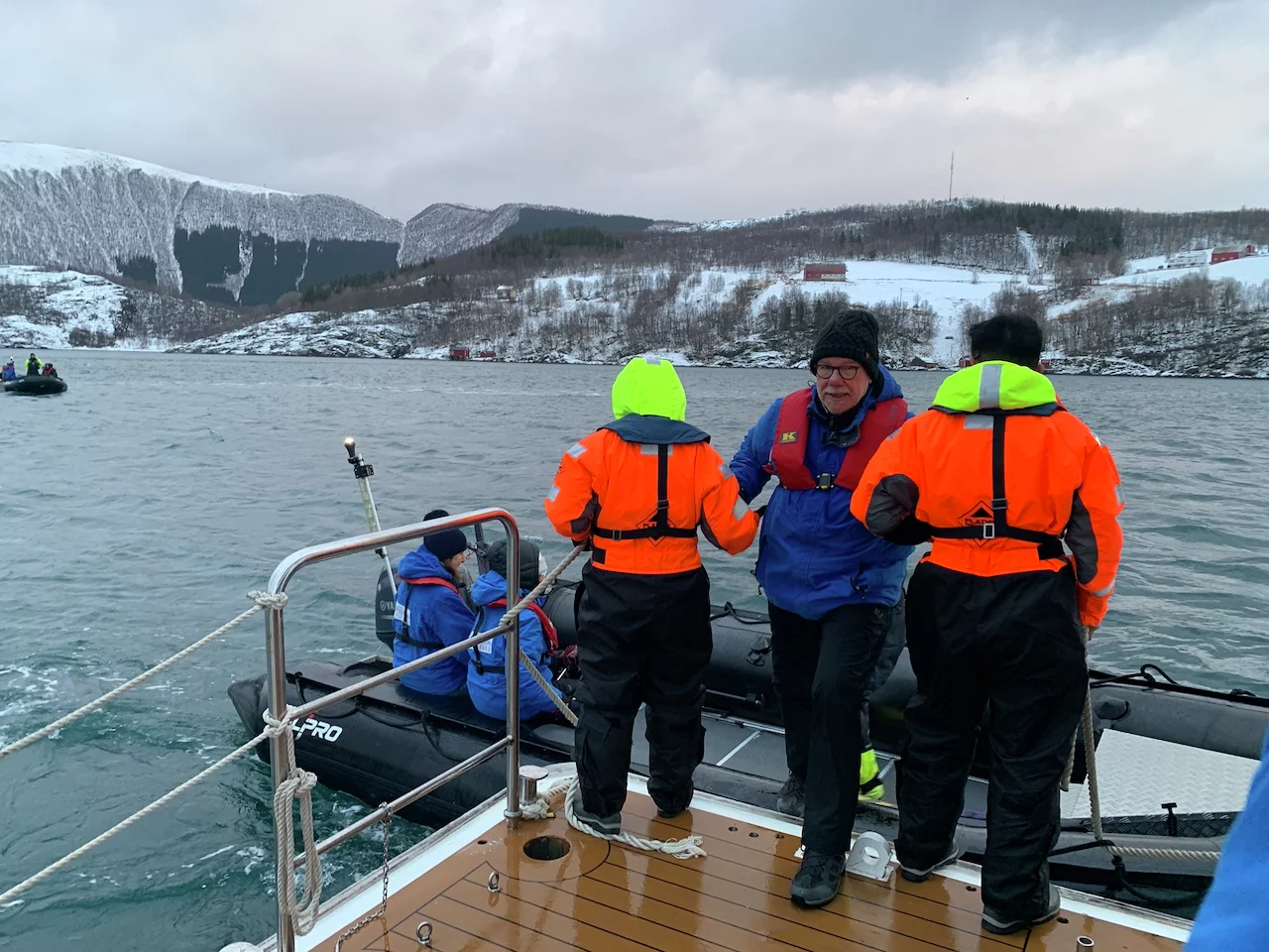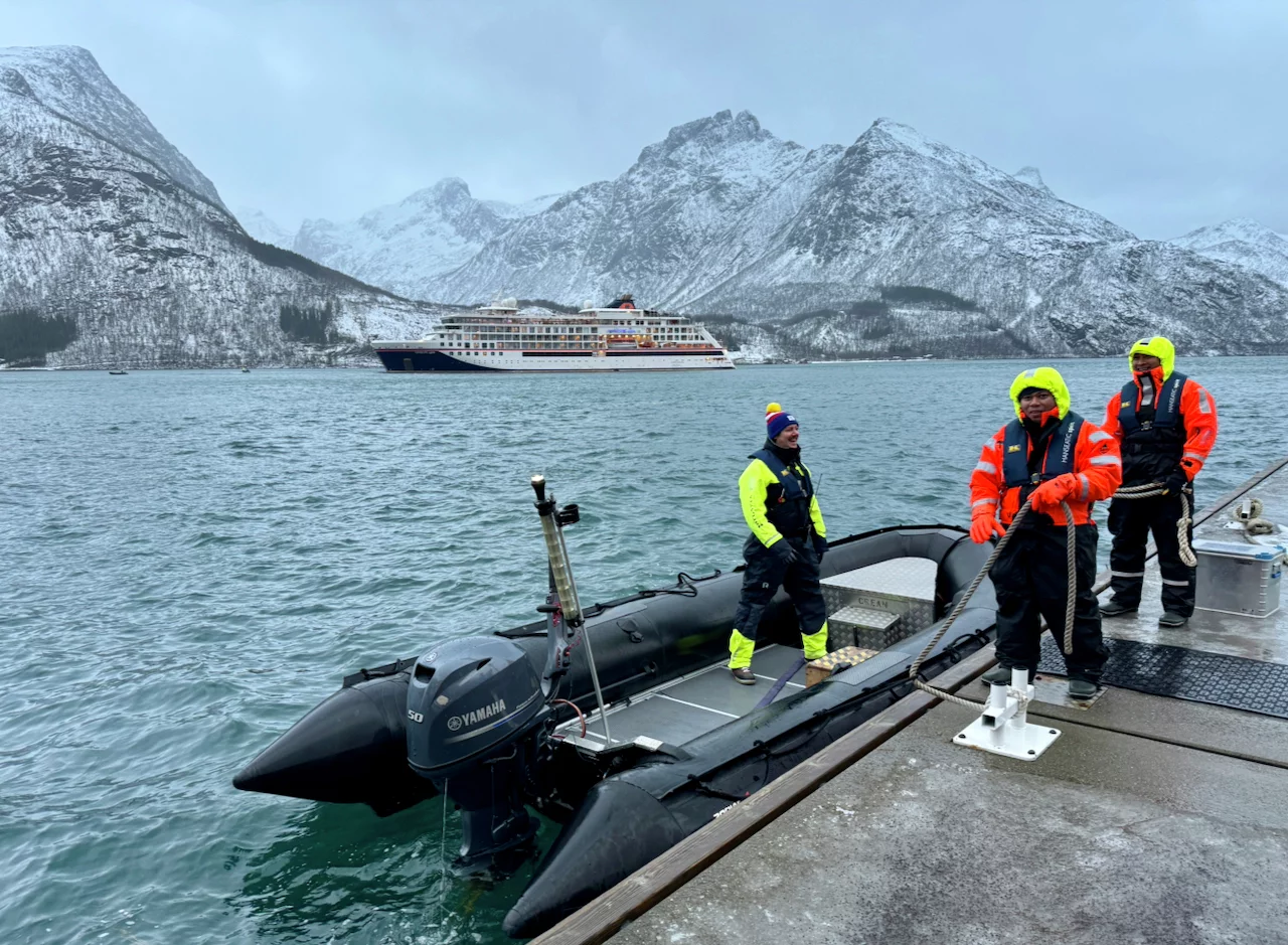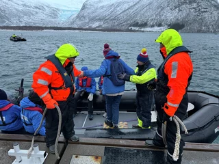 Pünktlich um 07:30 Uhr signalisierte das Rattern der Ankerkette, dass wir unser Ziel im Svartisen Fjord erreicht hatten. Kurz darauf waren auch schon die Zodiacs startklar und wir wurden an Land gebracht.