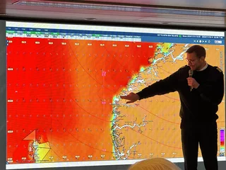 Dass es bei Expeditionsreisen immer wieder mal zu Änderungen der Route kommt, liegt in der Natur der Sache und ist für uns auch nichts Neues. Doch die vorgestellten Wetterkarten des Kapitäns zeigen deutlich, was uns in den nächsten 3-4 Tagen erwartet. Das heißt, ES WIRD UNGEMÜTLICH!! Es werden Wellenhöhen zwischen 6 und 8 Metern erwartet, die in der Spitze sogar bis 15 Meter(!!) gehen können. Es sei bemerkt, die Brücke auf Deck 7 liegt 13 Meter über der Wasserlinie.