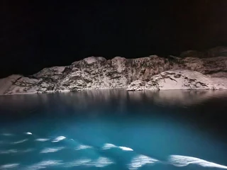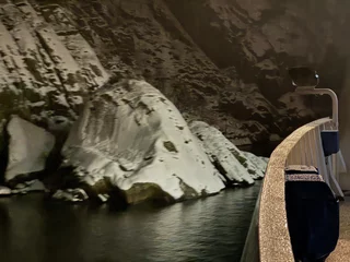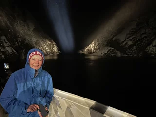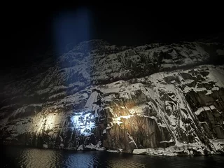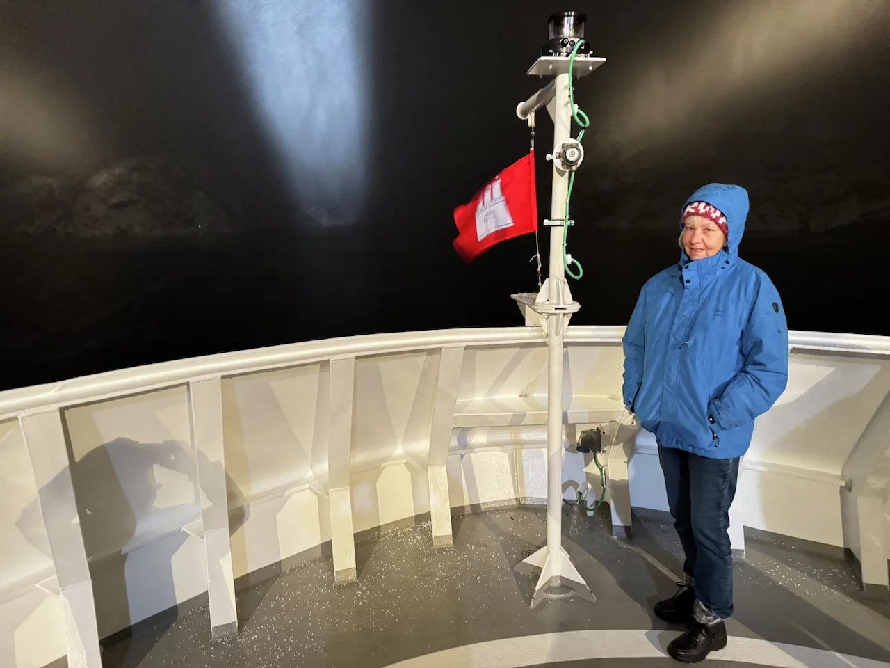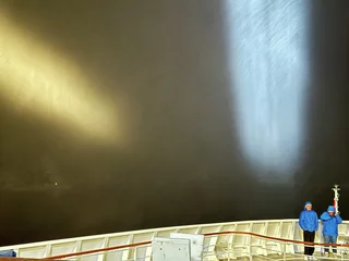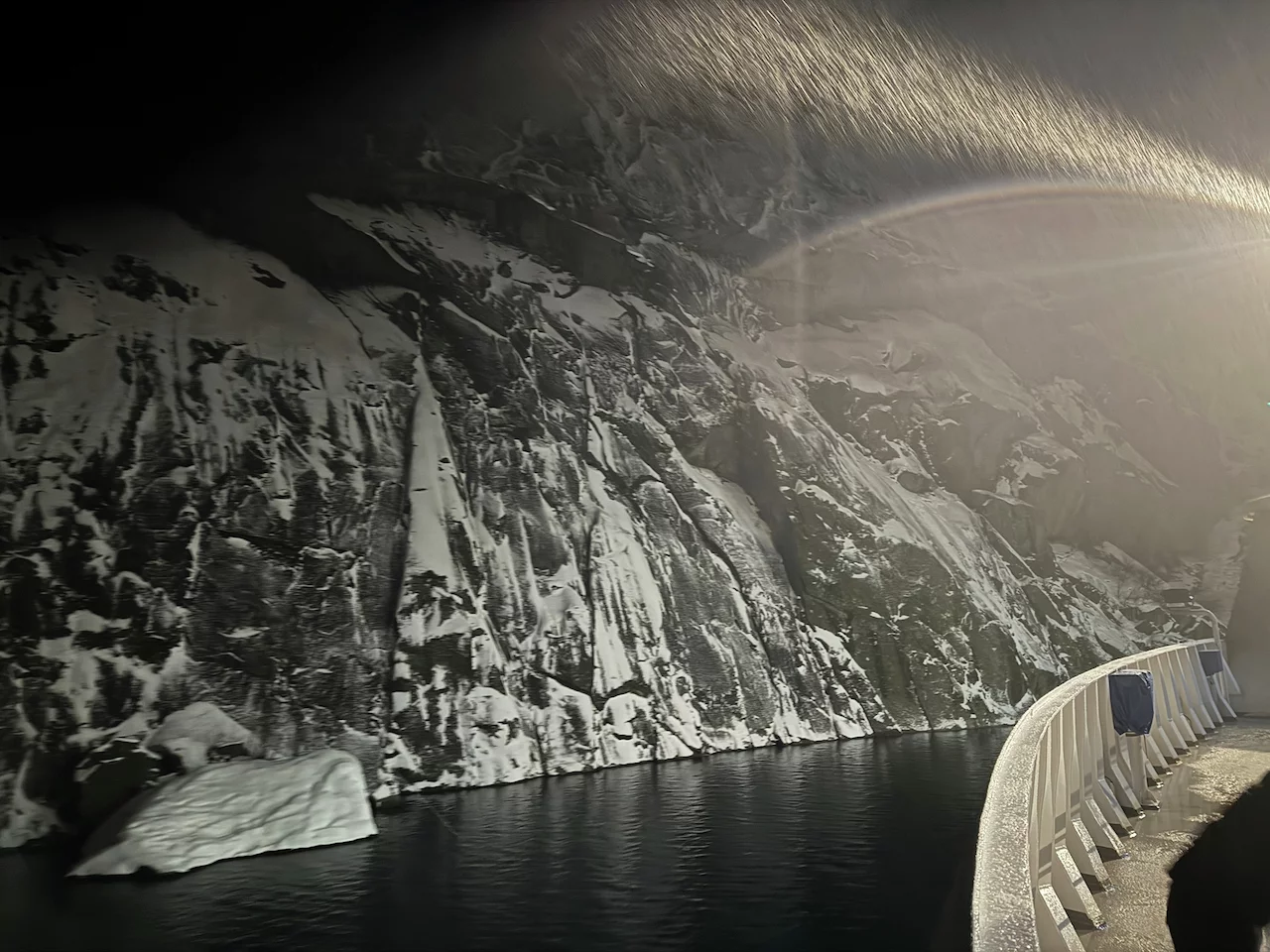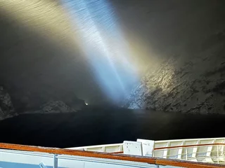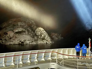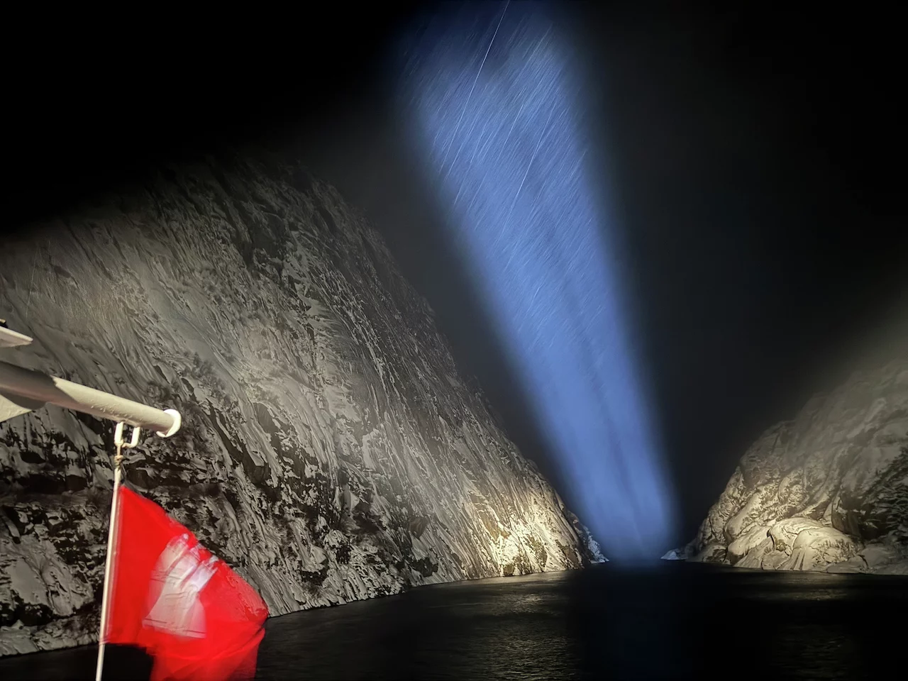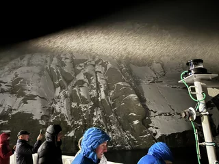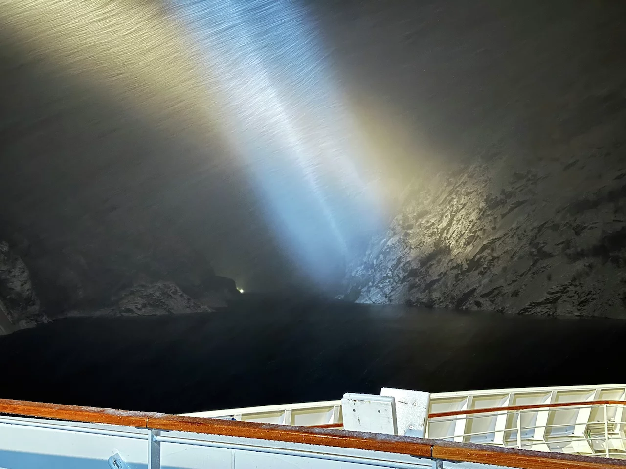 Langsam schob sich die Spirit dann auf den Fjordeingang zu. 60m maximal Breite am Anfang des Fjords sind nicht viel Platz bei möglichen Fallwinden und Schneegestöber. Je weiter der Bug sich an den Felswänden vorbei in den Fjord hinein schob, umso ruhiger wurde es auf dem Spirit Walk. Natürlich konnten wir die Höhe dieser spektakulären Felswände in der Dunkelheit nur erahnen. Doch die Drehung des Schiffes am Ende des Fjords um die Längsachse war spannend genug.