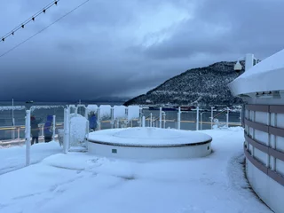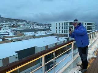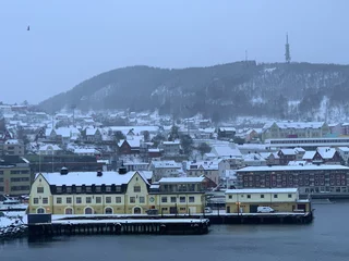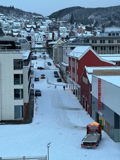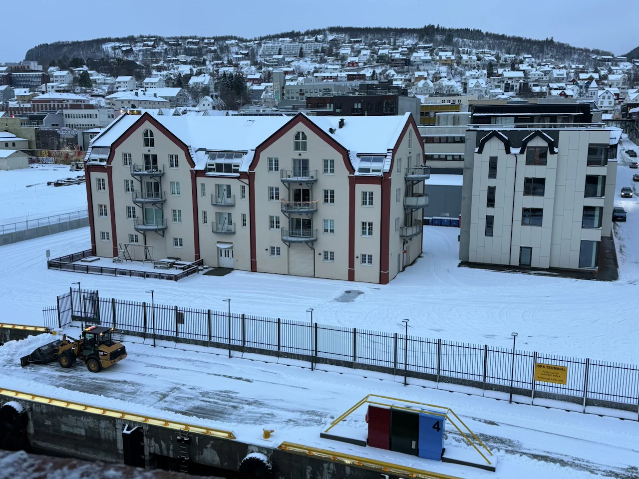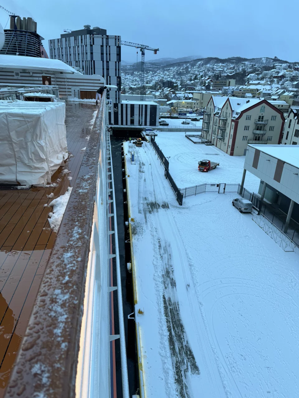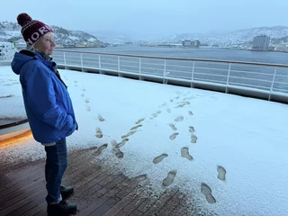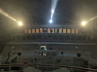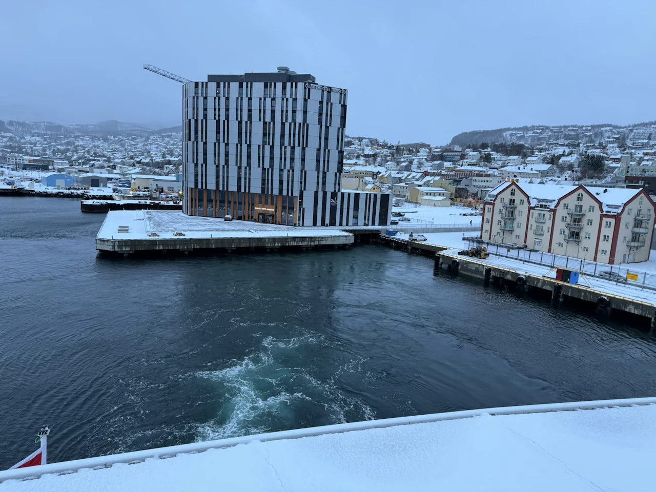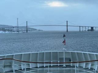 Harstad hätte sicherlich etwas mehr Liegezeit verdient gehabt. Doch für uns war es leider nur ein Ausweich- und Schutzhafen wegen des Sturms. Gegen 21:00 Uhr am Freitagabend haben wir dort angelegt. Doch bereits am Samstagmittag um 12:00 Uhr hieß es schon wieder Leinen los in Richtung Svolvaer auf den Lofoten. Aufgrund des verlängerten Arktis-Zaubers letzte Nacht haben wir es auch erst gegen 10:00 Uhr aus den Federn geschafft. Frühstück bis kurz vor 11:00 Uhr, da machte es wenig Sinn, bei den winterlichen Straßenverhältnissen nochmal in die Stadt zu laufen. Also haben wir uns warm angezogen und sind zum Ablegen auf die Außendecks gegangen.