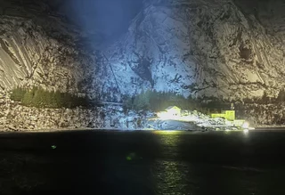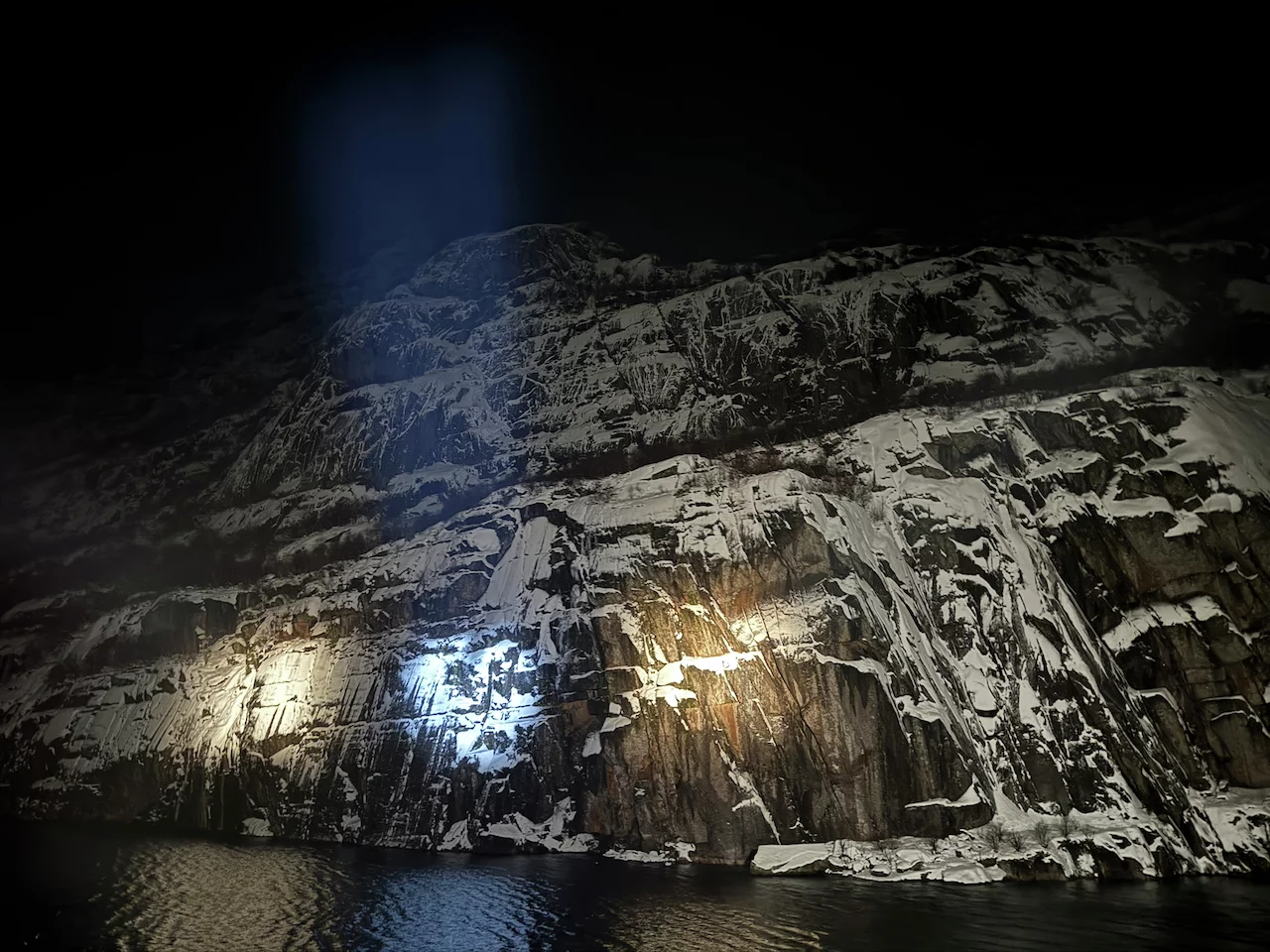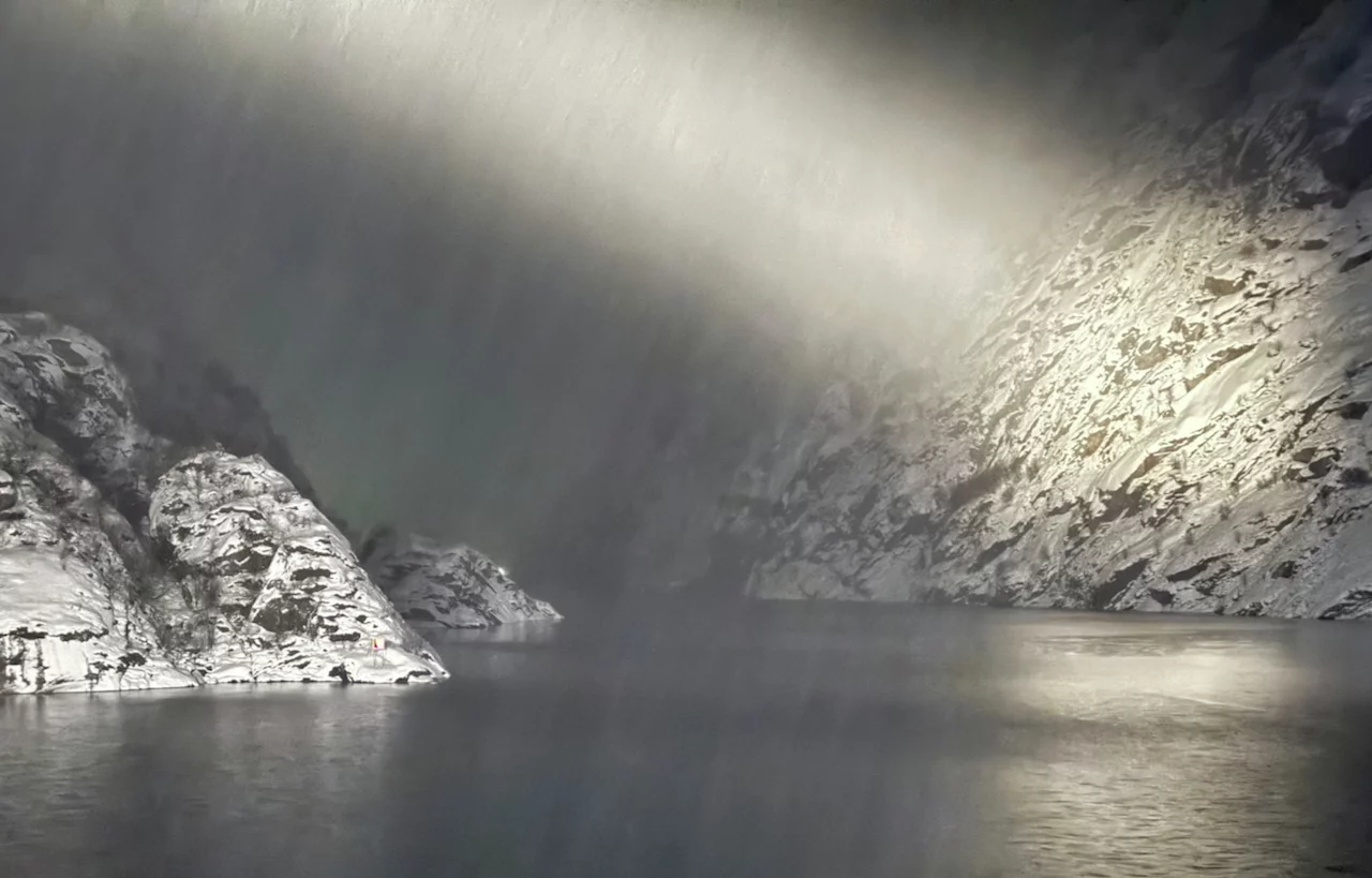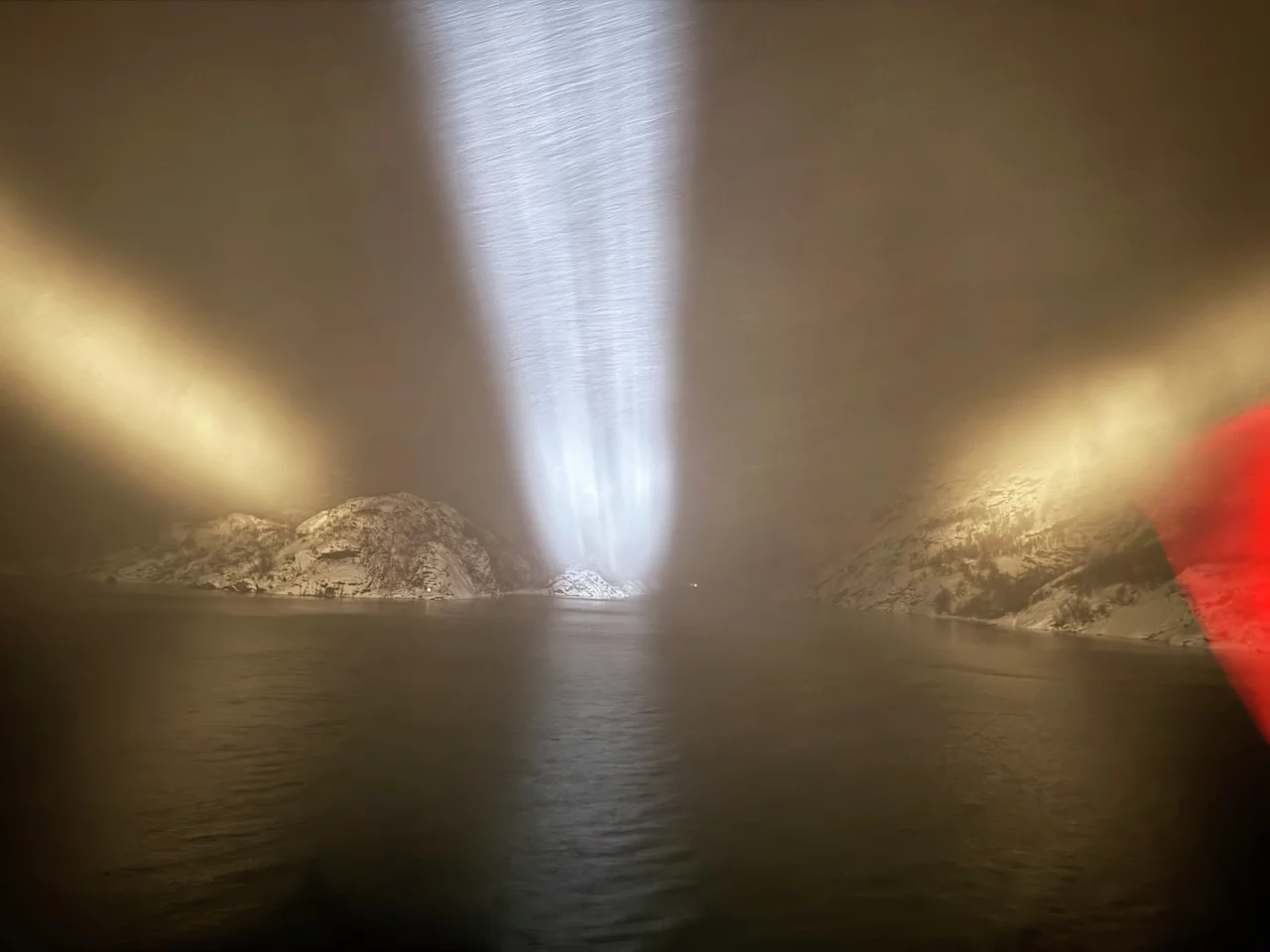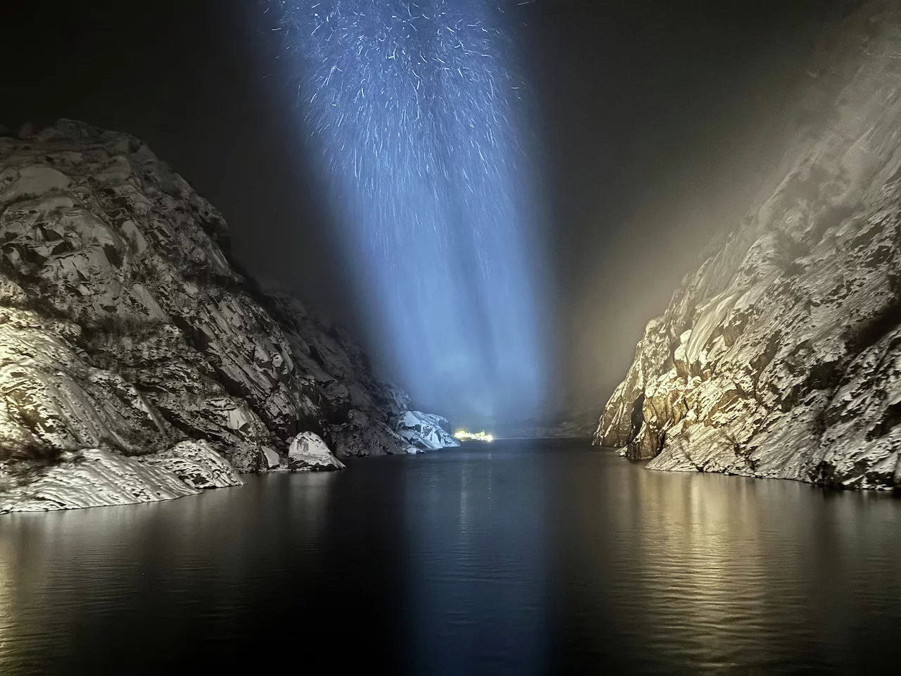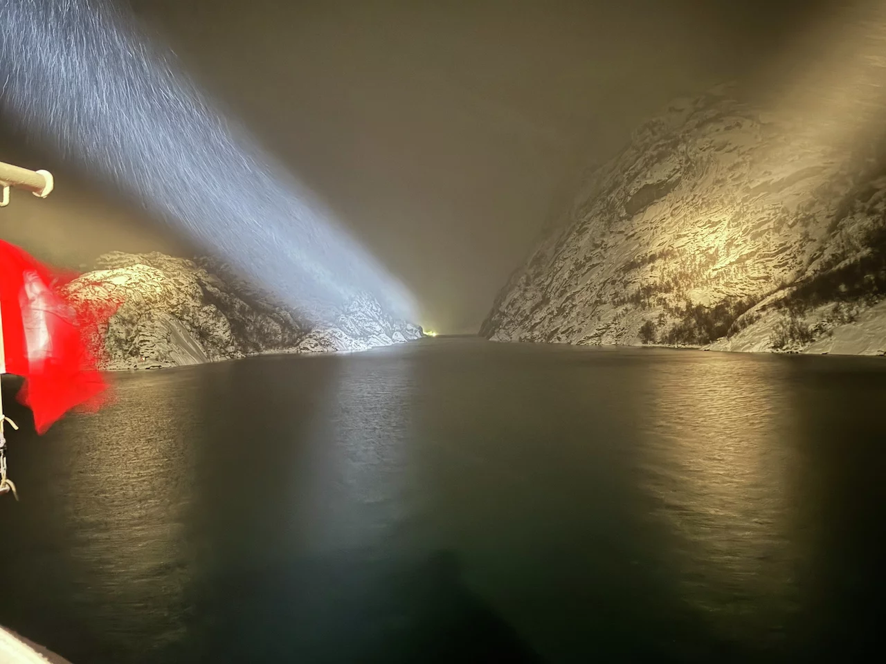 Die Freude war natürlich groß, aber mindestens genauso groß waren die Fragezeichen in unserem Kopf. Wir waren bereits 2x in diesem wunderschönen, aber in der Einfahrt extrem schmalen Fjord mit seinen 1000+ Meter hohen Felswänden. Das ist bei Tageslicht schon ein spektakuläres Unterfangen, geschweige dann bei Dunkelheit und dichtem Schneefall.