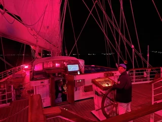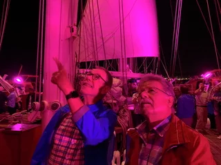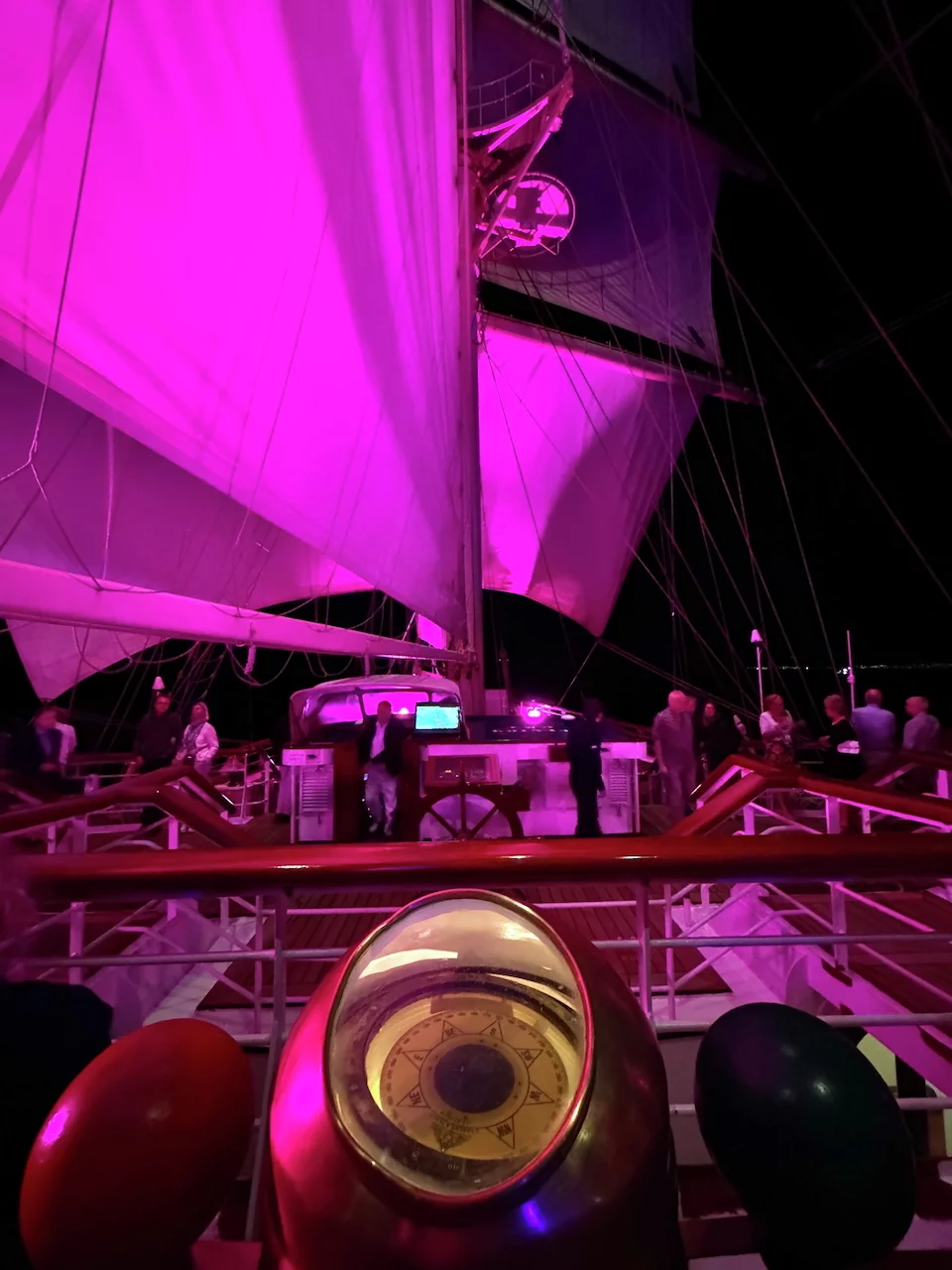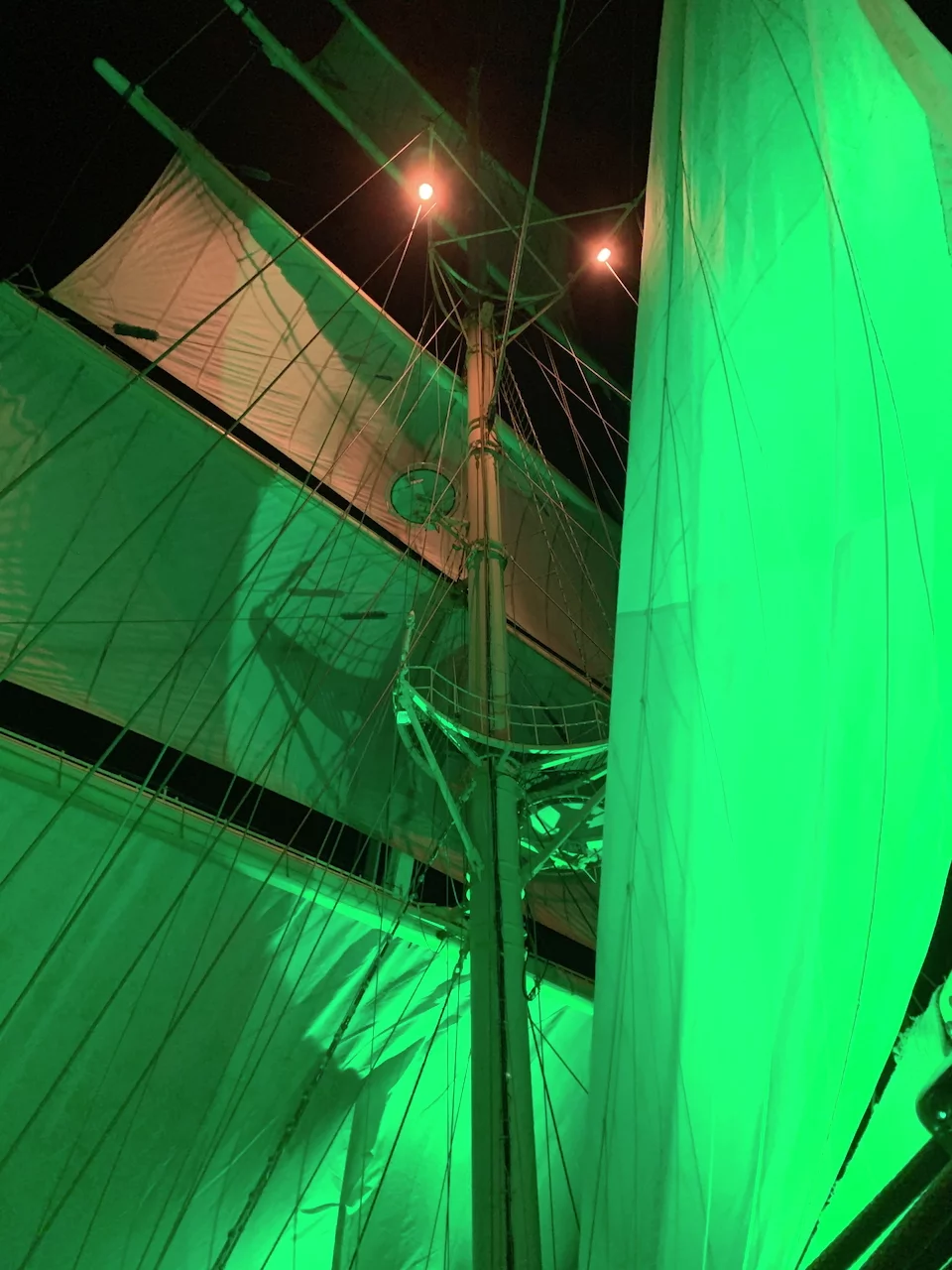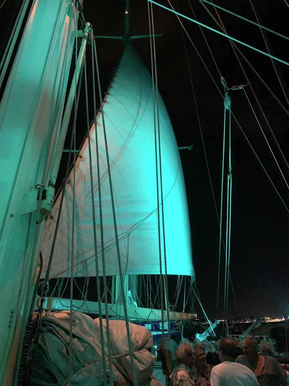 Kaum waren wir hinter der Hafenausfahrt, gingen die ersten Segel hoch und Vangelis mit "Conquest of Paradise" schallte aus den Lautsprechern. Ein echter Gänsehautmoment. Der wurde noch verstärkt durch die ständig wechselnden Farben, mit denen die Segel angestrahlt wurden. Natürlich gehörte zu diesem Prozedere auch ein leckeres Glas Champagner. Und zum ersten Mal waren wir schwer beeindruckt, auch ein wenig emotional "angefaßt" ob dieser Kulisse, auf einem Großsegler unterwegs.