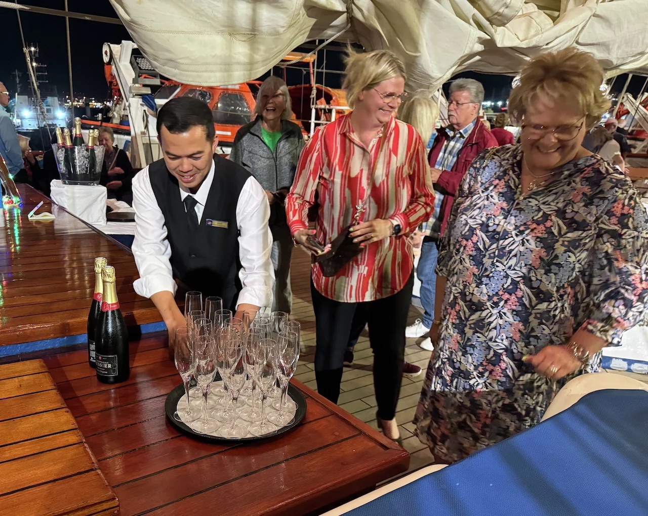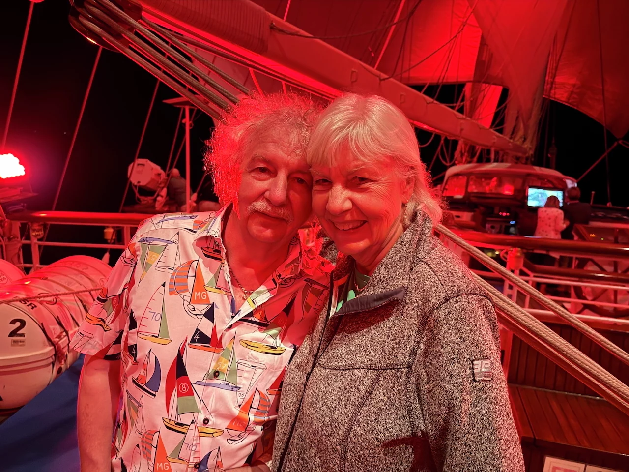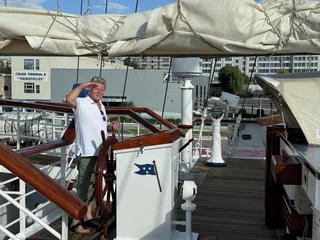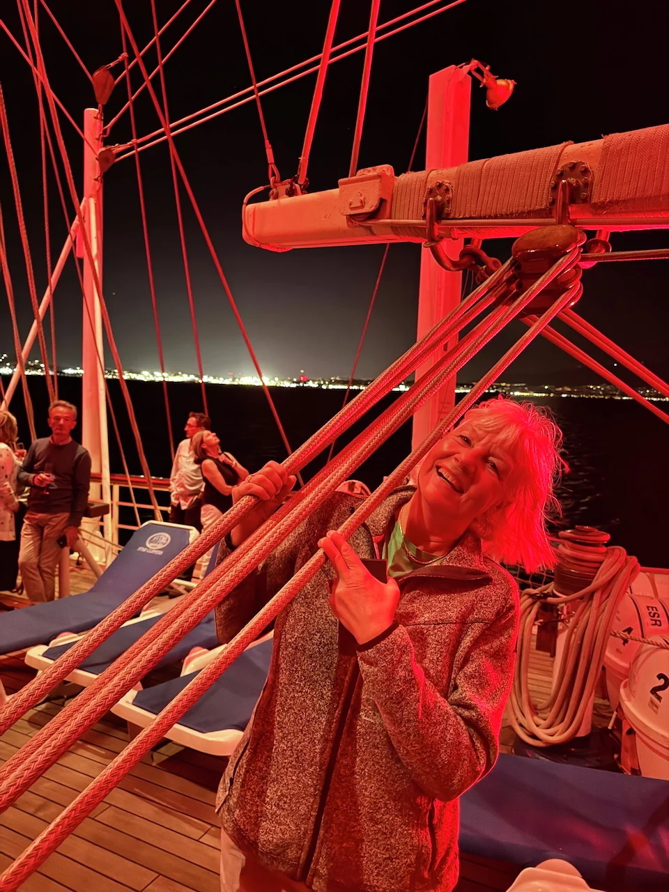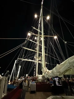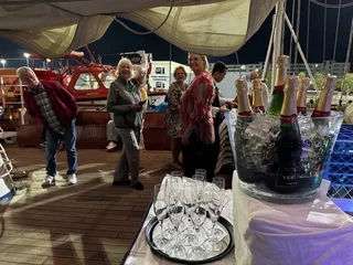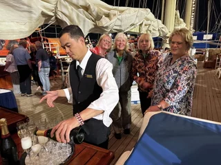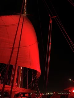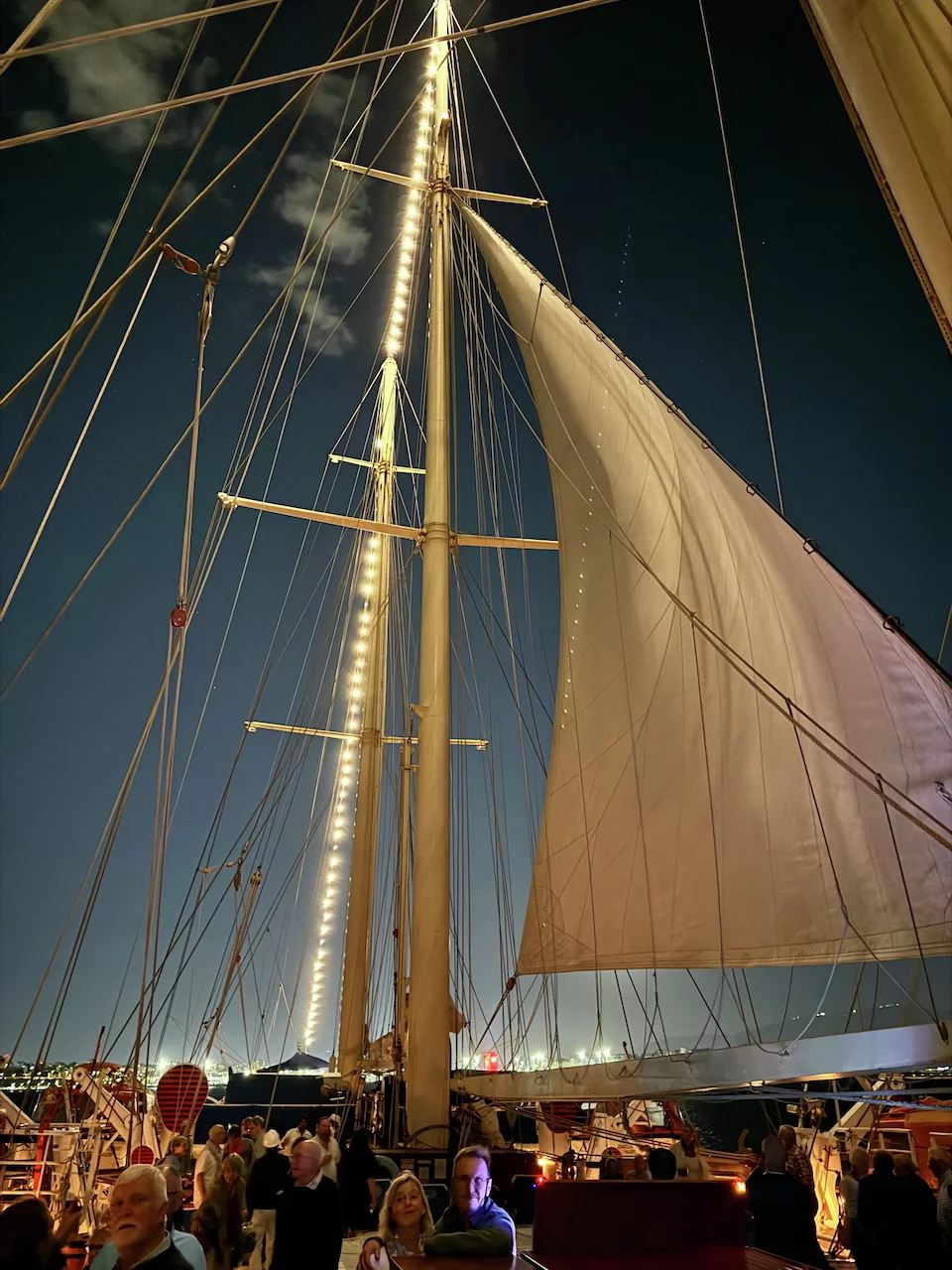 Kaum waren wir hinter der Hafenausfahrt, gingen die ersten Segel hoch und Vangelis mit "Conquest of Paradise" schallte aus den Lautsprechern. Ein echter Gänsehautmoment. Der wurde noch verstärkt durch die ständig wechselnden Farben, mit denen die Segel angestrahlt wurden. Natürlich gehörte zu diesem Prozedere auch ein leckeres Glas Champagner. Und zum ersten Mal waren wir schwer beeindruckt, auch ein wenig emotional "angefaßt" ob dieser Kulisse, auf einem Großsegler unterwegs.