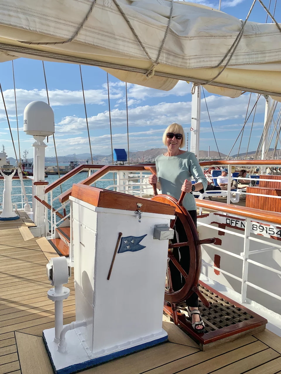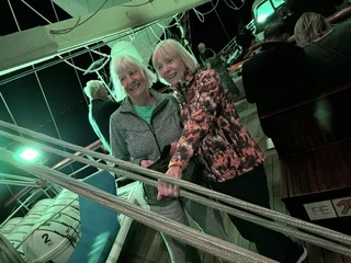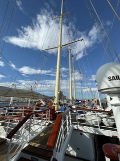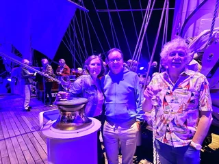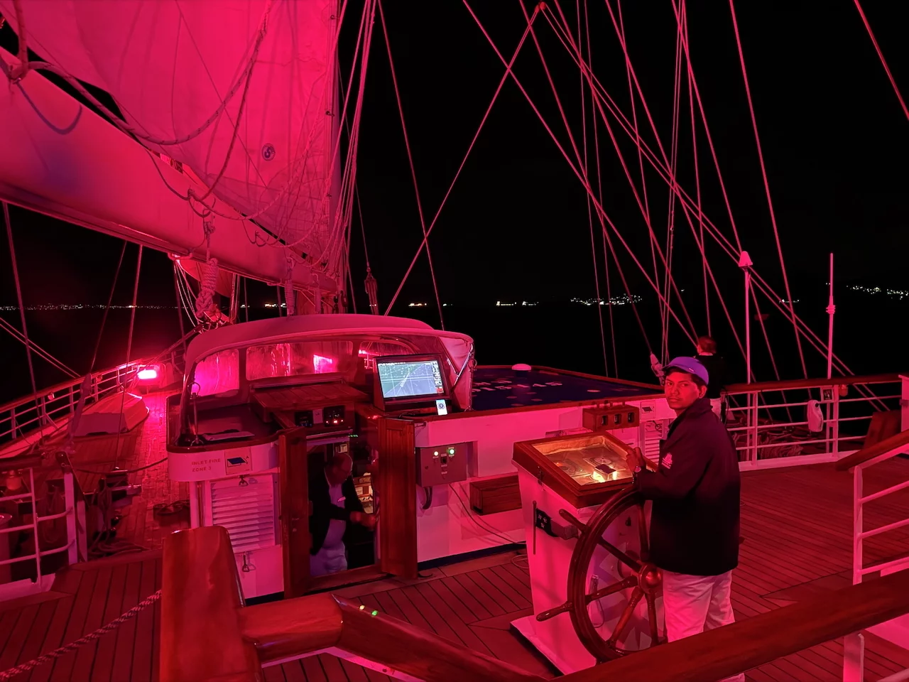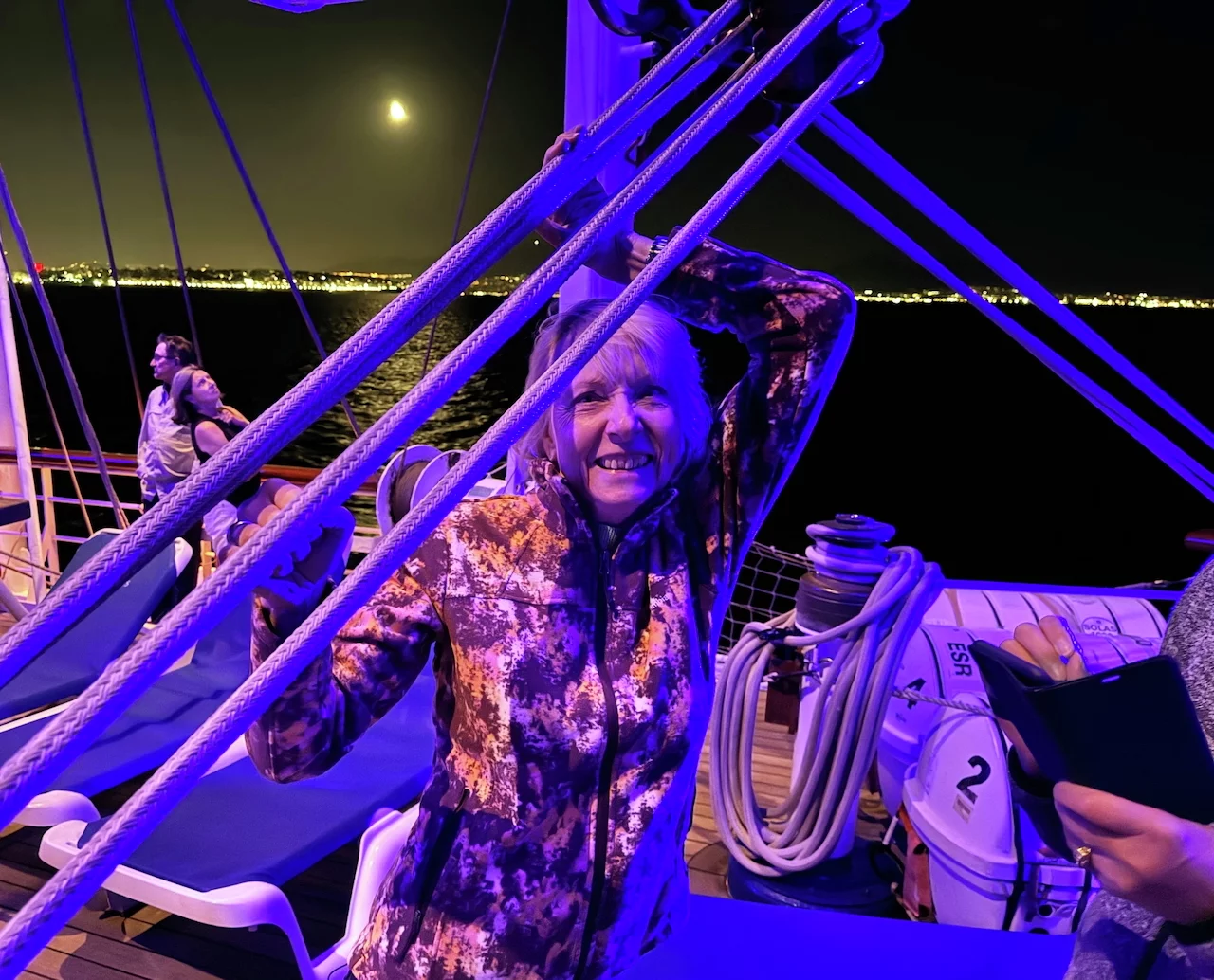 Kaum waren wir hinter der Hafenausfahrt, gingen die ersten Segel hoch und Vangelis mit "Conquest of Paradise" schallte aus den Lautsprechern. Ein echter Gänsehautmoment. Der wurde noch verstärkt durch die ständig wechselnden Farben, mit denen die Segel angestrahlt wurden. Natürlich gehörte zu diesem Prozedere auch ein leckeres Glas Champagner. Und zum ersten Mal waren wir schwer beeindruckt, auch ein wenig emotional "angefaßt" ob dieser Kulisse, auf einem Großsegler unterwegs.