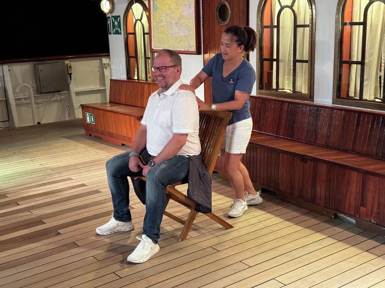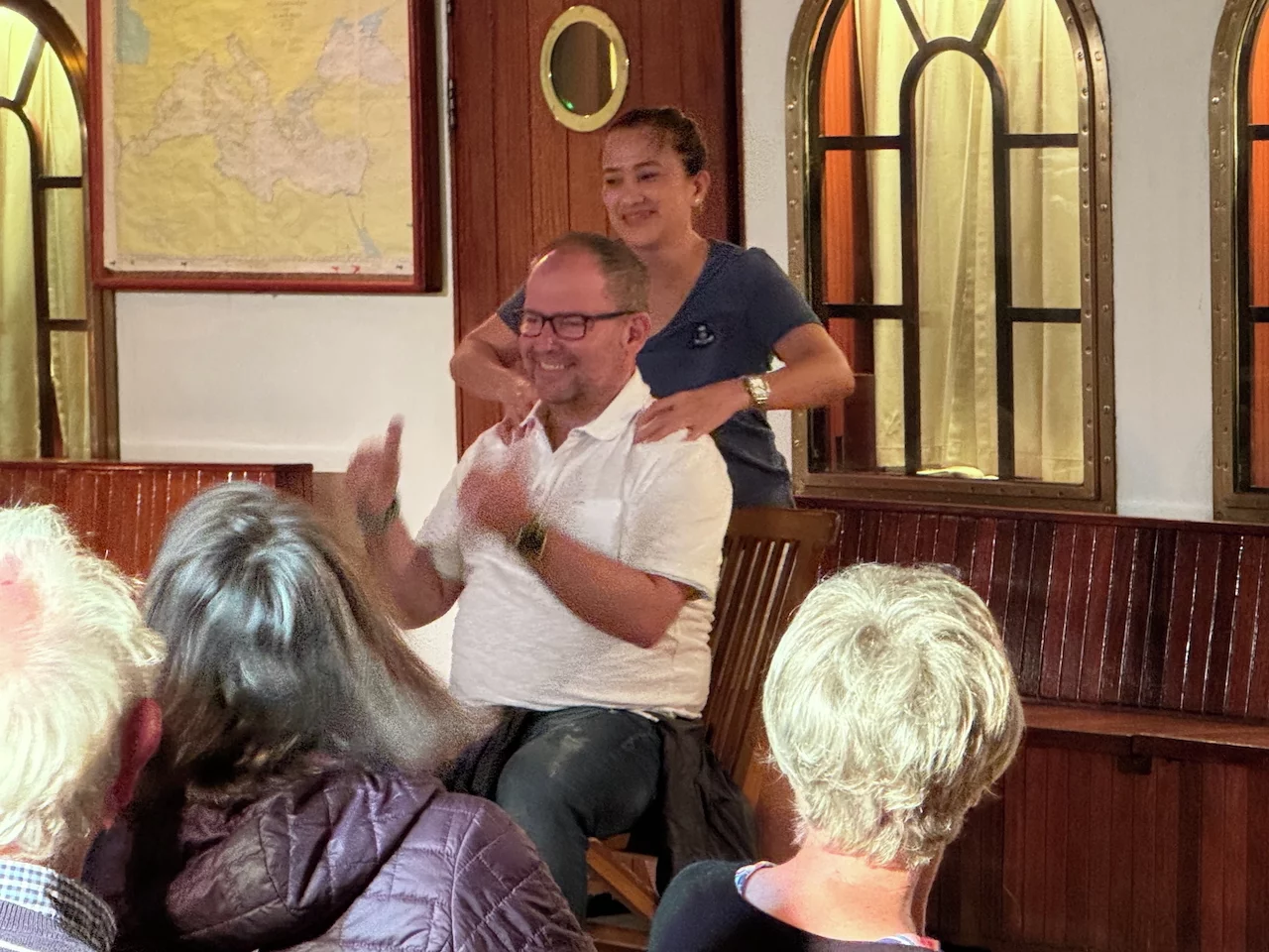 Nach dem Abendessen war in der Tropical Bar die Modenschau des “Sloop Shops” angesetzt. Als Models fungierten primär Crew-Mitglieder, es fanden sich aber auch ein paar Freiwillige unter den Passagieren. Unter anderem wurde dabei auch die Masseuse des Schiffs vorgestellt. Natürlich brauchte sie einen “Volontär” für eine kurze Demonstrationsmassage, doch so richtig fand sich niemand. Bis zu dem Moment als “Sir Andy” überraschend den Arm des vor ihm stehenden Peter nahm und kurz in die Höhe hob. Cruise-Manager und Moderator Axel hat diese schnelle Bewegung sofort gesehen und schon saß der gute Peter vor dem “Publikum” auf einem Stuhl und erhielt eine kurze Nacken/Schultermassage. Seinem Gesichtsausdruck nach hat es ihm aber wohl gefallen.