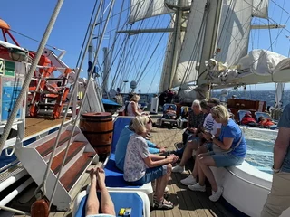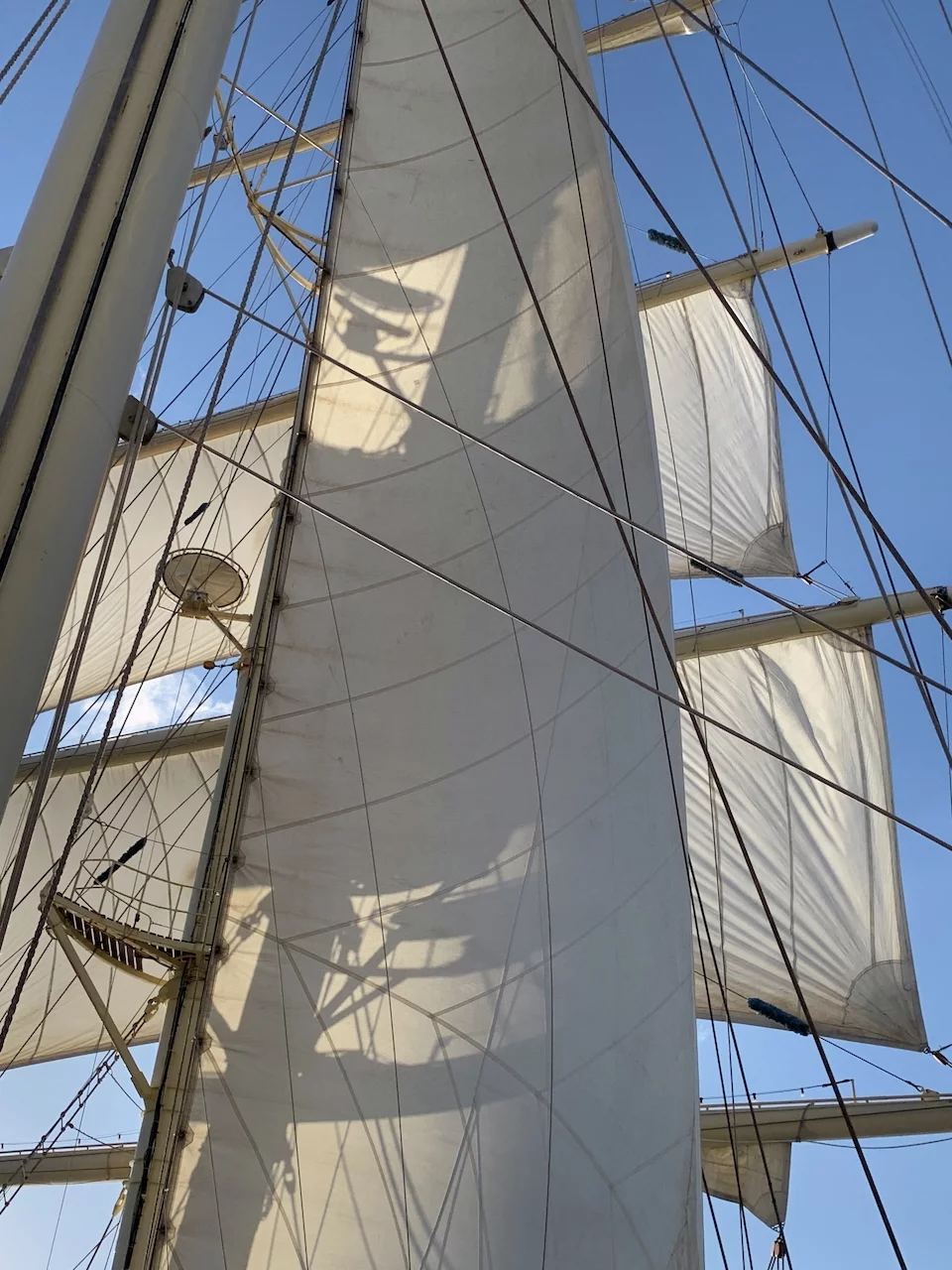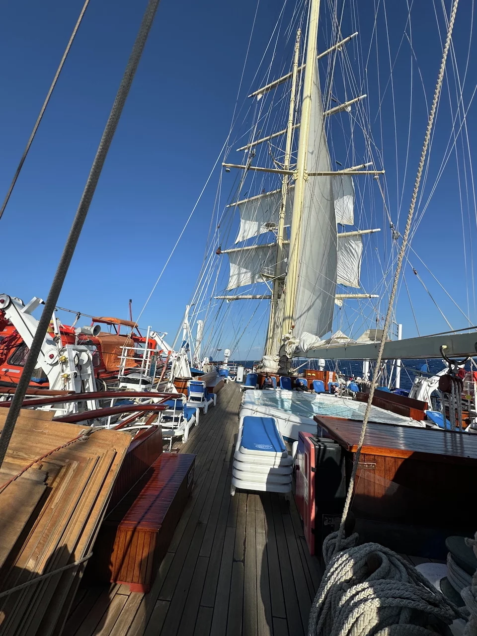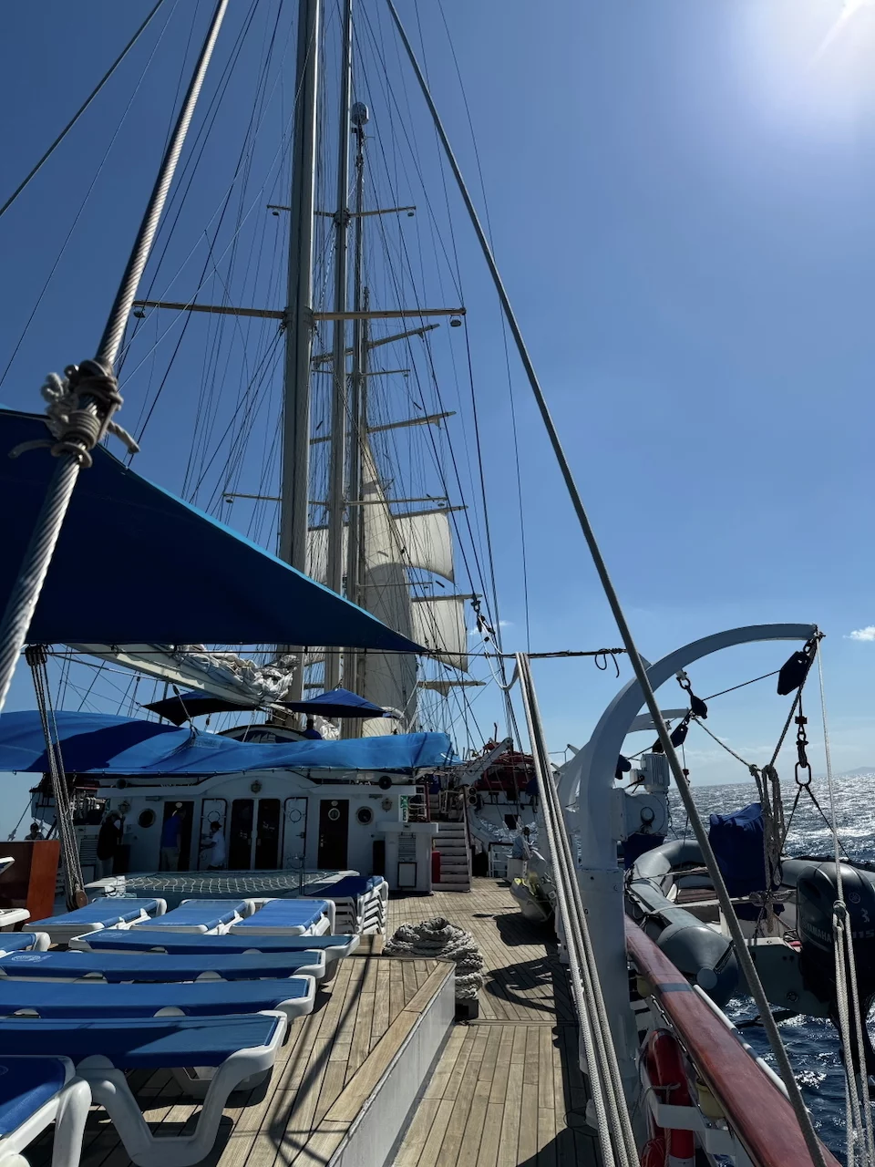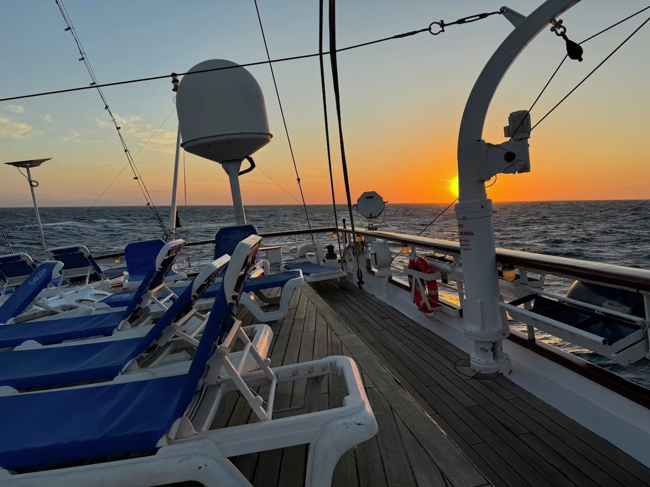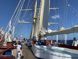 Der Seetag entwickelte sich nicht ganz so wie wir uns das vorgestellt haben. Bereits in der Nacht hatten Wind und Seegang erheblich zugenommen und die Star Clipper lag laut Kapitän permanent mit einer Krängung (Schräglage für Landratten) zwischen 7% - 10% im Wasser und “turnte” über die Wellen.