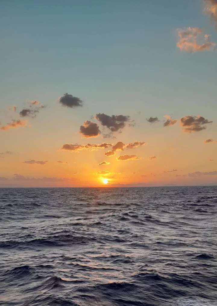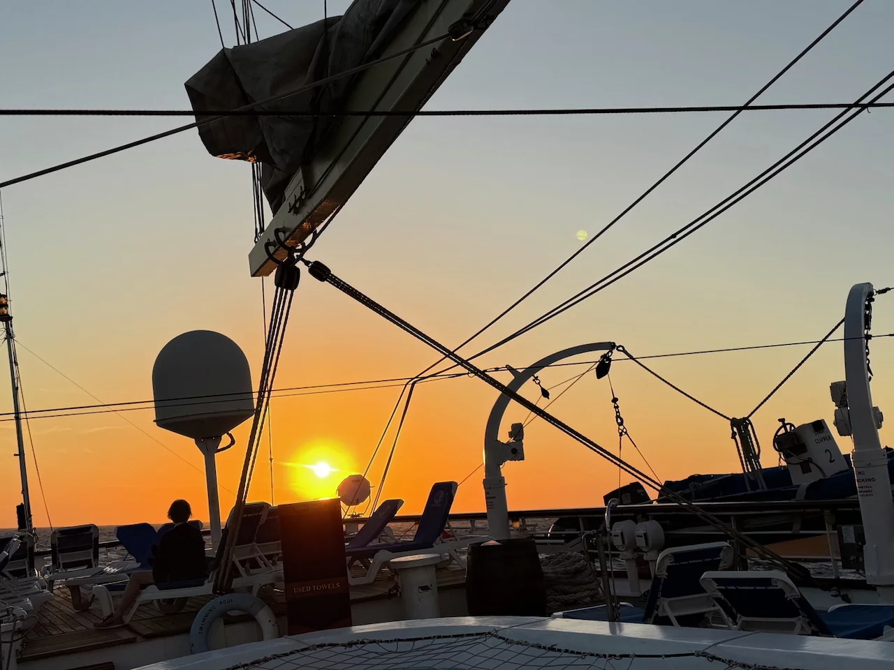 Gegen Abend kamen wir dann endlich in den Schutz verschiedener Inseln, Wind und Wellen milderten sich deutlich ab und wir konnten uns wieder halbwegs normal auf dem Schiff bewegen. Somit war es auch ohne Probleme möglich, den wunderbaren Sonnenuntergang vom hinteren Sonnendeck zu beobachten.